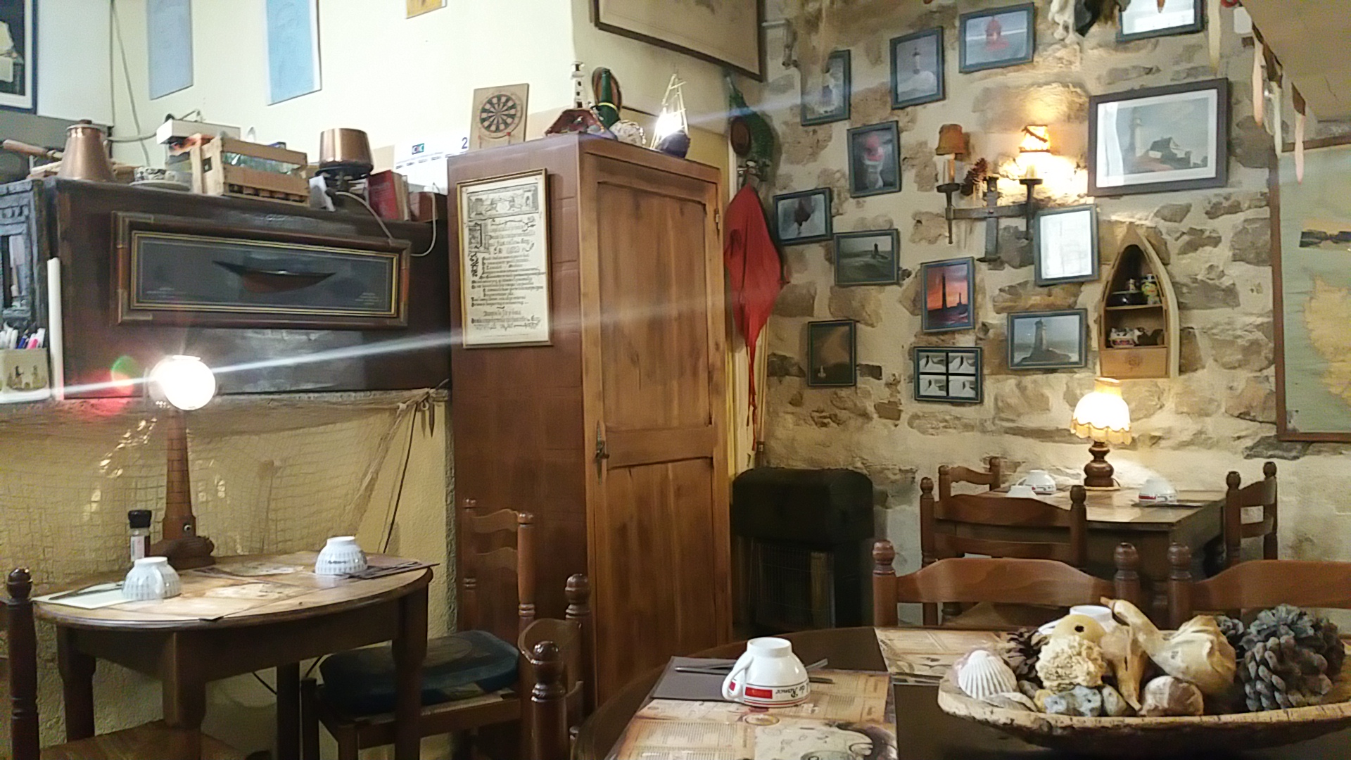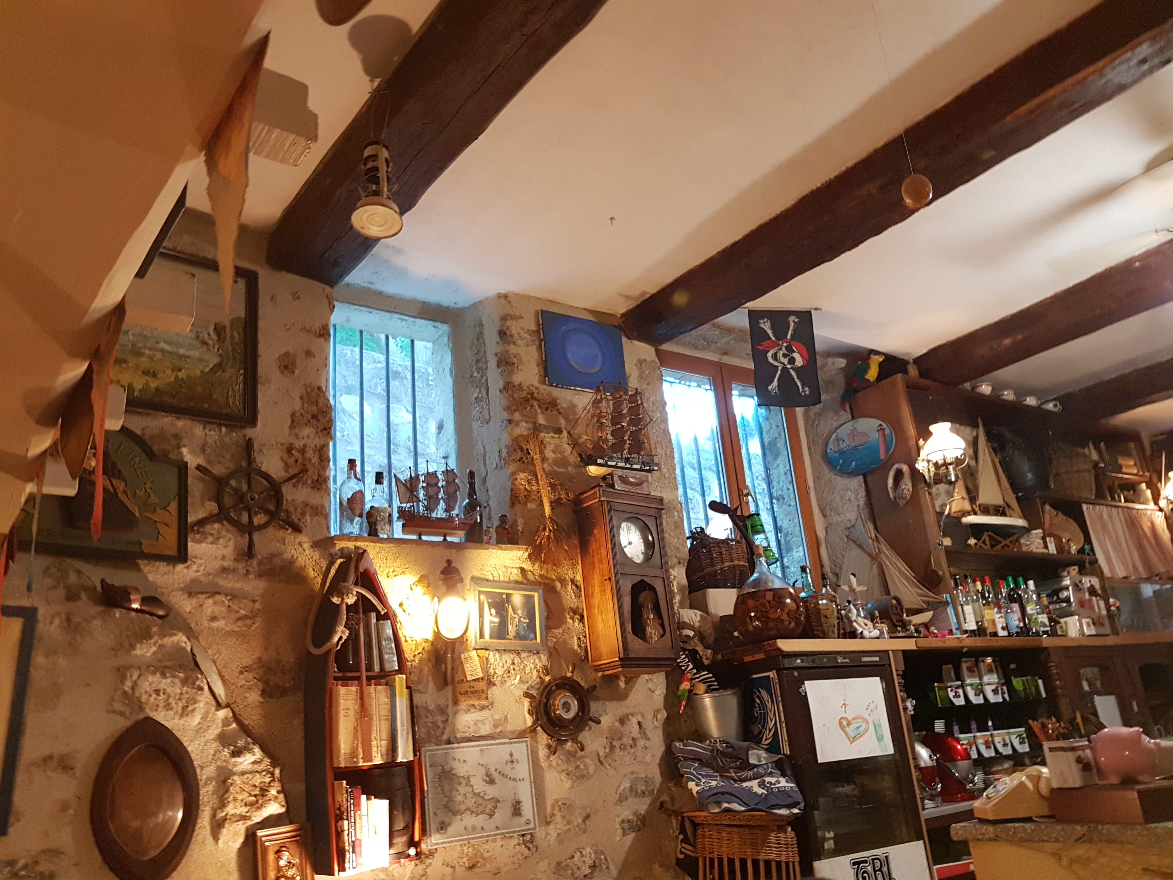 Je qualifierai cet atypique restaurant d insolite par sa décoration et nombreux objets collectionnés. On y mange et boit bien, des bières de bretagne au cidre C est cohérent dans le choix de la prestation. Et bravo pour les costumes qui vous plonge dans une ambiance maritime détendue. C est osé de proposer ce type de cuisine dans l Hérault.
