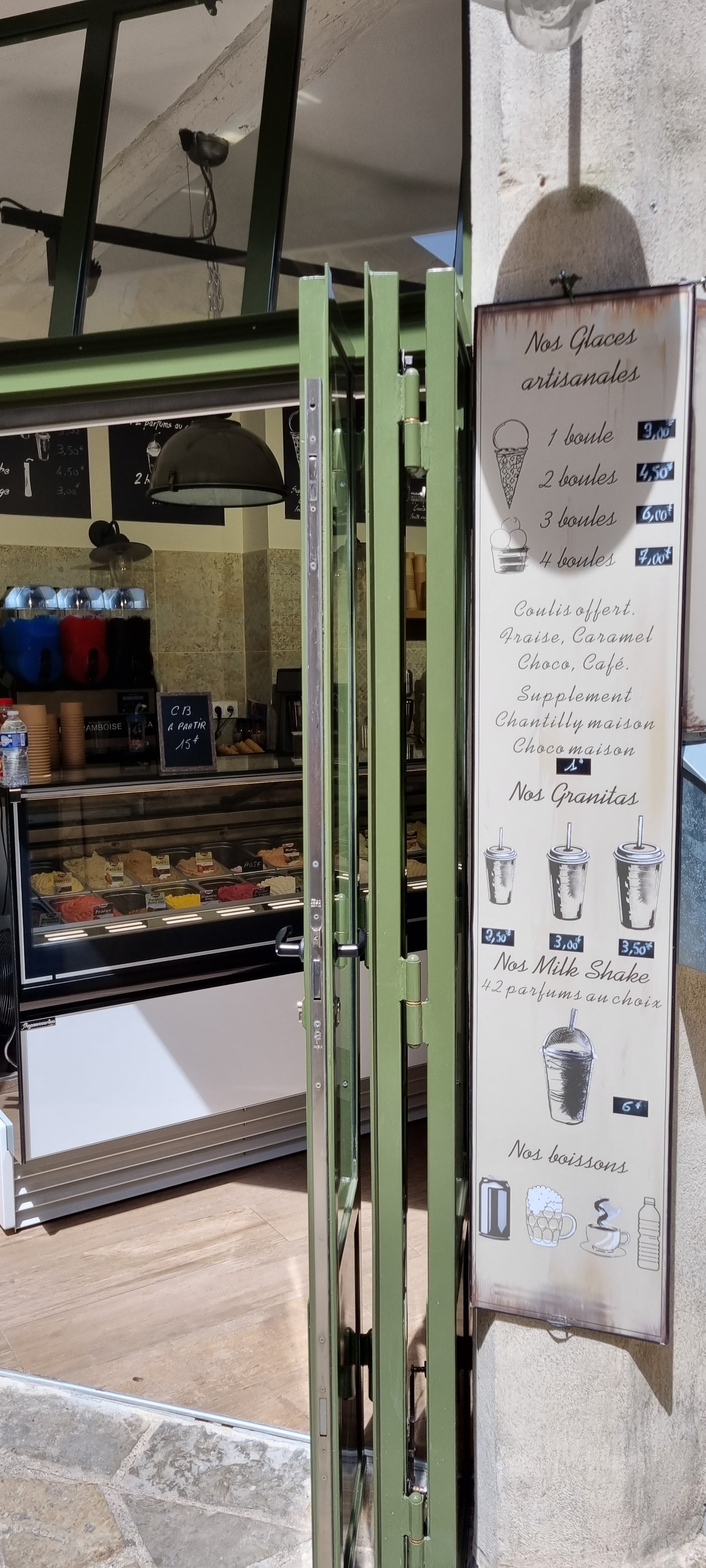 C’est un bon glacier. Avec 5 euros, vous avez 3 boules. Il y a beaucoup de parfums à choisir.