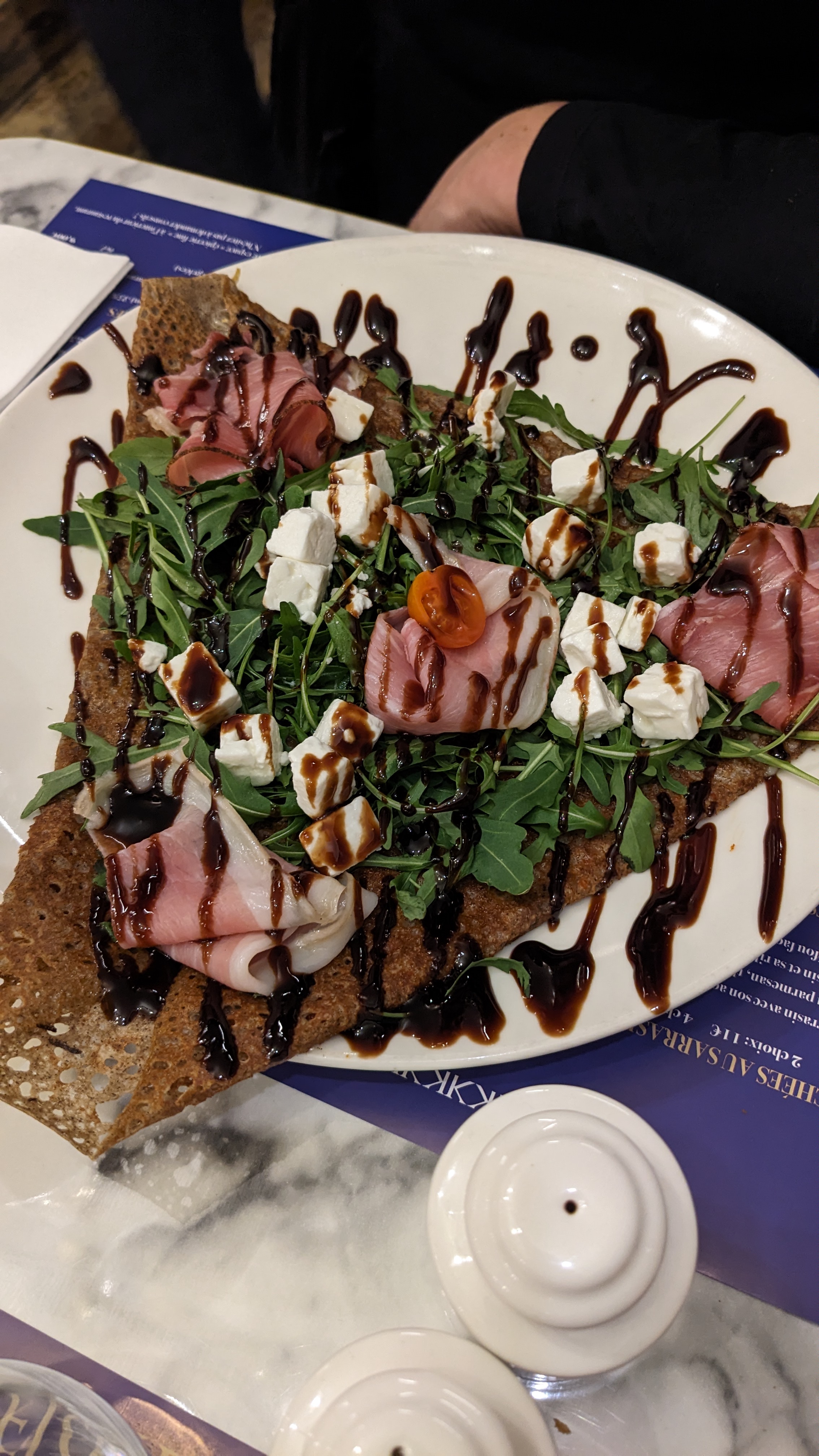 Galette Gorgonzola, Poire, lard fumé, noix et mâche. Super adresse 🥰