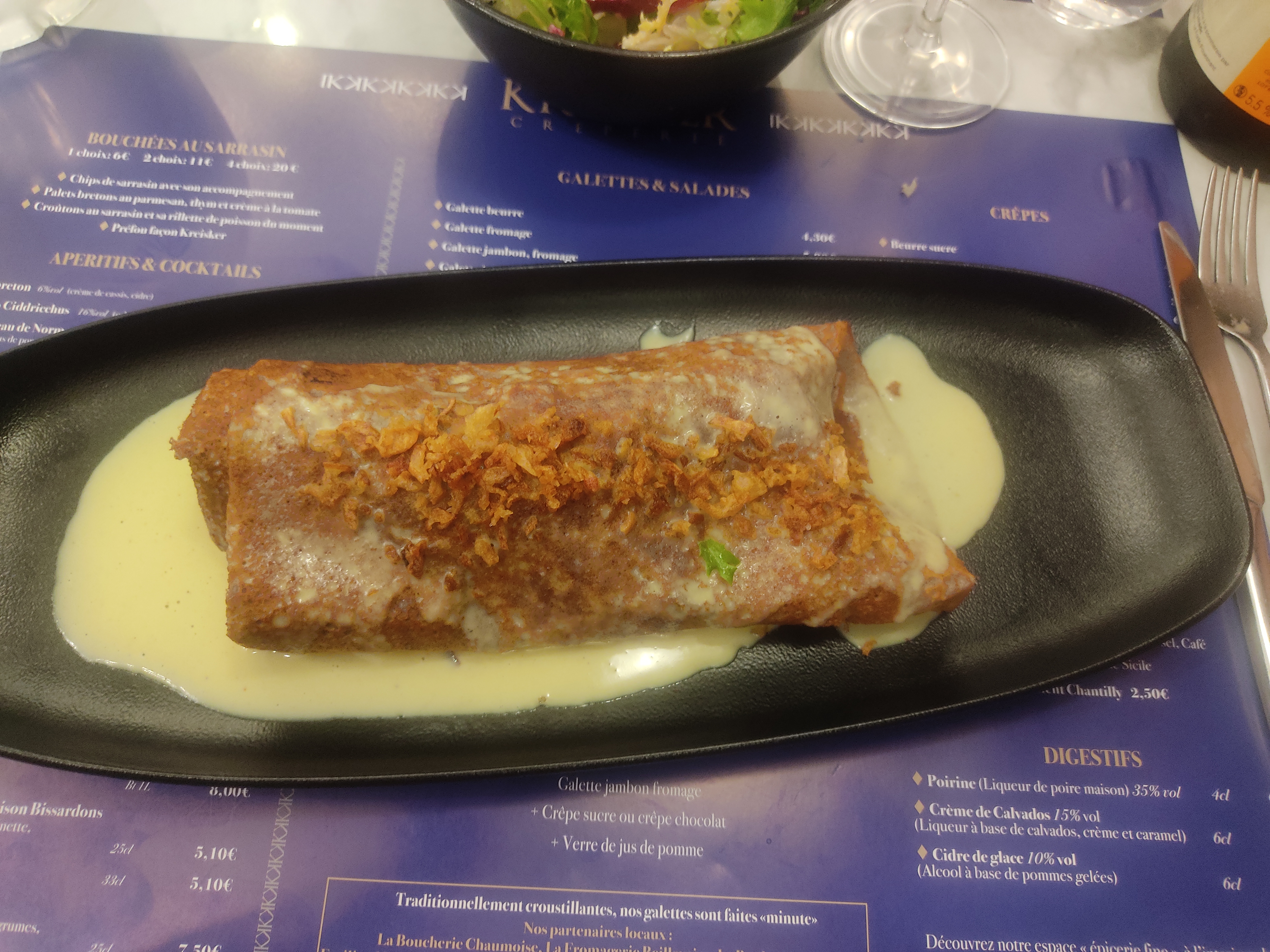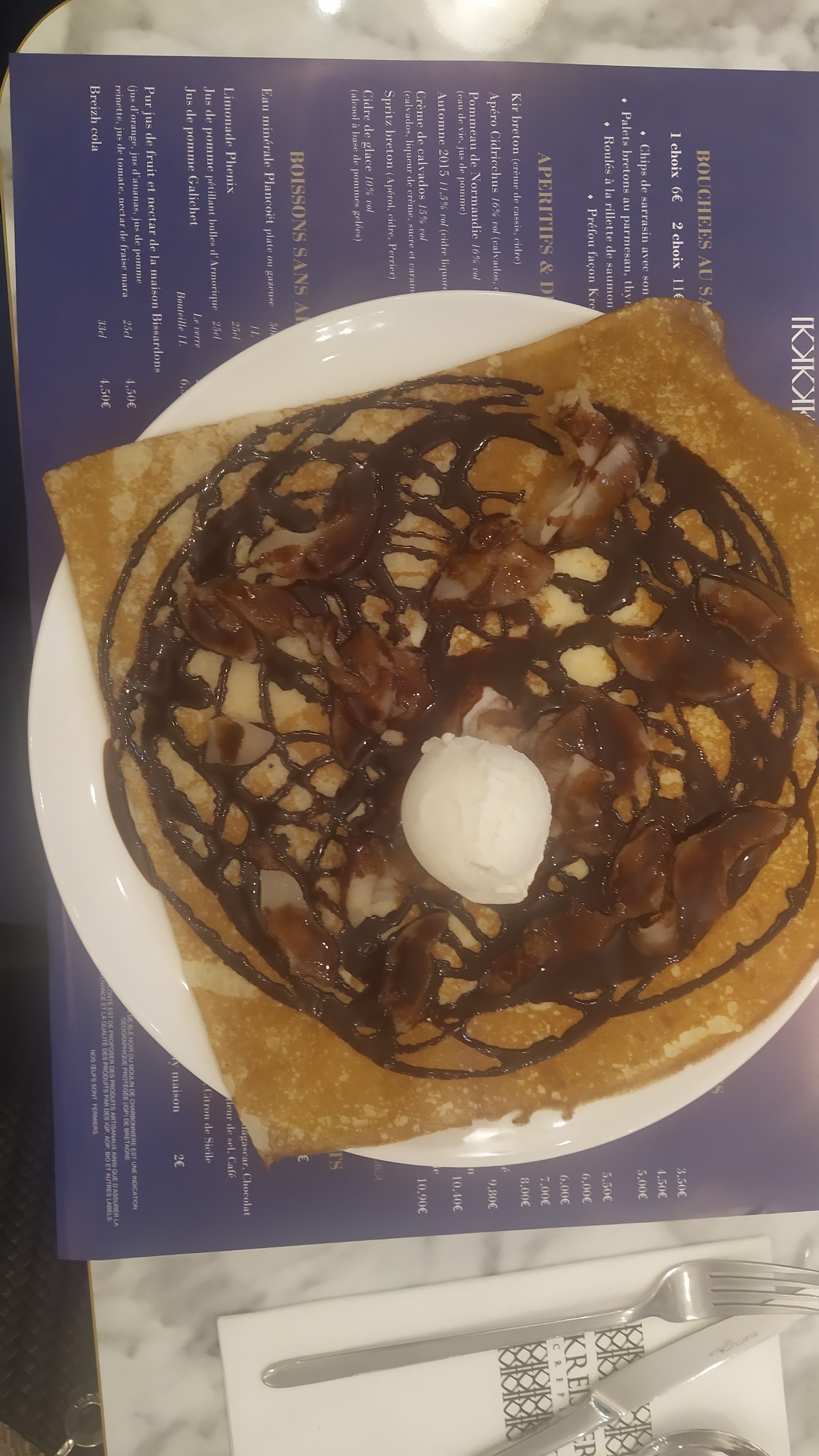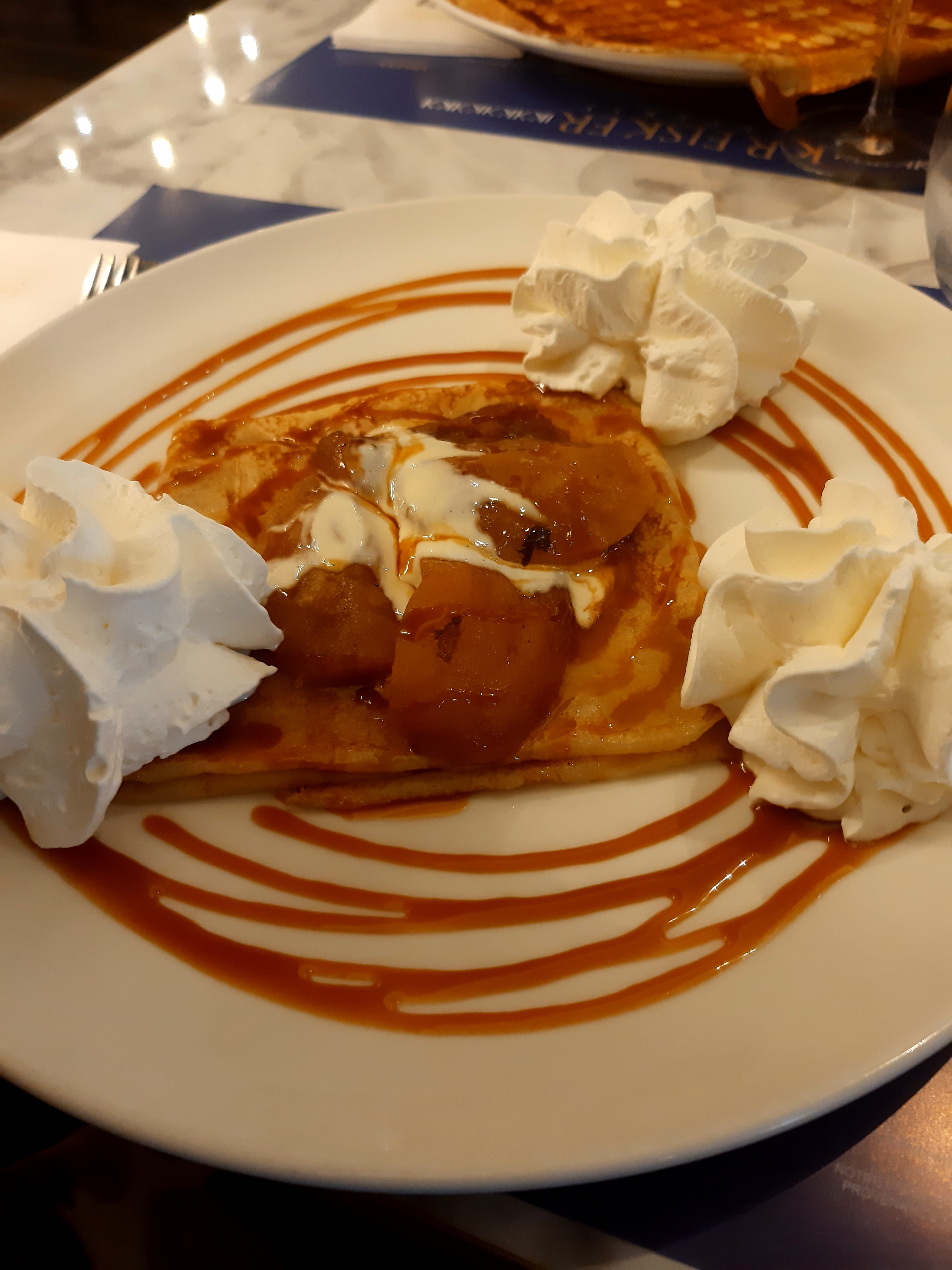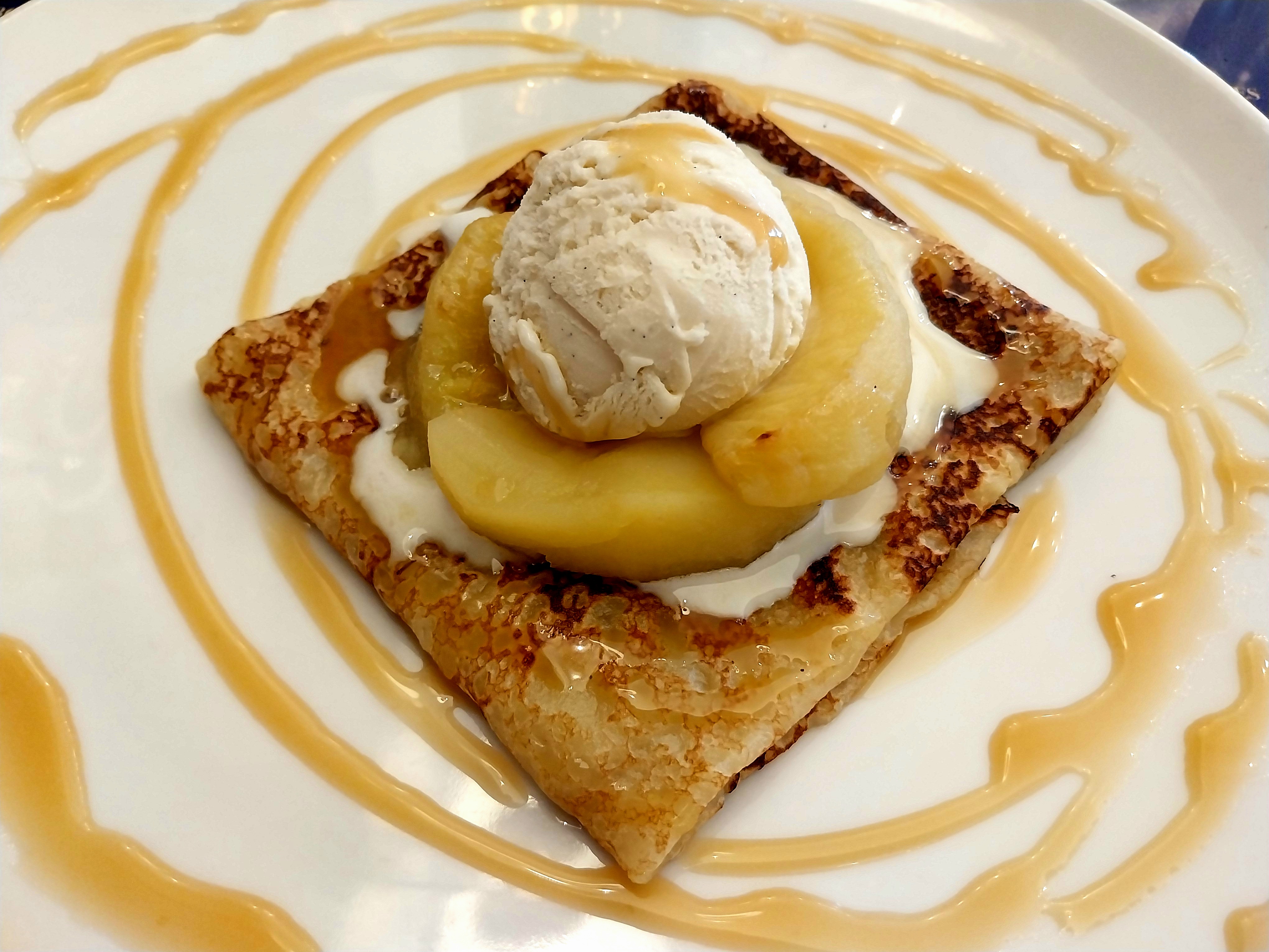 Bonne galette mais servie pas assez chaude (tiède) Crêpe beurre salé avec pommes caméralisées excellente très bonne qualité prix
