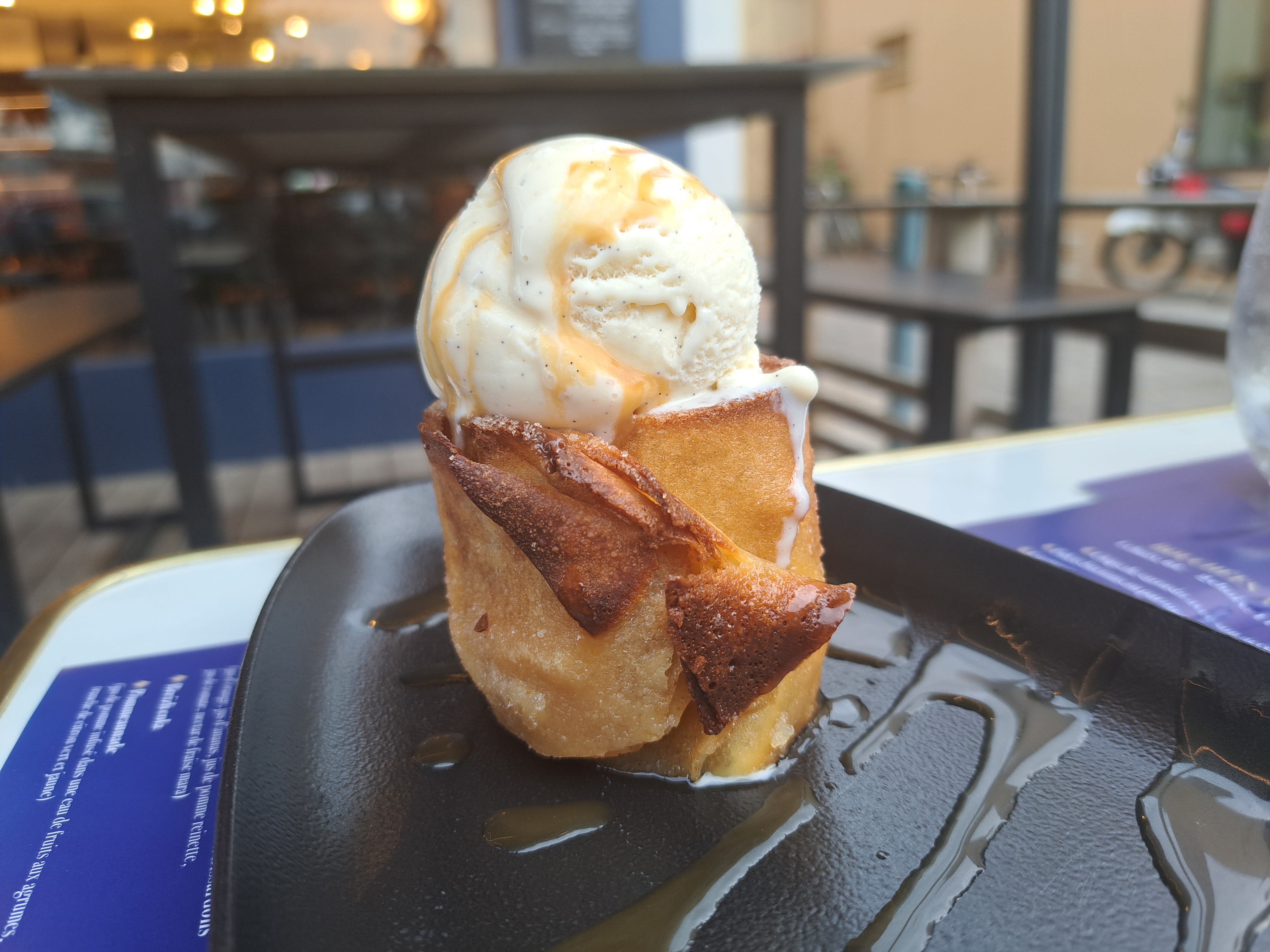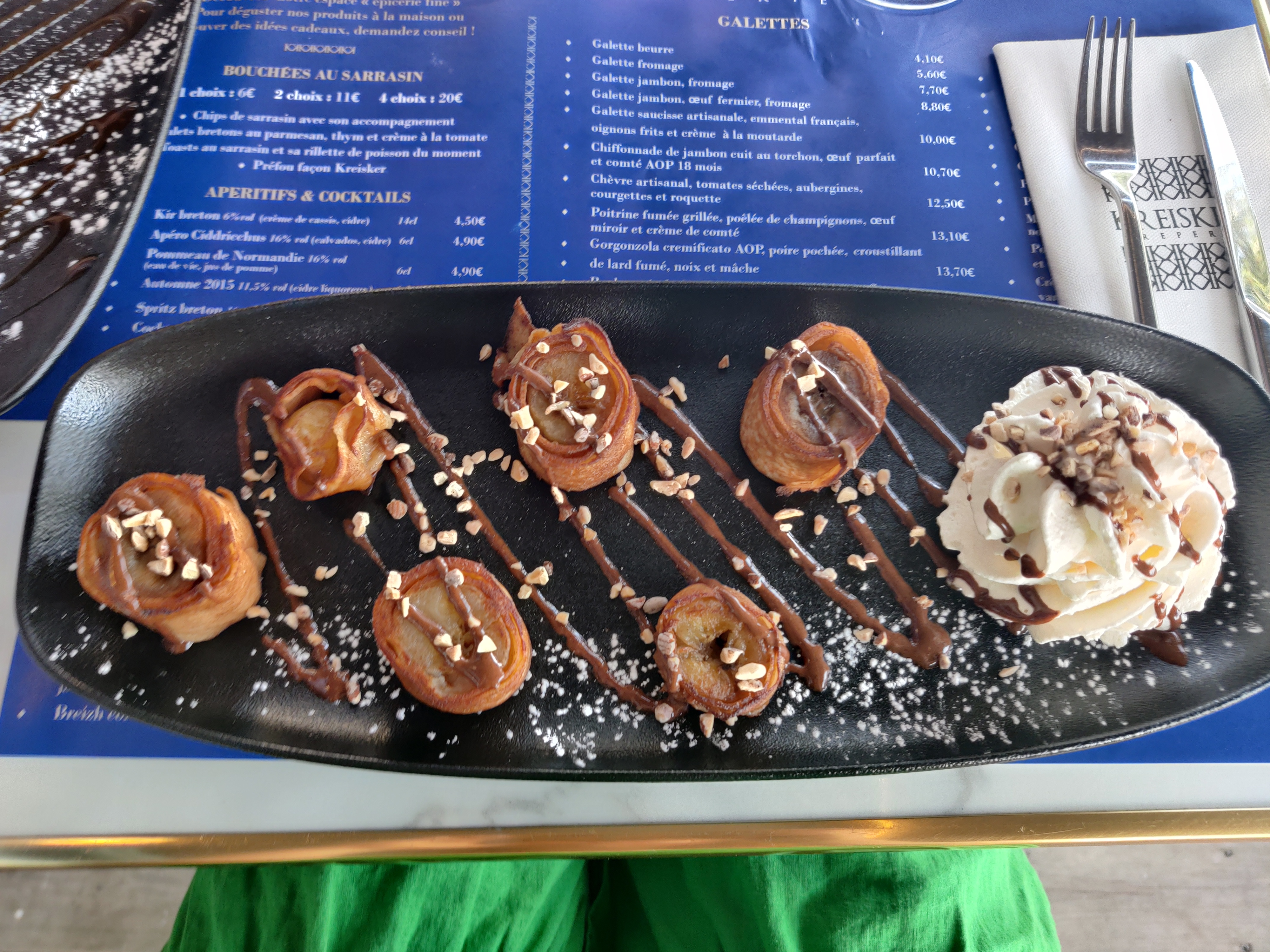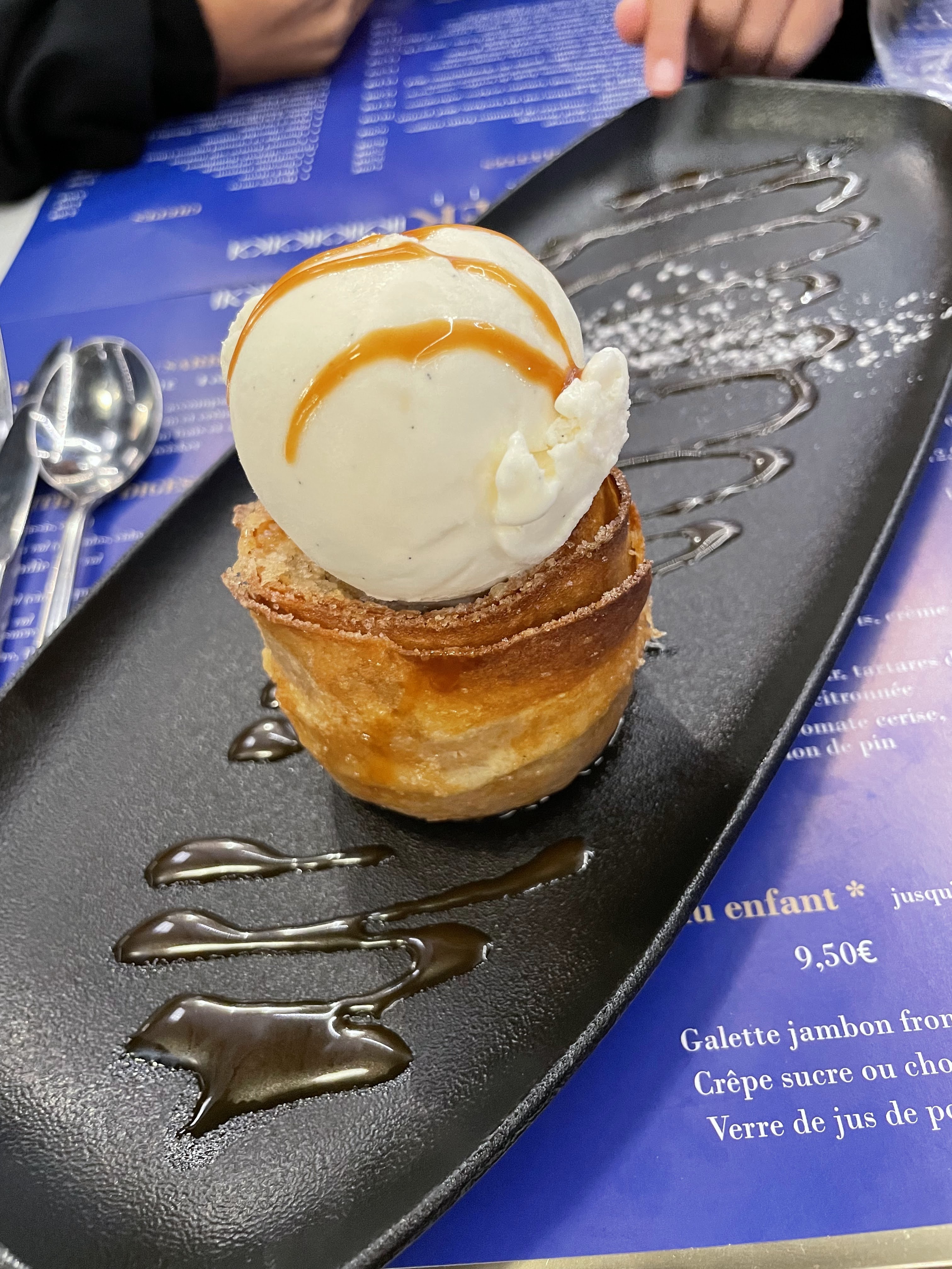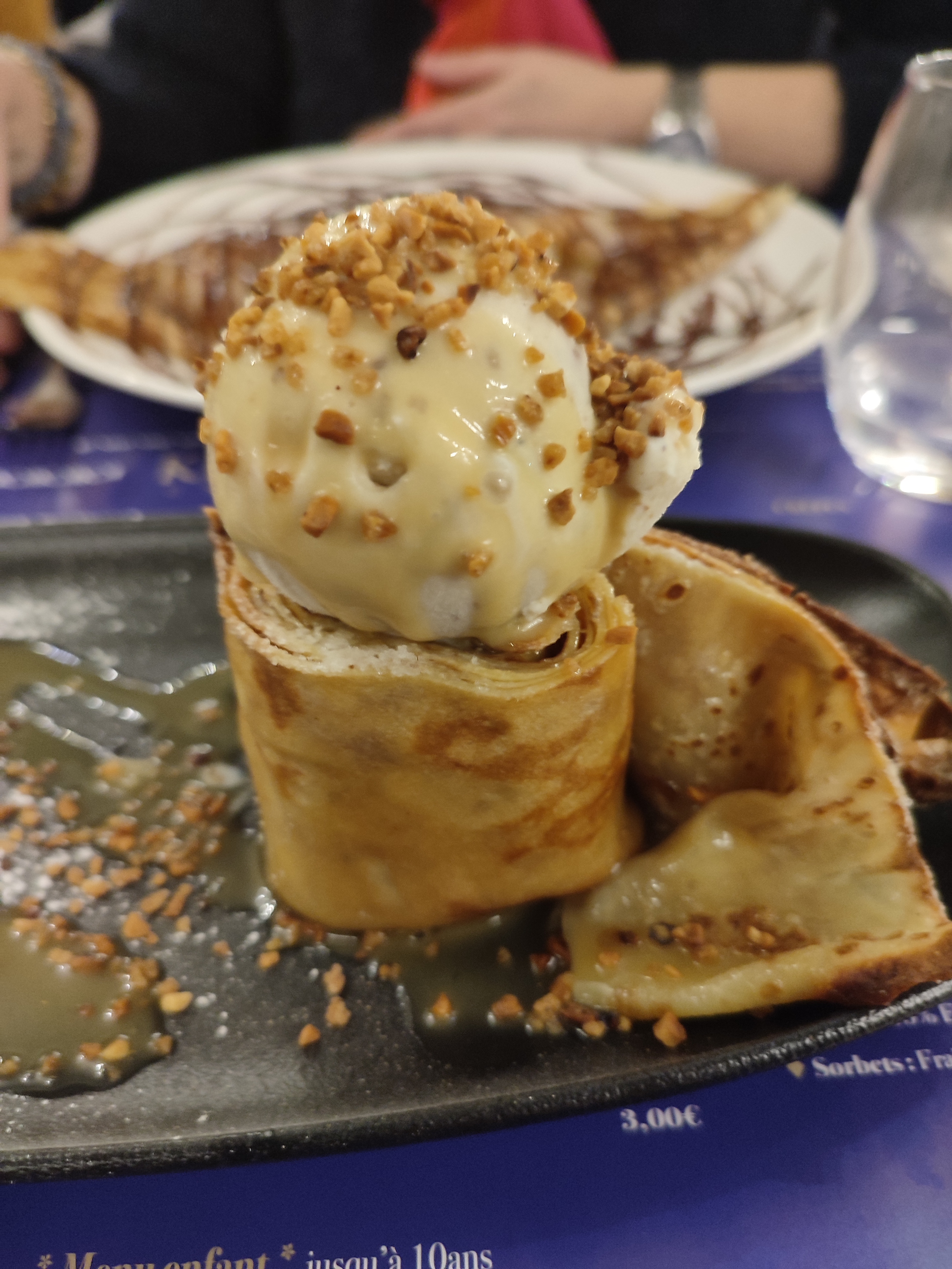 Bonne galette mais servie pas assez chaude (tiède) Crêpe beurre salé avec pommes caméralisées excellente très bonne qualité prix