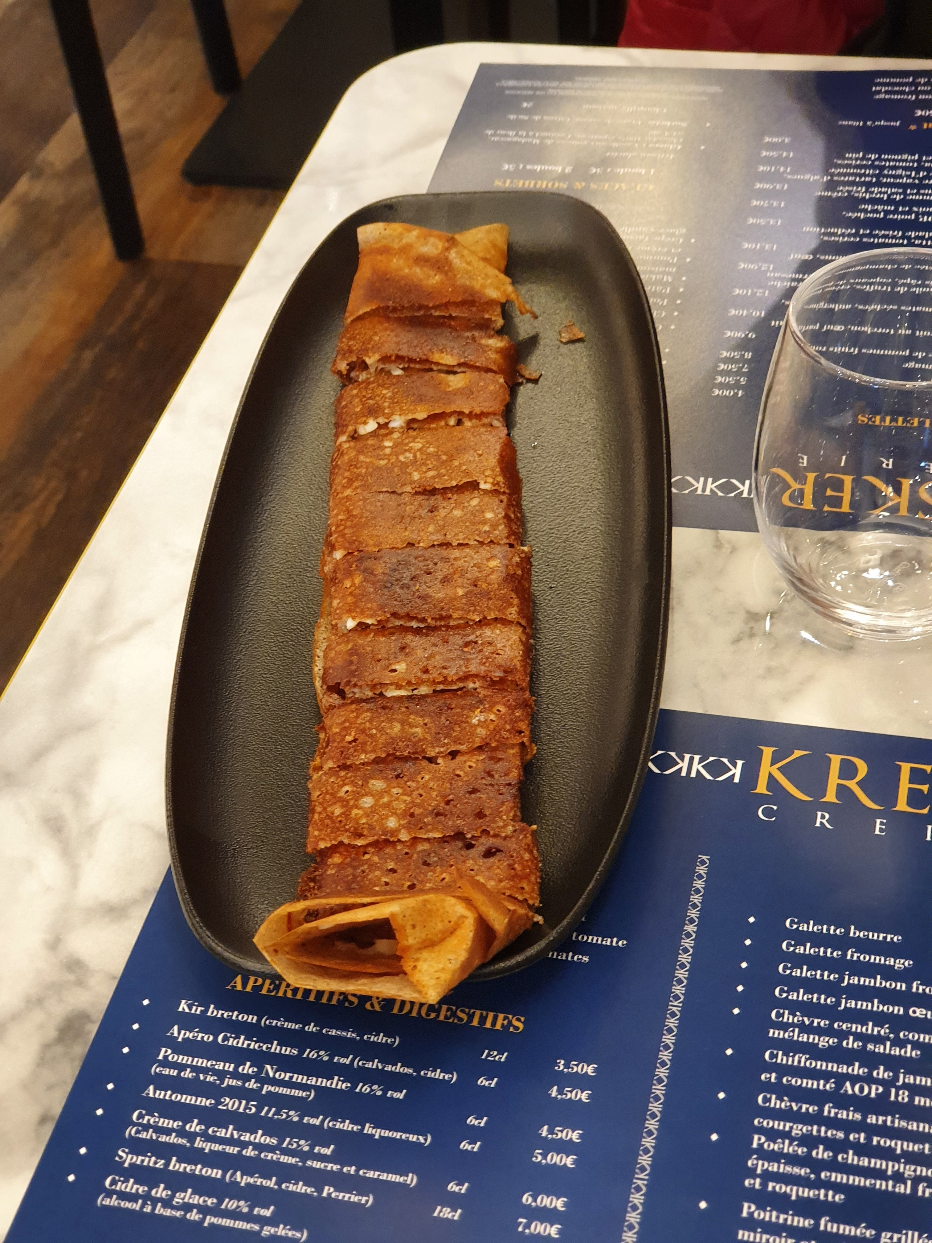 Produits de qualité mais galette trop cuite malgré notre demande d avoir des crêpes moelleuses et peu fournies. La table de 4 d à côté n a pas fini les siennes car trop cuite mais le serveur a dit que c était leur façon de faire !! Surprenant quand même ! Les crêpes dessert sont petites (makis à la banane et celle aux pommes). Le cidre est bon Prix assez élevés