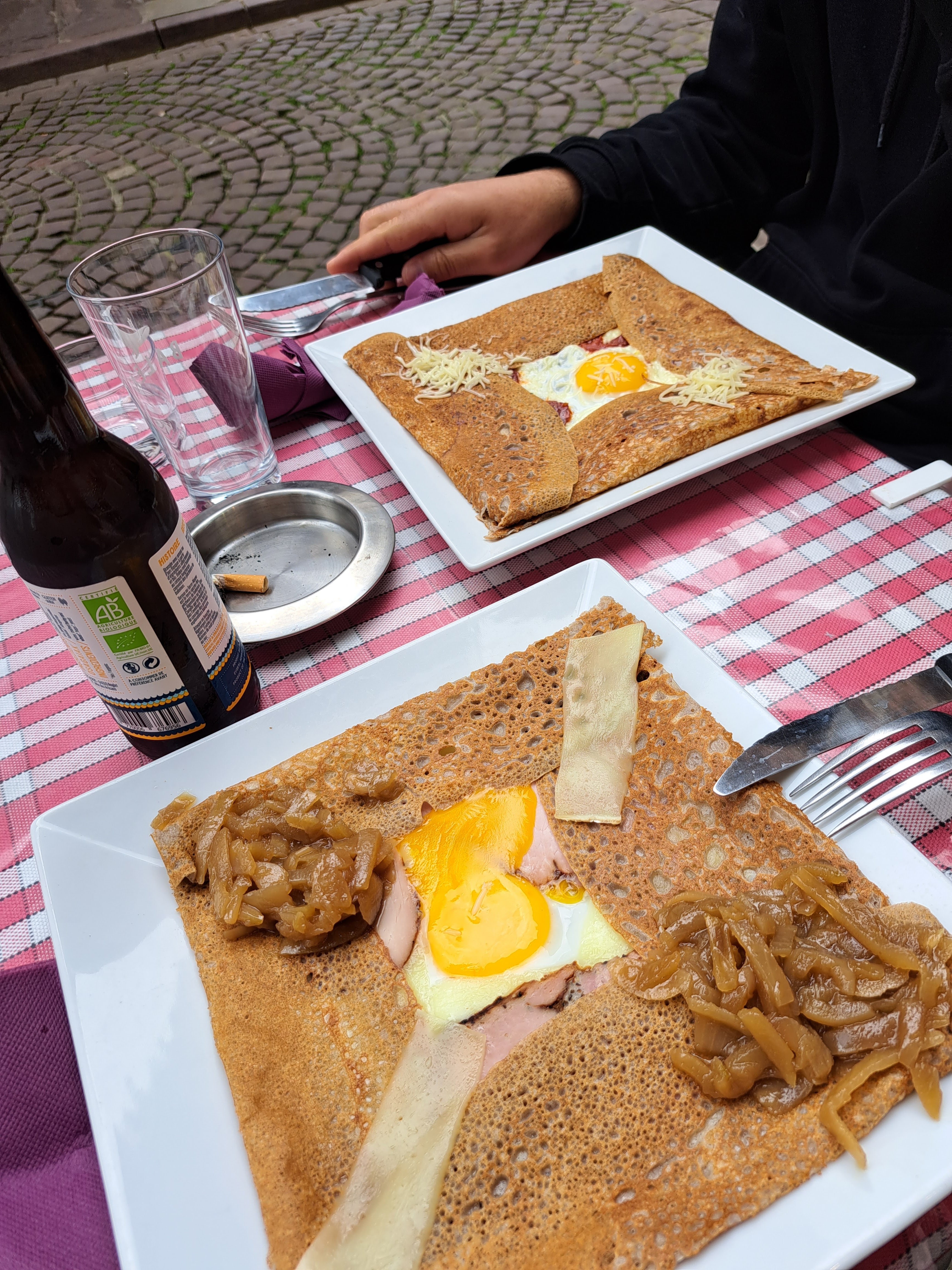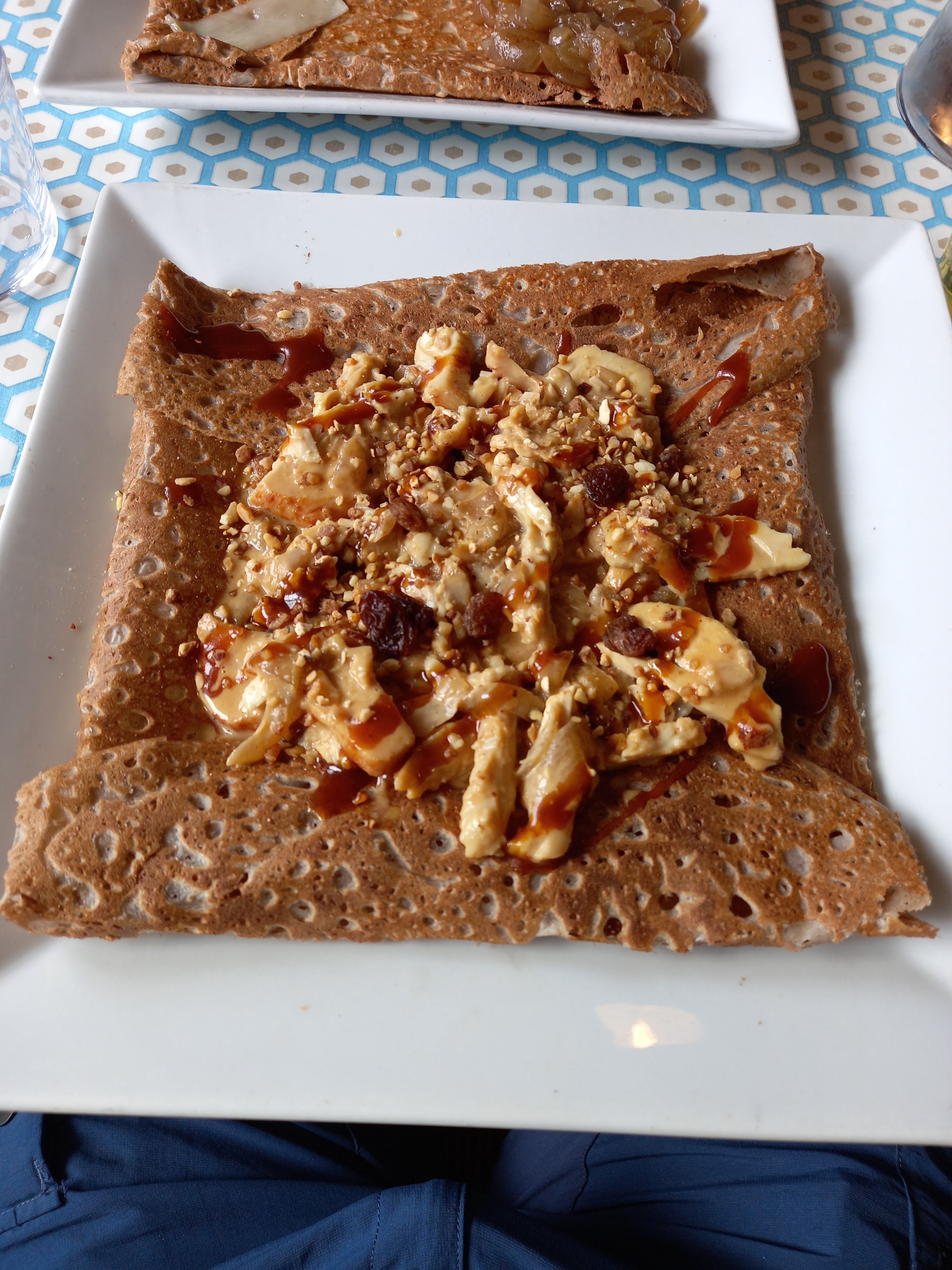 J'ai eu des crêpes salées et sucrées, et les deux étaient savoureuses à part entière. J'étais assis dehors, regardant la cathédrale. En plus de regarder les touristes se réveiller tranquillement dans l'avenue. Et ce qui était particulièrement amusant pour moi, c'était d'observer mes compagnons pèlerins arriver dans la pseudo-Mecque des pèlerins. Le service était bon. Comme il pleuvait un peu et que j'étais le seul client assis à l'extérieur, ils ne m'ont pas oublié et ont veillé à ce que je sois soigné. Hautement recommandé. Et si vous ne deviez choisir qu'une seule crêpe entre le salé et le sucré, optez pour le salé. (À moins, bien sûr, que vous ayez la dent sucrée.🙂)