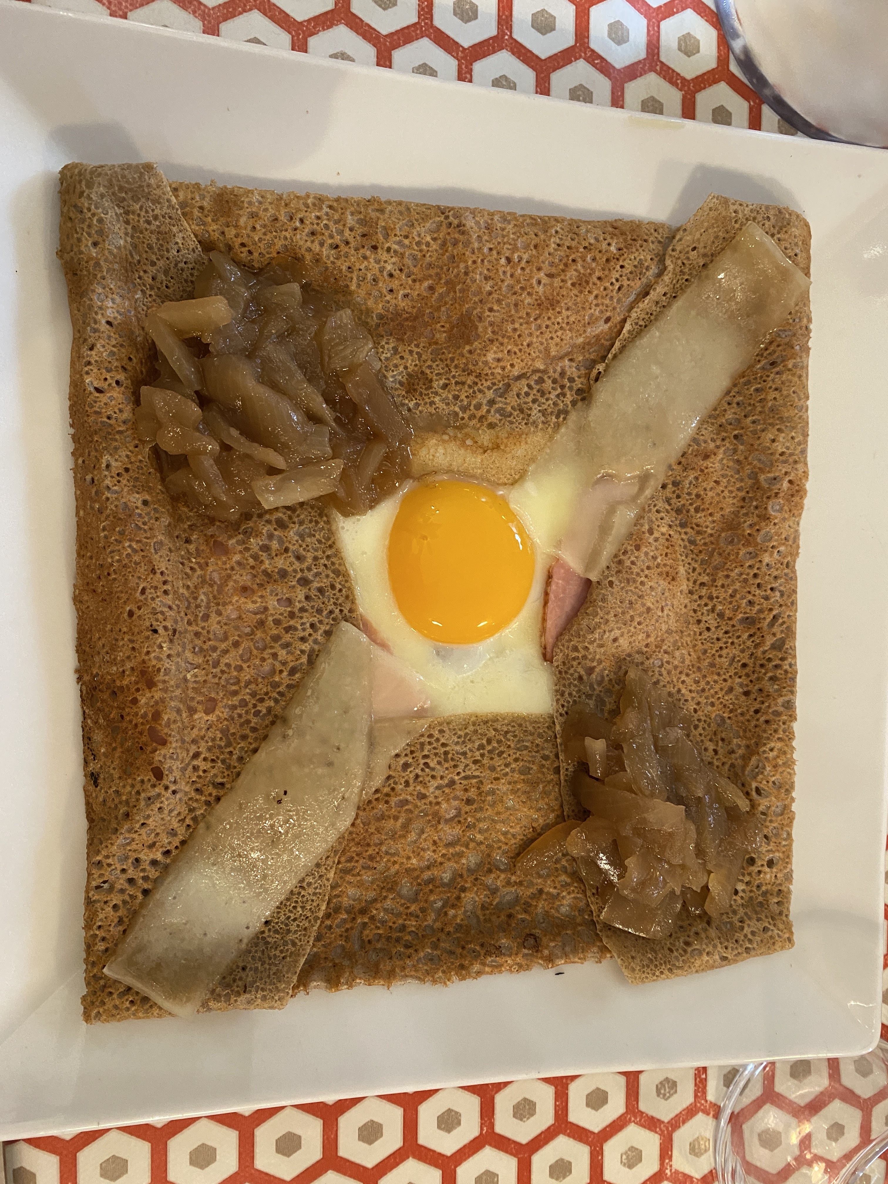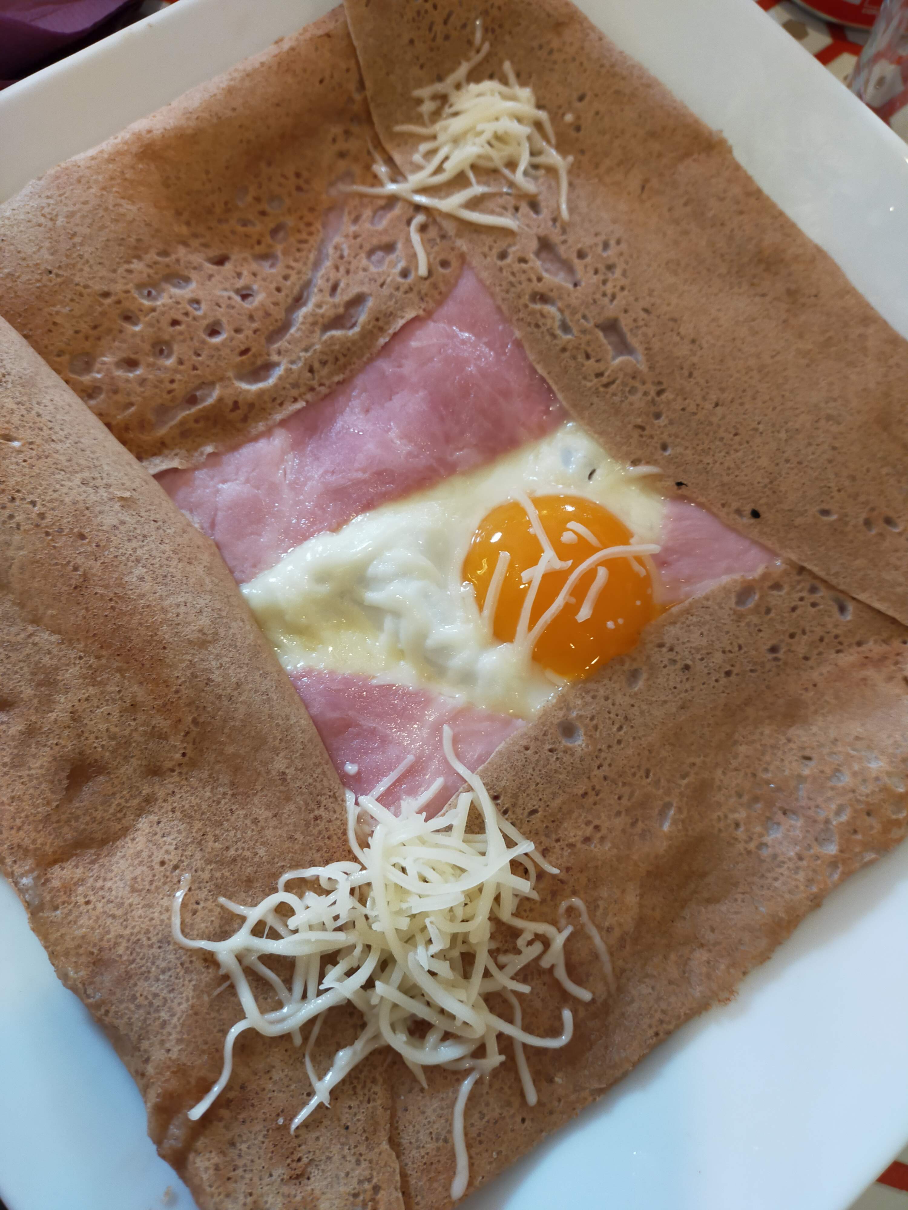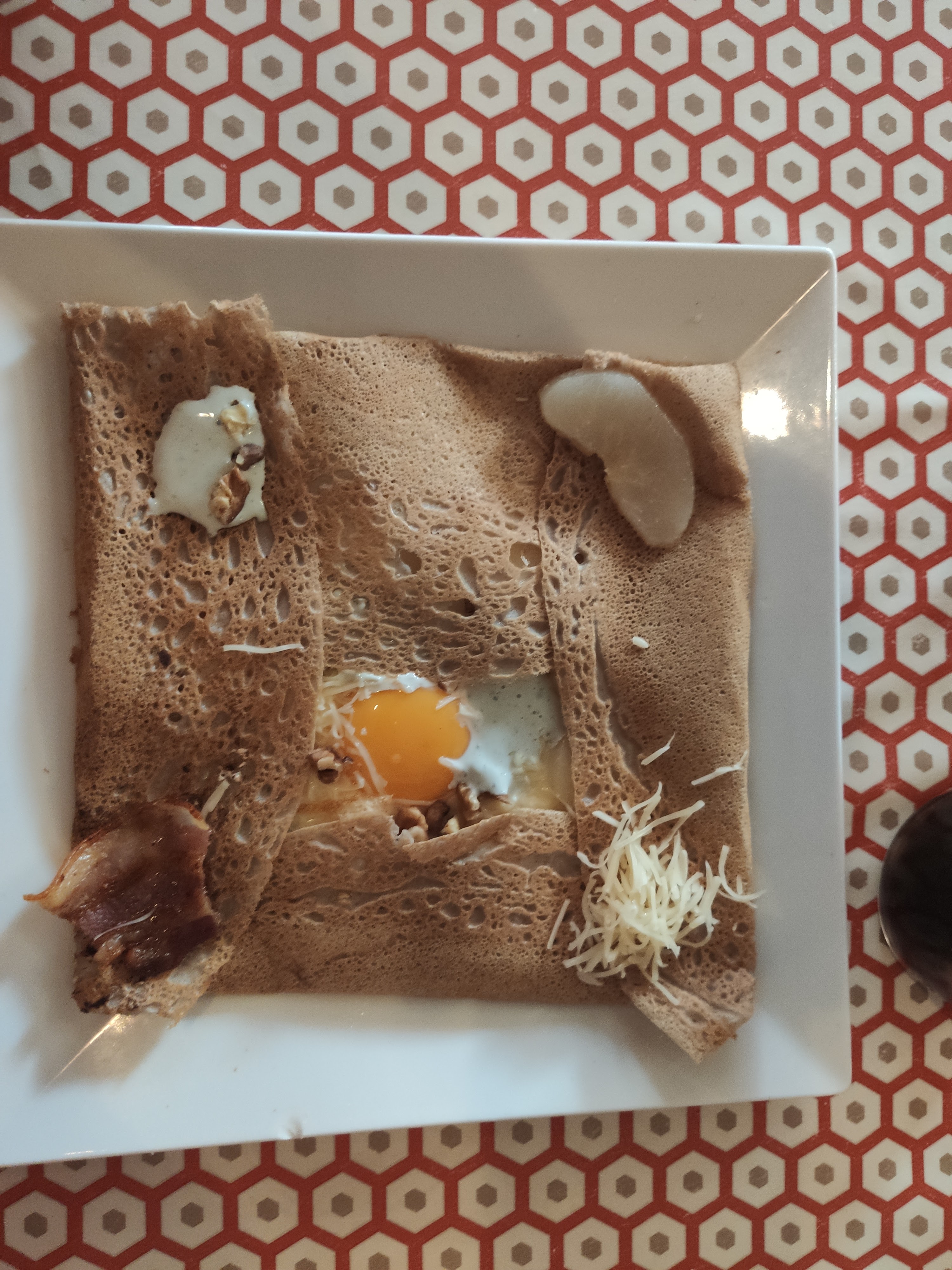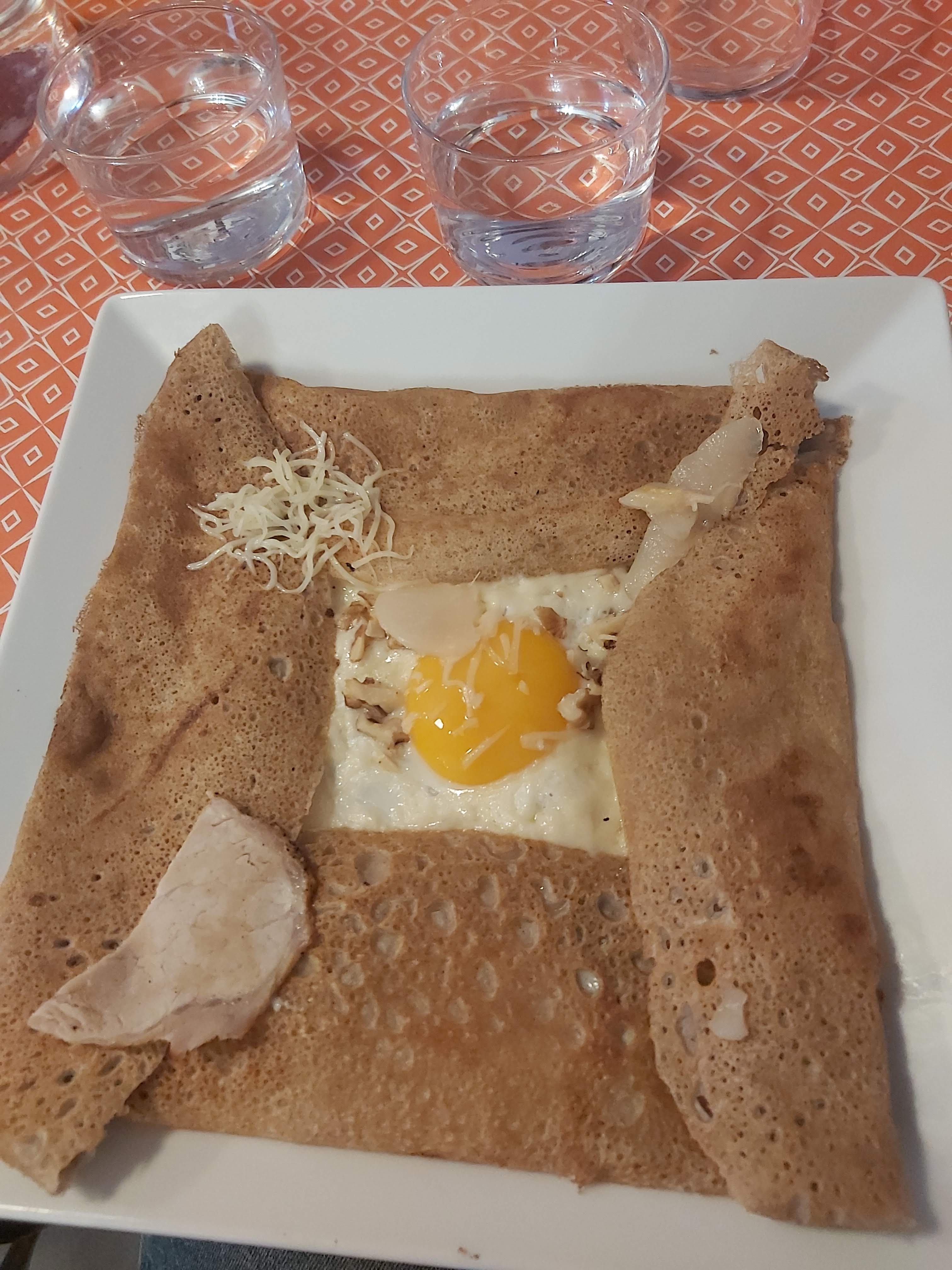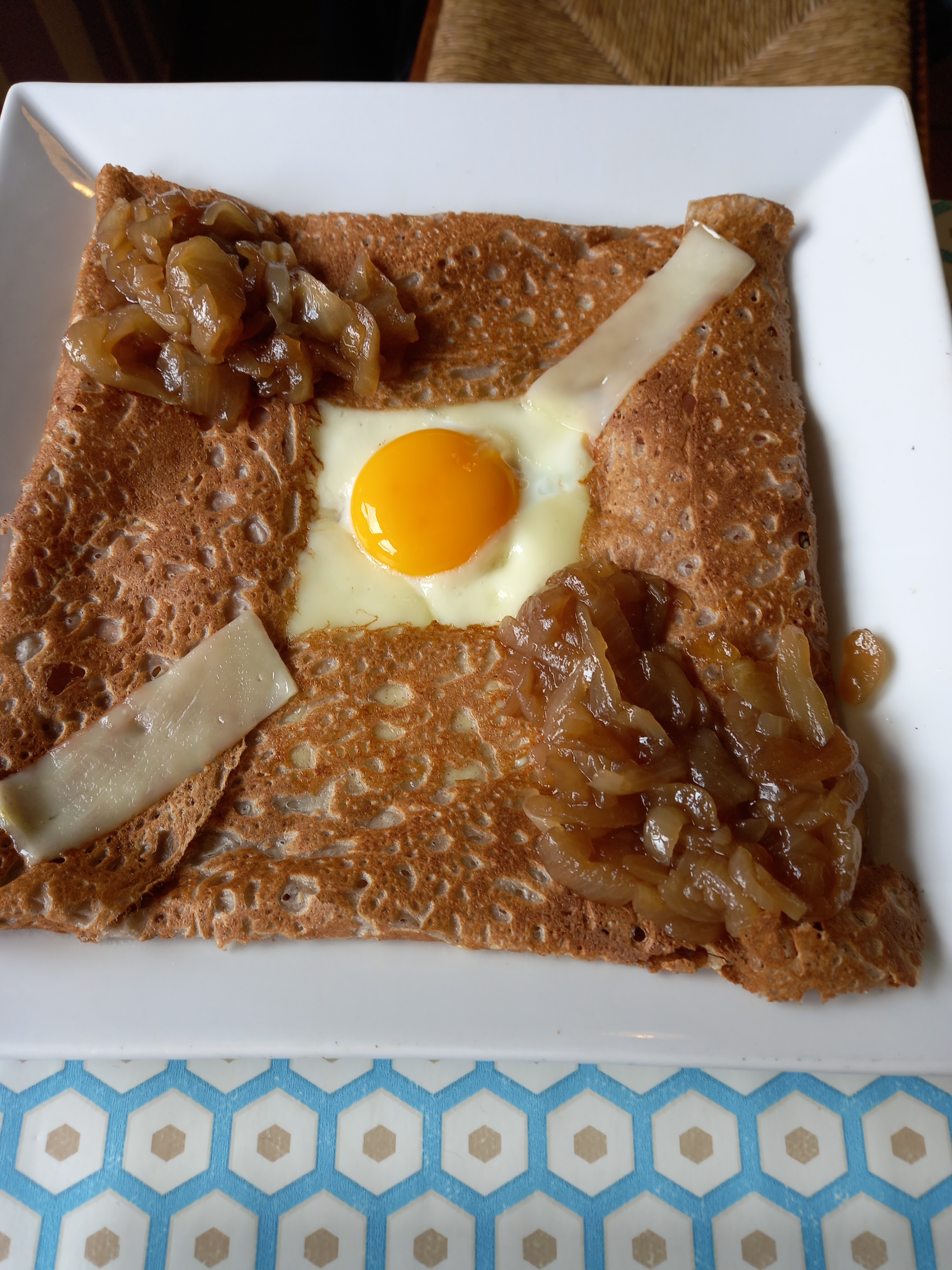 Galette au chorizo et fromage, œuf mangé. Mélange parfait de Bretagne et du Pays Basque. Délicieux! Service très attentionné et sympathique.