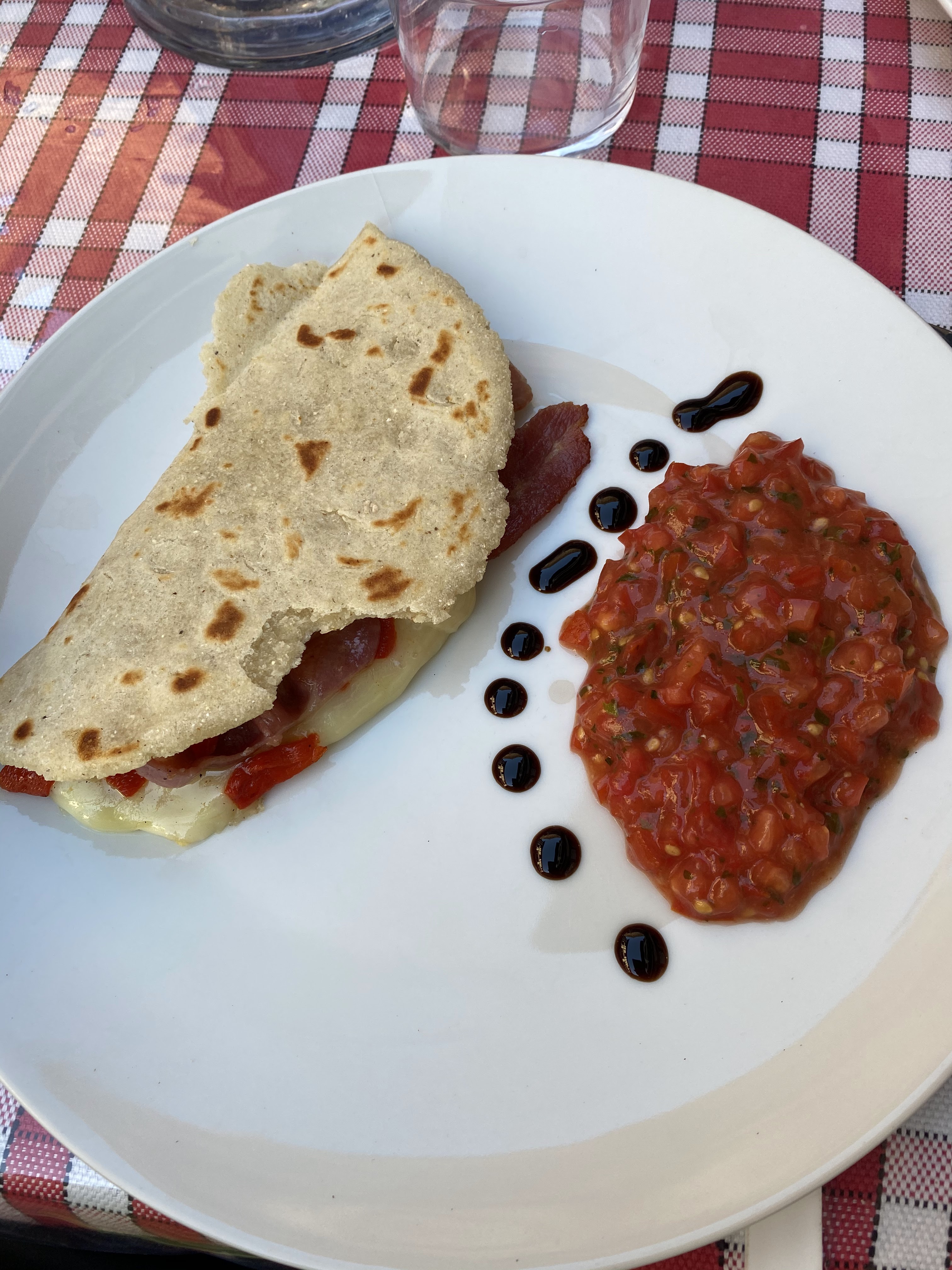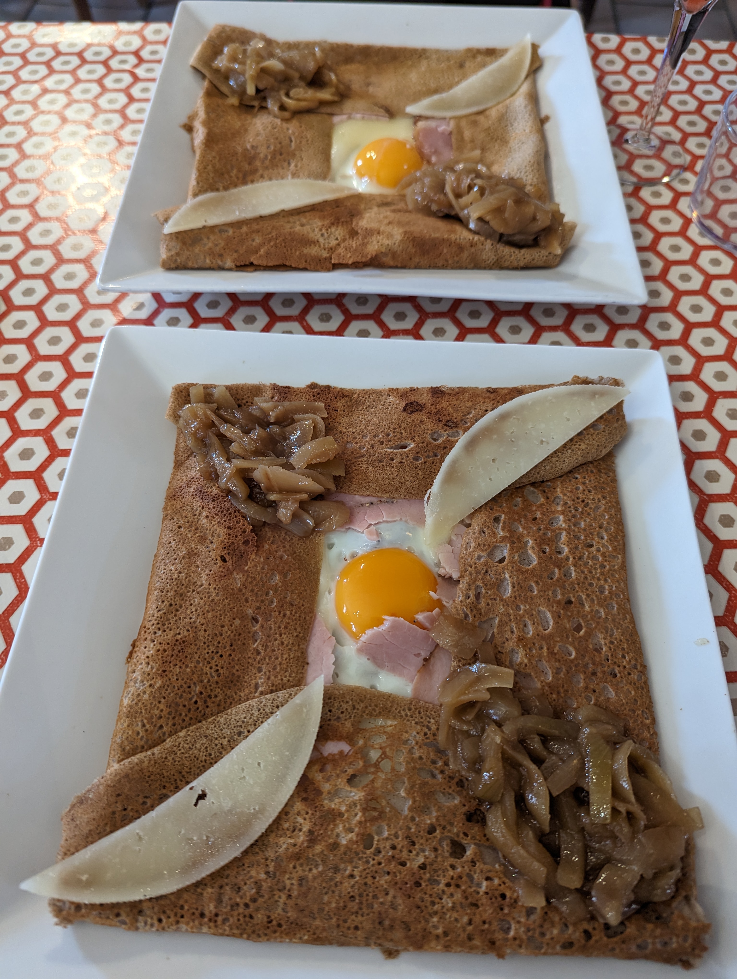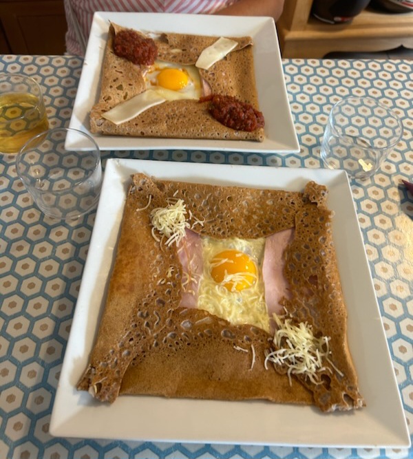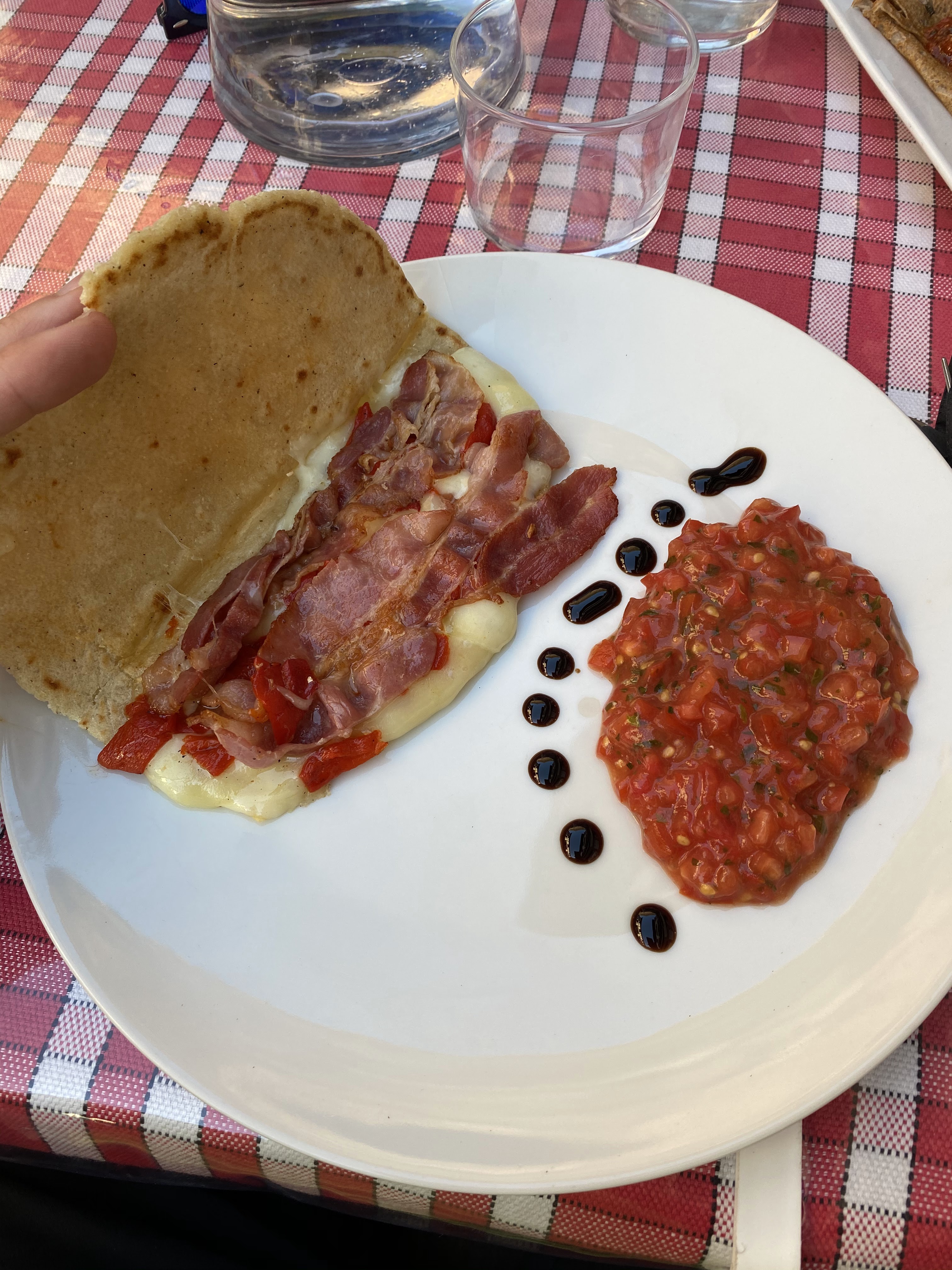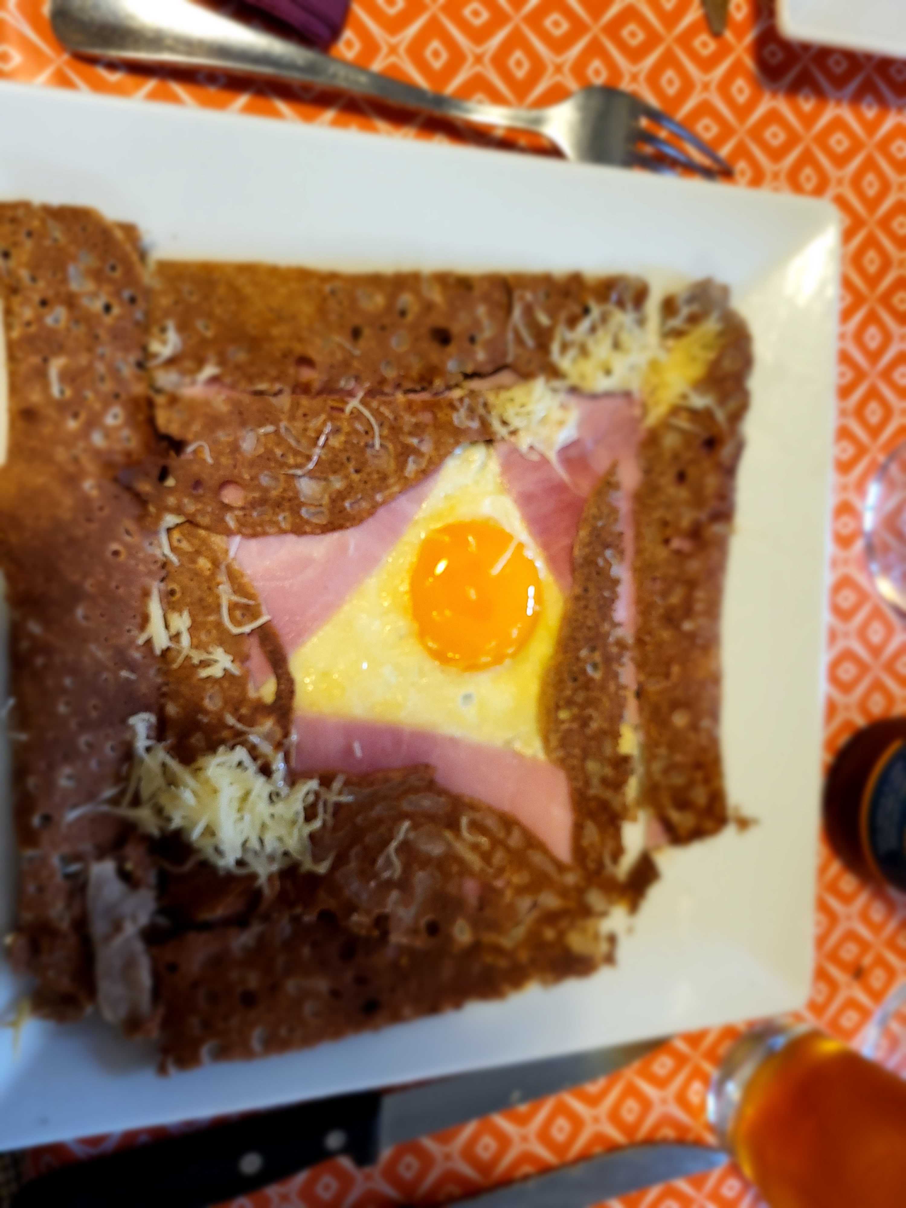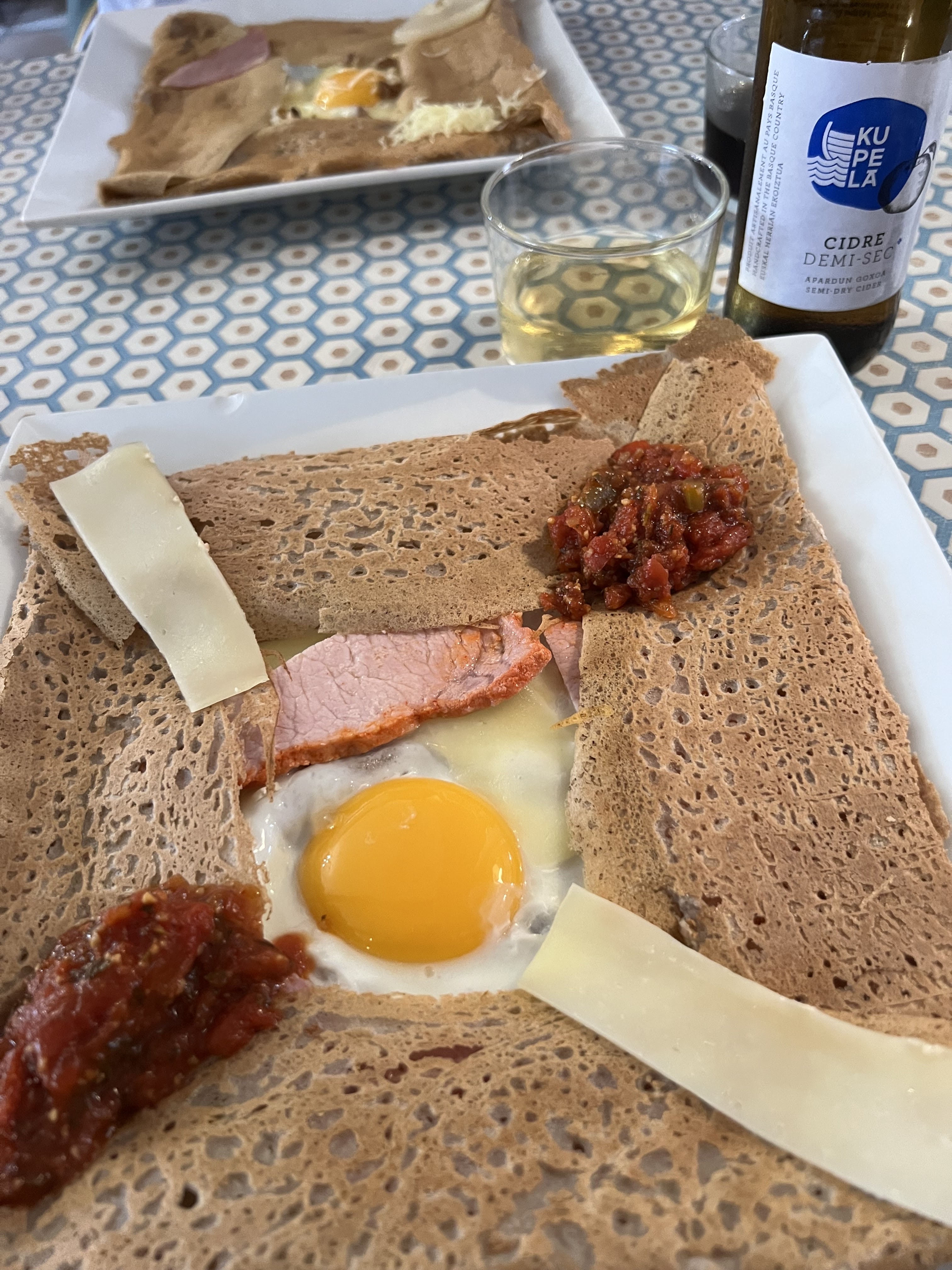 Galette au chorizo et fromage, œuf mangé. Mélange parfait de Bretagne et du Pays Basque. Délicieux! Service très attentionné et sympathique.