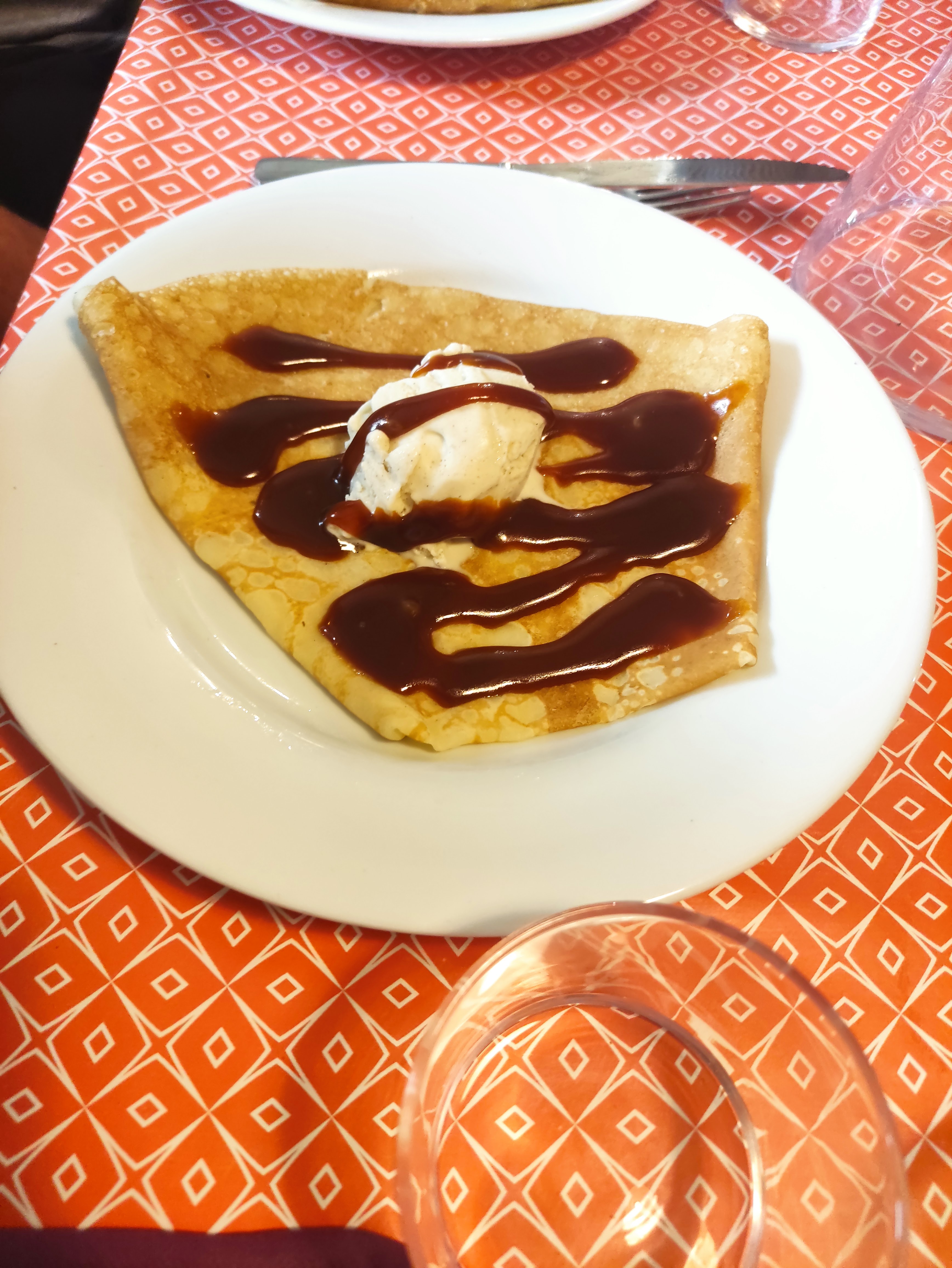 Nous y sommes allés un jour avec l'idée de manger mais il faisait très chaud à l'intérieur du restaurant, ils n'avaient même pas ouvert les fenêtres et les tables sont assez rapprochées pour profiter de l'espace. Nous ne restons pas. Mais un autre après-midi nous sommes allés prendre une crêpe sucrée pour le goûter et ce jour-là, en plus de ne pas faire très chaud, les fenêtres étaient ouvertes. La nourriture n'avait rien de spécial. C'étaient de bonnes crêpes simples. Je pense environ 3,5 euros pour chacun. Le chocolat noir maison est très bon.