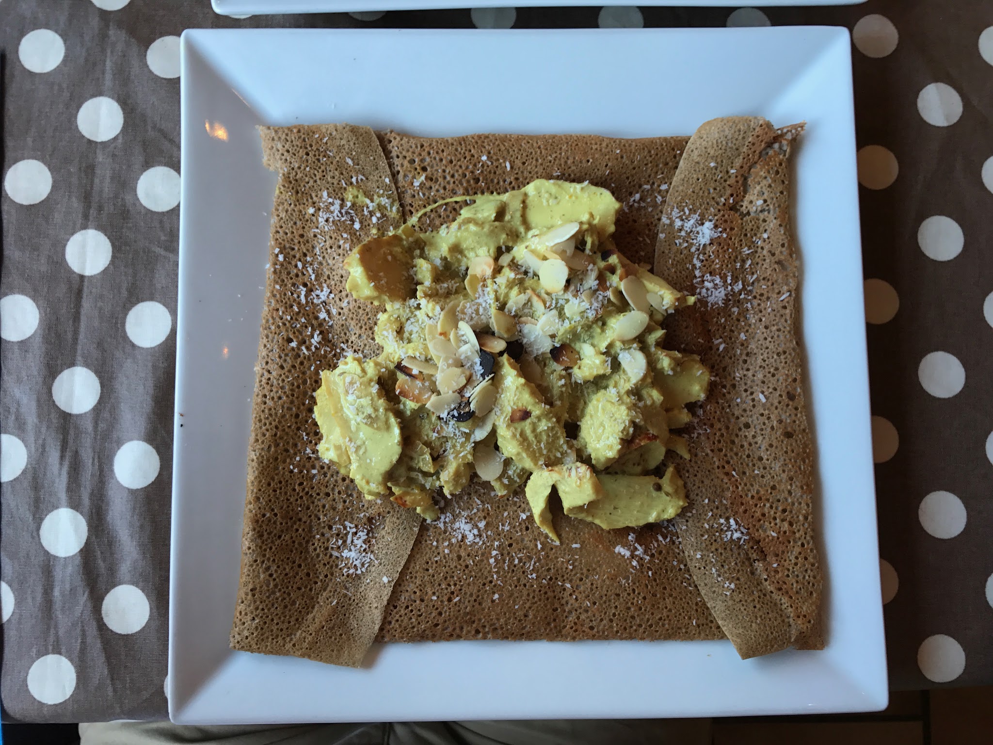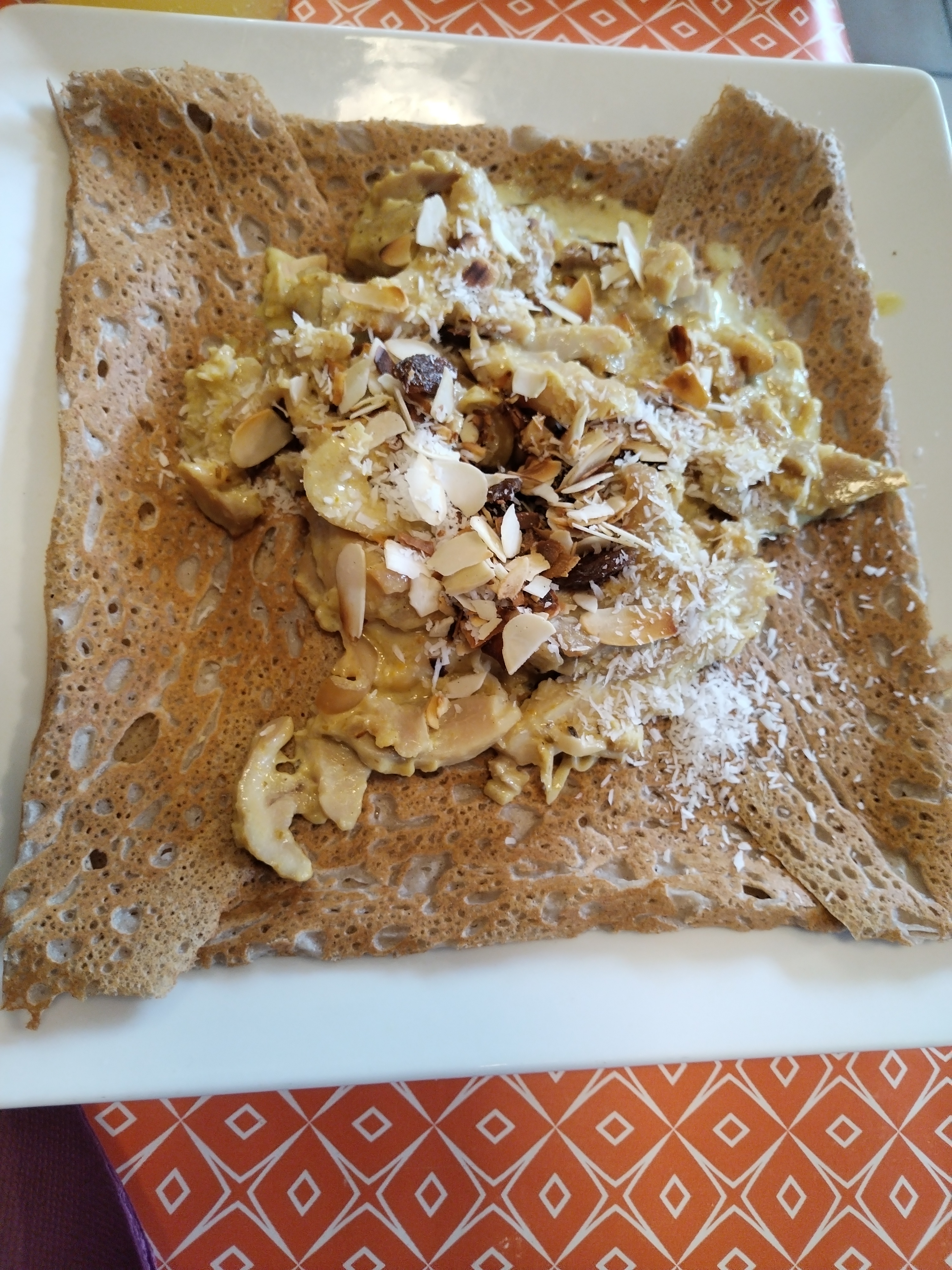 Crêpes copieuses et heureusement que la serveuse avait le sourire parce que quand on est rentré on a eu l'impression de déranger le patron ! Elle a fait le job et était adorable. Les crêpes sont parfois curieuses avec du curry et du riz mais tous les goûts sont dans la nature ! La classique était très bonne.