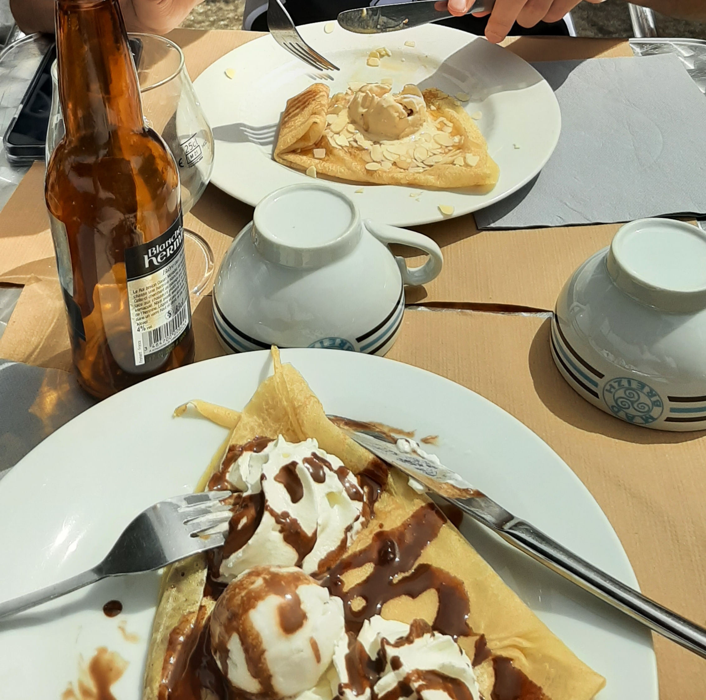 Avant de quitter la Bretagne nous sommes retournés à l’Amphore pour y manger leurs bonnes galettes (Sarrazin bio) et crêpes préparées sous nos yeux. Un plaisir