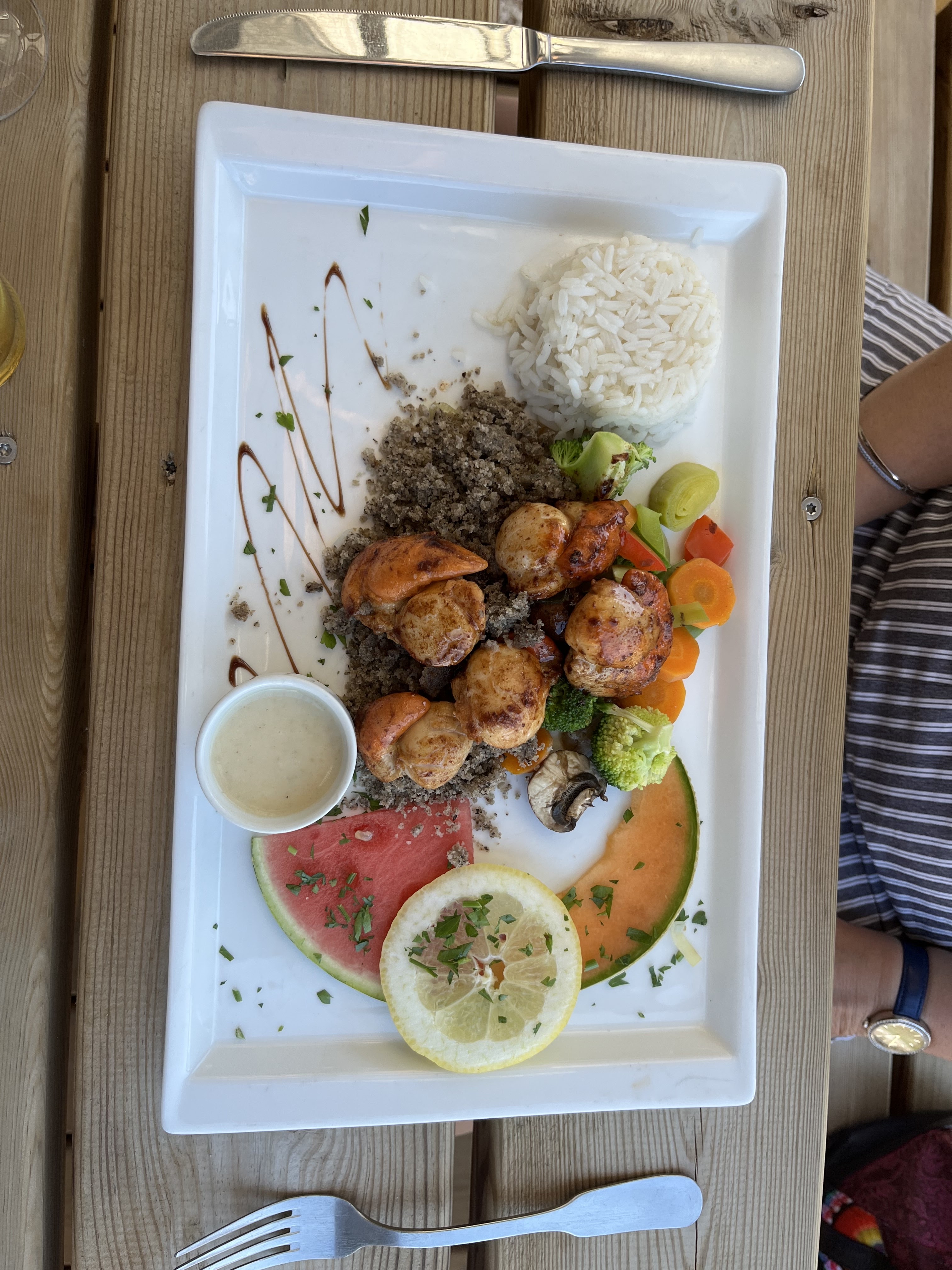 de passage le24 /06 bon accueil , serveur sympathique , quand au plats commandé grosse déception :une tonne salade avec 1 brochette de st jacques et crevette, froide ,cette assiette je lai payer 25eur pour moi elle ne vaut pas plus de 12 euro le changement de propriétaire et le covid n explique pas tout je peux accepter une augmentation des tarifs mais a ce point ; surtout que a la commande j ai demander de supprimer la salade et de mettre a la place du riz et des légumes , le cuisto n a rien voulus savoir ,mon assiette était un retour d'une erreur sur une autre table donc pour finir on me sert une soucoupe de riz a coté . les serveurs étaient désolé et je les comprend , le responsable de salle nos a pris de haut et ne s est même pas excusé la seule chose qu' il a dit : je vais en parler a la cuisine ,est ce que cela a été fait ; c est pour cela que je modifie mon appréciation sur ce restaurant je suis sorti très déçu