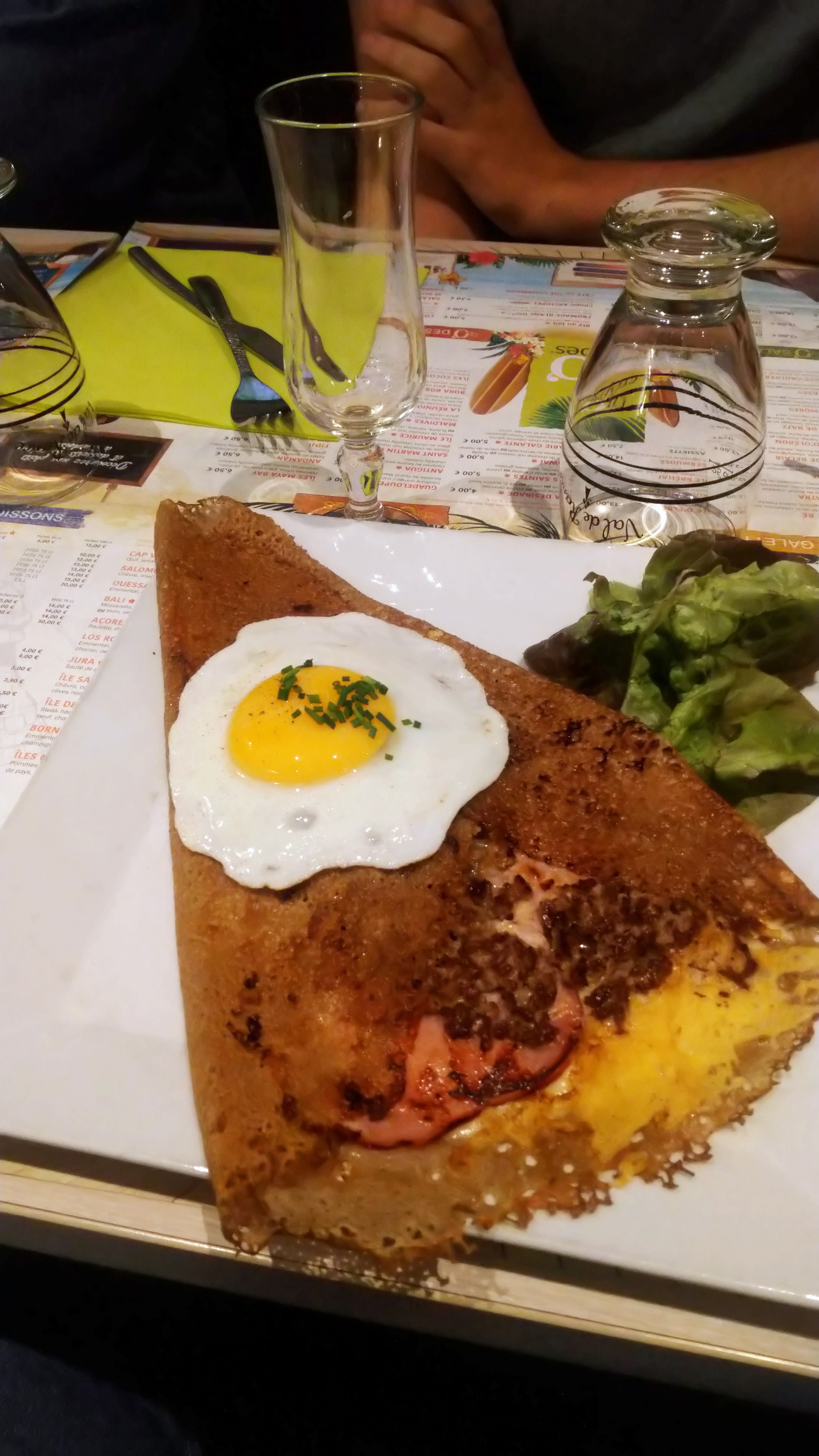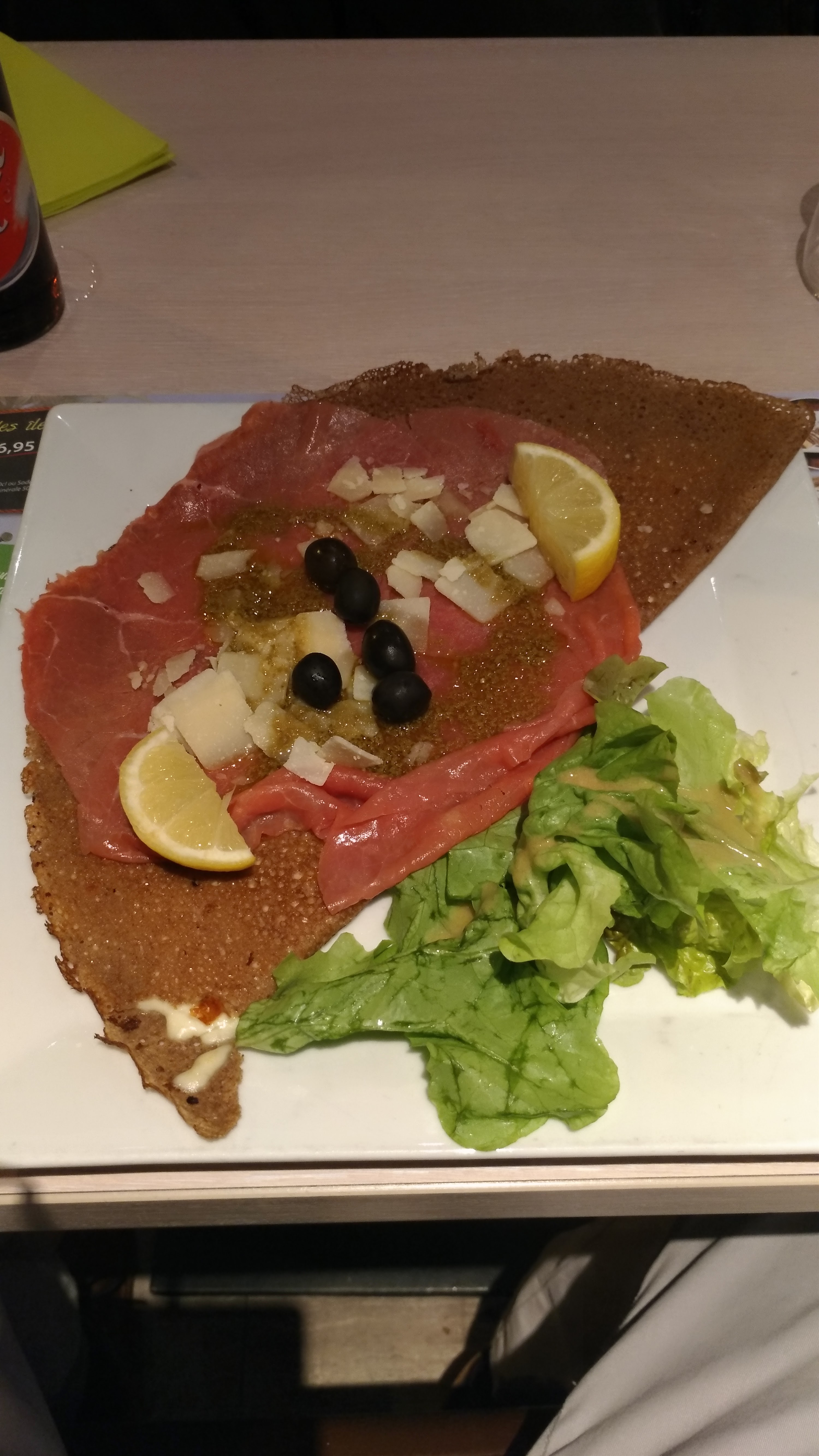Assez bon . Les salades dans des crêpes : pas terrible . Trop de salades vertes par rapport au jambon de Parme . ... pas facile à manger . On a dû réclamer notre bouteille de vin au milieu de notre repas . Sinon on l aurait jamais eu .