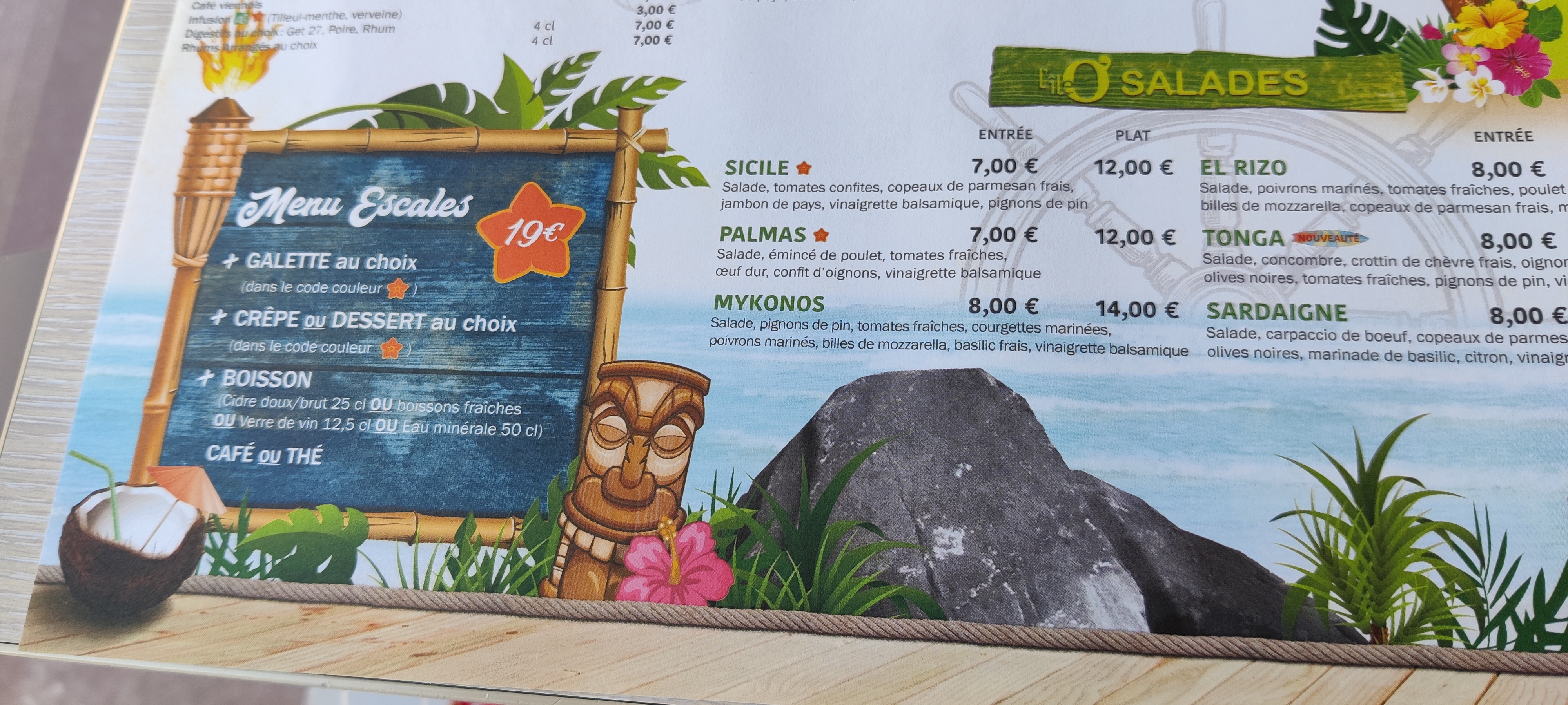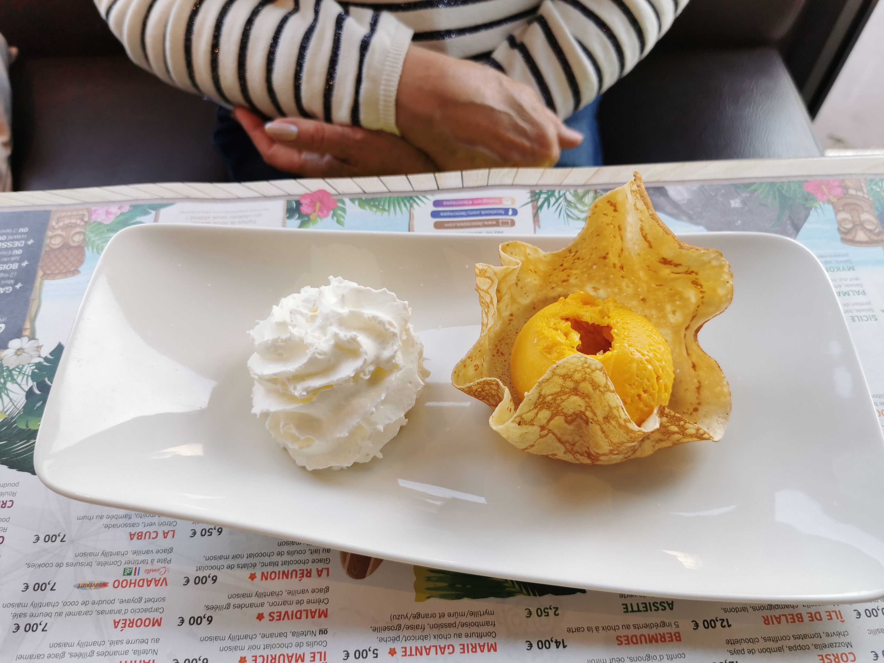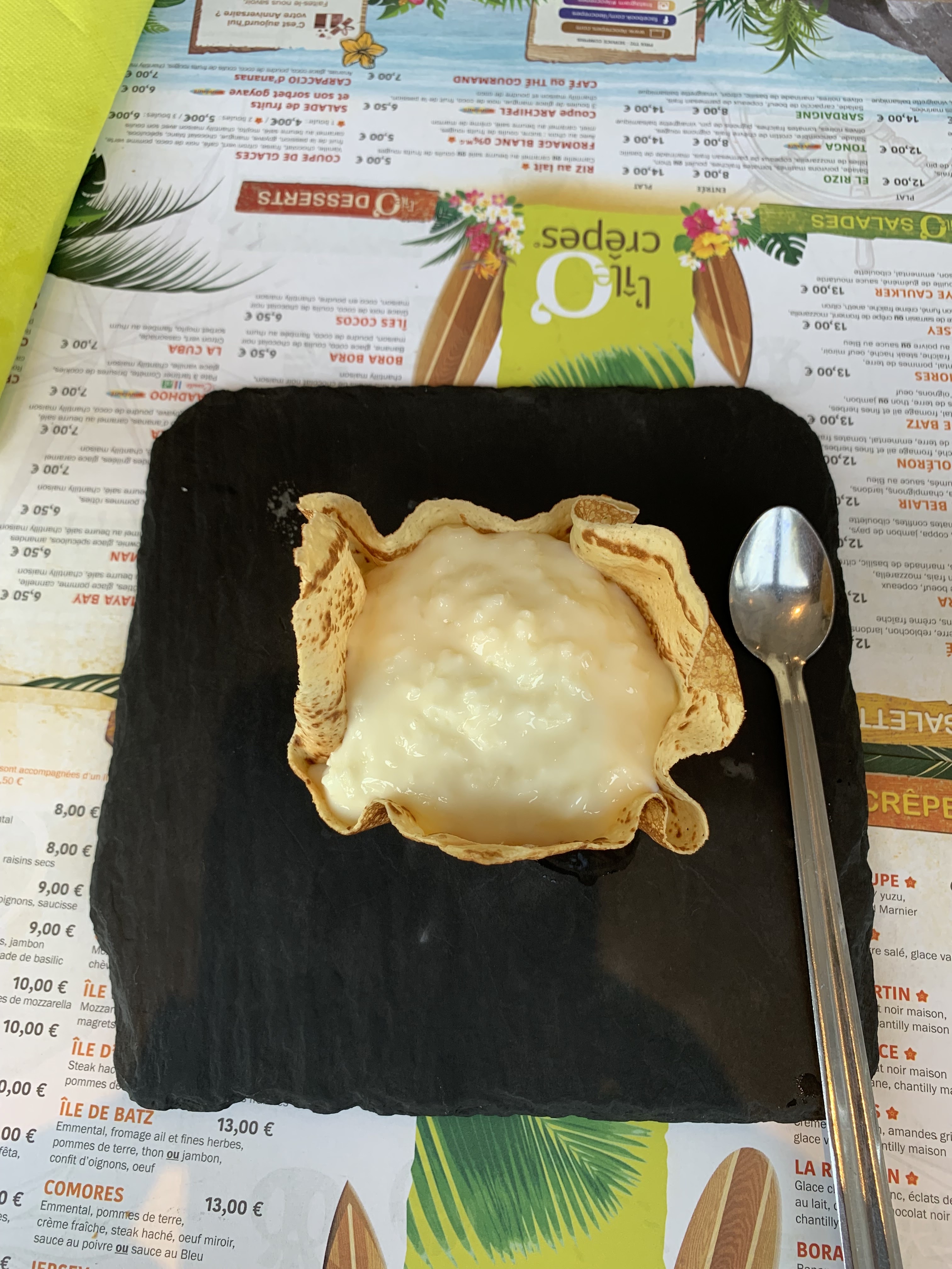 Accueil un peu militaire, mais courtois. L assiette capri en plat est très bien . crêpe Tenerife est très copieuse. Avec chantilly Maison. Service efficace. La déco est simple mais sympa. Le restaurant est climatisé. Une petite terrasse est disponible Je recommande .