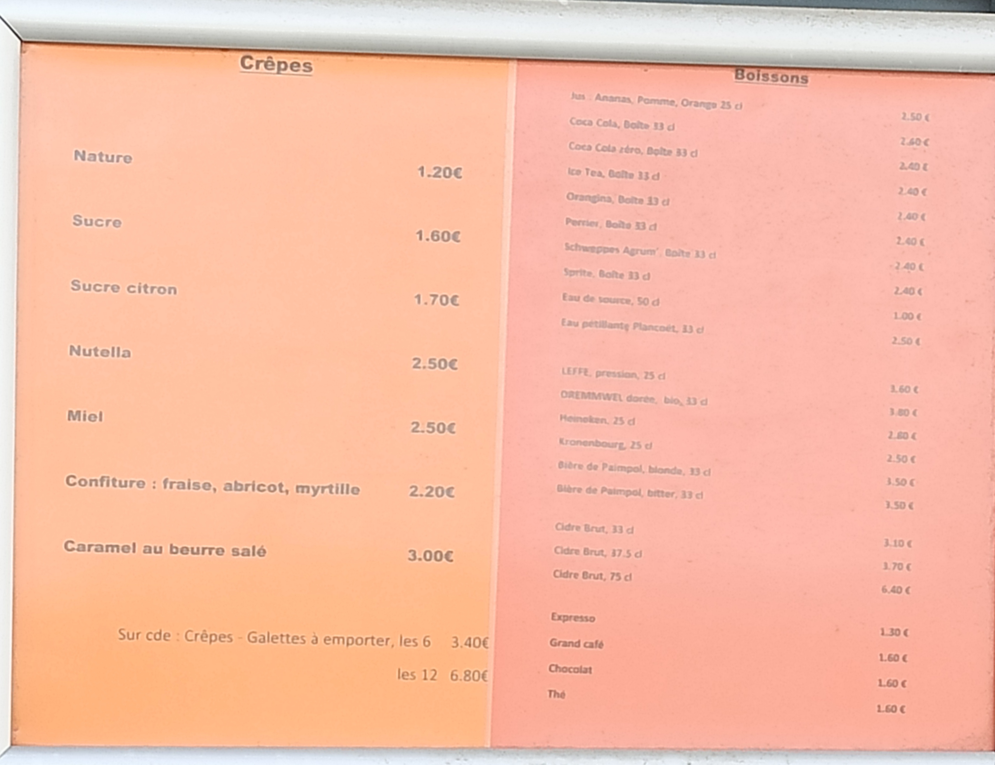 Vraiment déçu de ma crêpe en sucre servie dans une assiette carton et sans couverts et pas terrible terrible. Certes c'était 1.3€ mais je préfère payer plus cher si ça me permet d'en manger une bonne, digne de la région où on est.