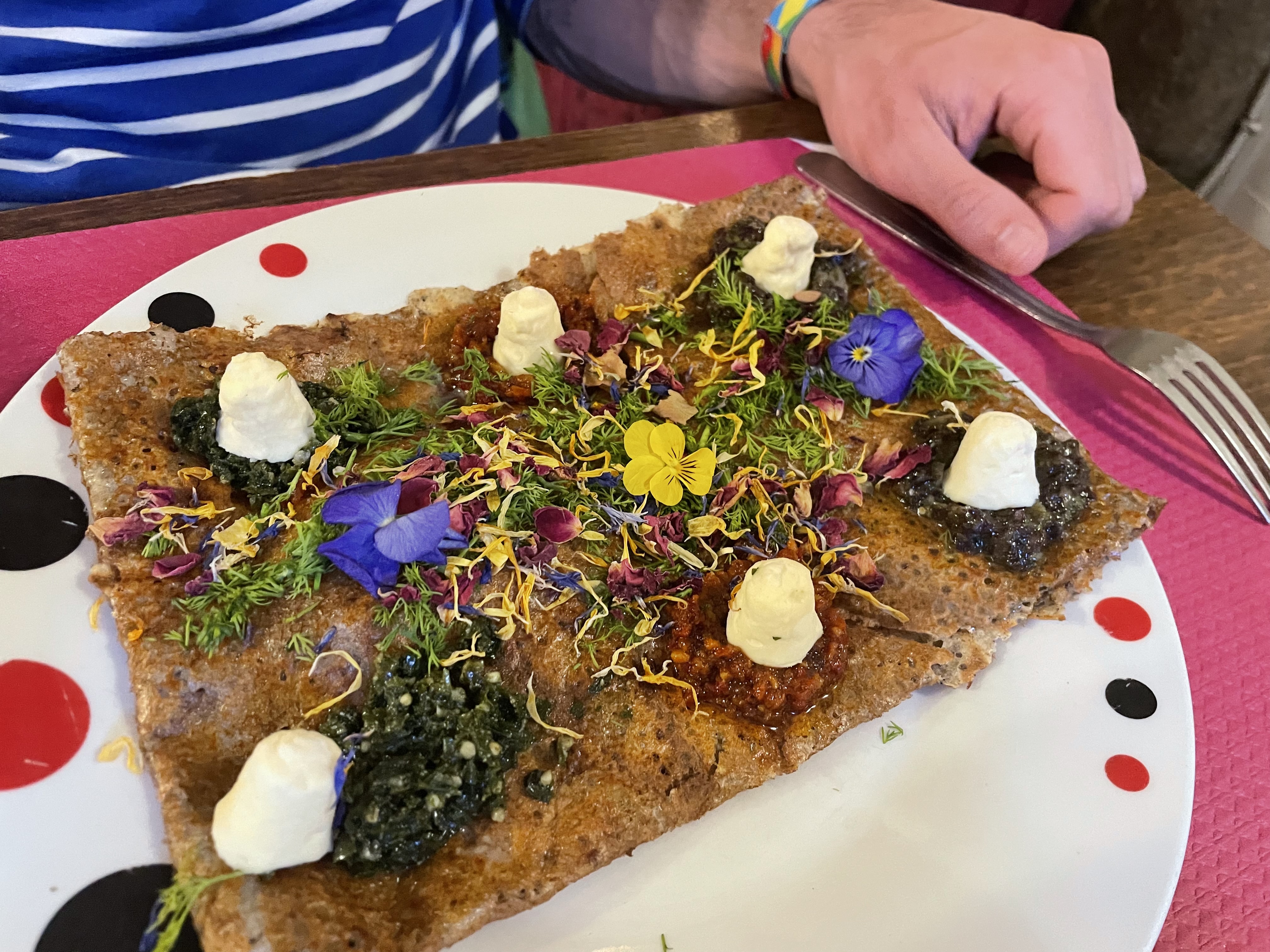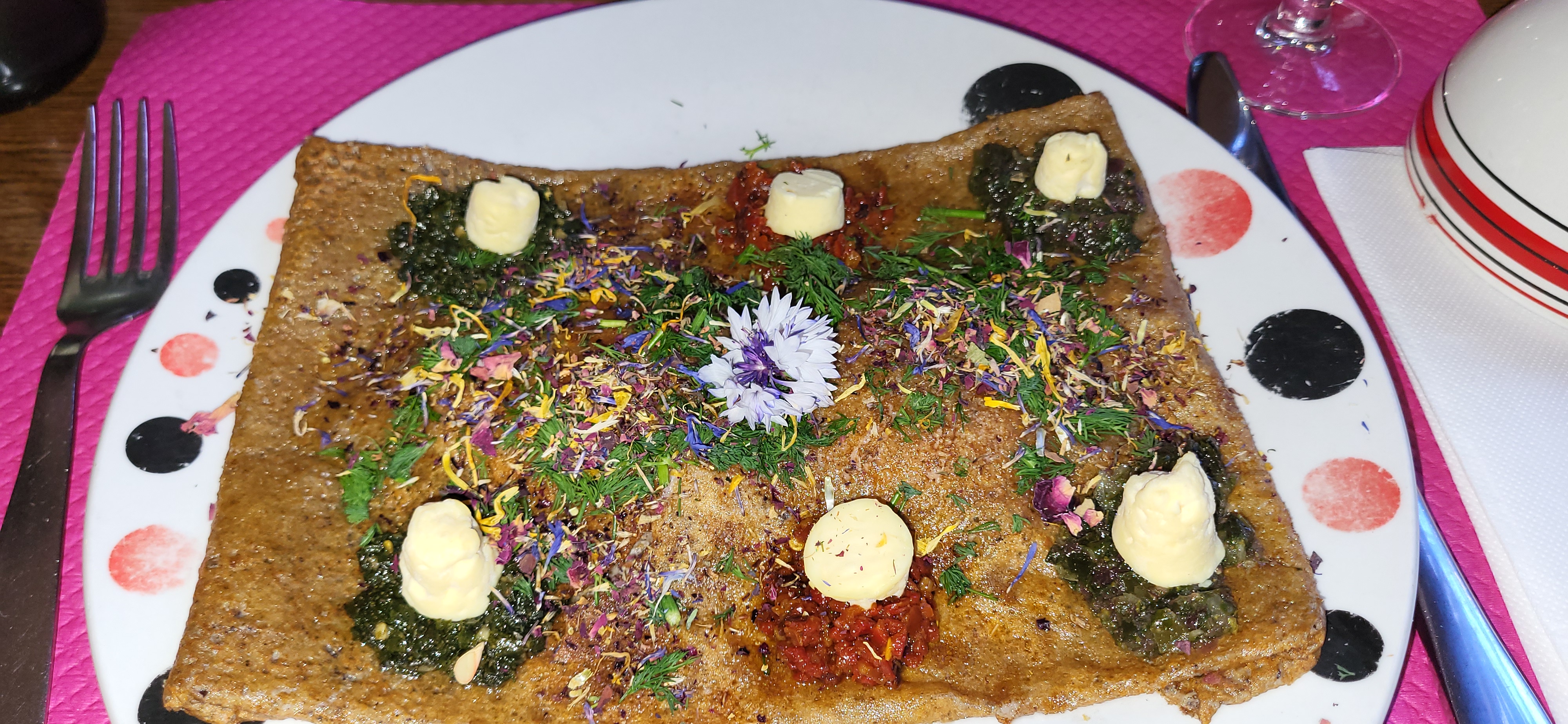 Une crêperie avec des crêpes hors du commun avec des algues des plantes et des fleurs. Le chef est un vrai artiste créatif. Le plus est la crêpe offerte pour notre chien. A bientôt