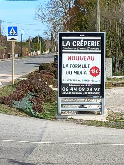 Notre visite s'est faite en Avril 2023, il y a un an! Et compte tenu de la réponse des propriétaires, c'est bien à DIEUPENTALE! Allo, c'était en 2023! Je n'ai pas osé mettre mon avis il y a un an, mais je le fais maintenant. Et oui monsieur c'est bien chez vous! Accueil froid. Pas content qu'il manque une personne sur la réservation (personne handicapée souffrante ne pouvant venir au dernier moment, on lui a dit). Nous ont annoncé la réservation pour 20 heure au téléphone, ils ont marqué 19 h 30 sur leur planning, et bien sûr on a eu droit à de fortes remarques comme quoi ils auraient pu dresser notre table pour quelqu'un d'autre, et qu'avec la politesse il aurait fallu arriver à 19 h 15. En ce qui concerne le repas, les crêpes ne sont pas extraordinaires, le vin modeste pour le tarif (bordeaux pas cher....et bon à ses dires, qualité/prix meilleurs que les vins du frontonnais par exemple qu'il dit). Aucune ambiance bretonne comme de la musique par exemple. Ce type de crêperie n'a pas du tout les prétentions que peut avoir une vraie crêperie bretonne (je suis breton, je connais) et ne s'adresse qu'à des clients sans connaissance de la crêpe. Nous boycottons désormais cet établissement.