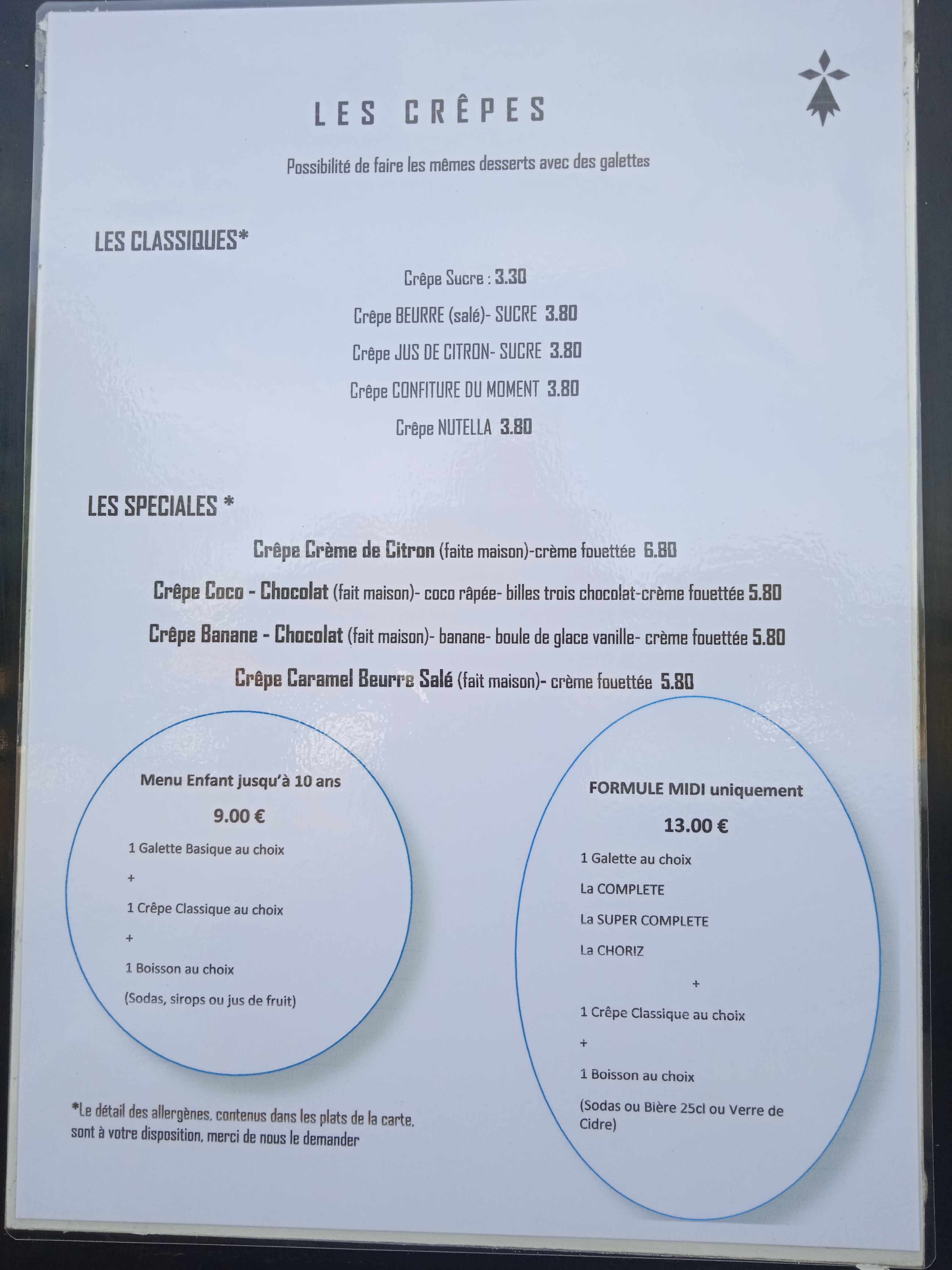 Moi qui pensais manger une bonne crêpe bretonne bien garnie… Une critique négative qui ne plaira pas je suis désolée mais laisser un avis a aussi pour but l’amélioration… la composition écrite met clairement l’eau à la bouche mais quand l’assiette arrive c’est autre chose. La crêpe est grande c’est bien mais très peu fourrée.. une demie pincée de gruyère, les crêpes sont très sèches. Là crêpe saumon / poireaux disons que les poireaux sont limite cuits et il n’y a aucun assaisonnement c’est très fade. La crêpe saucisse de Toulouse, simplement une saucisse coupée en 2 dans la longueur tel un banana split sans la chantilly.. une poignée de champignons de Paris juste revenus à la poêle + 3 rondelles d’oignon.. encore une fois c’était sec et sans assaisonnement. J’ai terminé sur une crêpe type savoyarde avec du reblochon (2 petits morceaux même pas fondus dans la crêpe et sans mentir 5 minuscules morceaux de pomme de terre très facile à trouver car la crêpe est aussi vide que les autres. Aucune liaison avec les aliments. Nous avons demandé de la crème car la crêpe avait du mal à descendre mais non, nous n’avons pas de crème. Nous avons essayé de lui faire comprendre que ce n’était pas extra mais ce monsieur était un peu disons fermé à la discussion. A part dire quel gâchis au moment de récupérer les assiettes.. et encore nous avions faim. Dommage car communiquer avec ses clients c’est une des bases de la restauration. Je suis vraiment déçue je pensais y manger aussi souvent qu’aux autres restaurants du village et prendre plaisir à faire travailler ce charmant couple. Sinon le restaurant est bien décoré et c’est très propre. Petit + pour les crêpes « dessert » beaucoup plus travaillées. Je suis désolée mais les commentaires positifs ont vraiment été laissés par de vrais clients ?