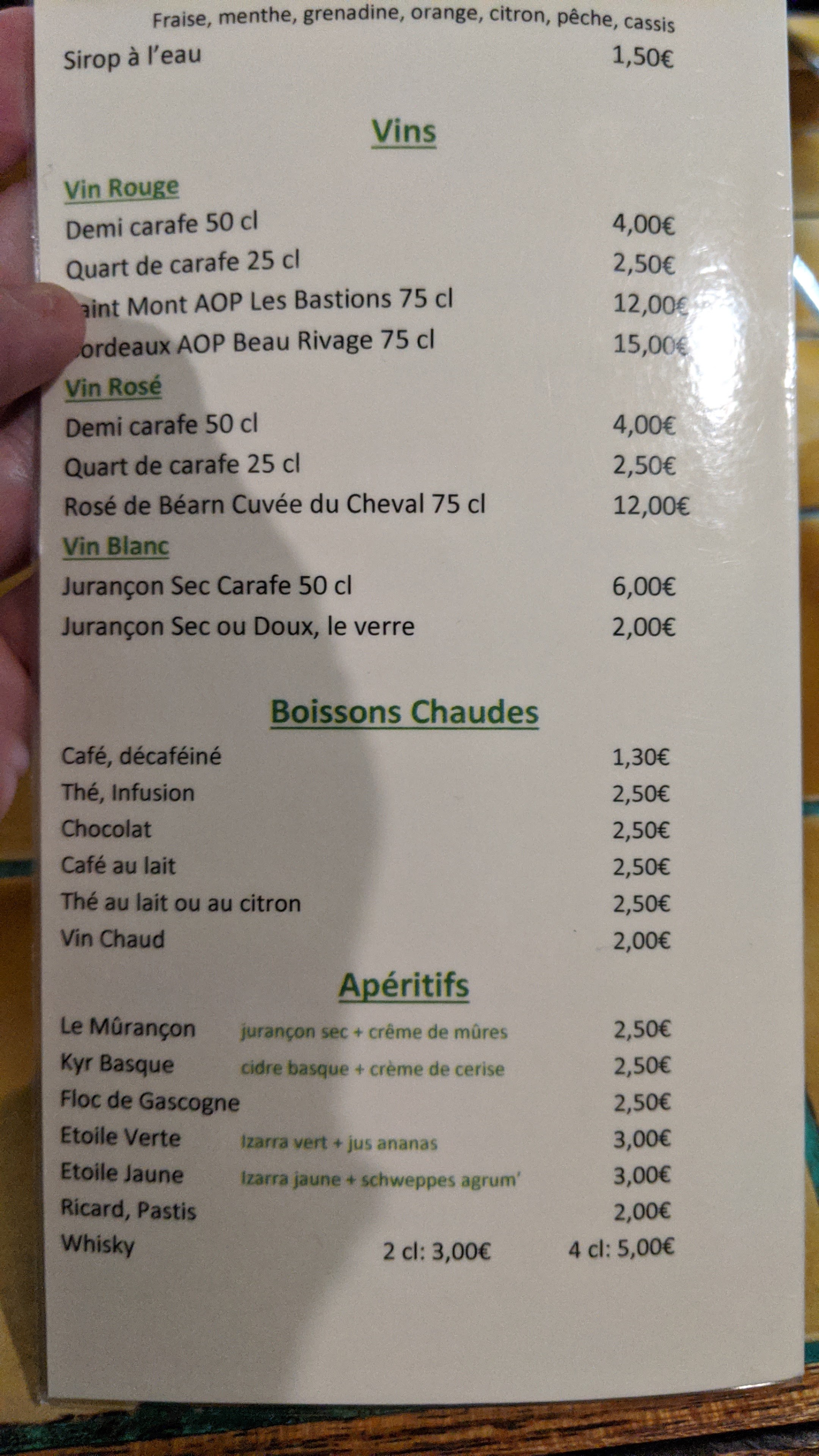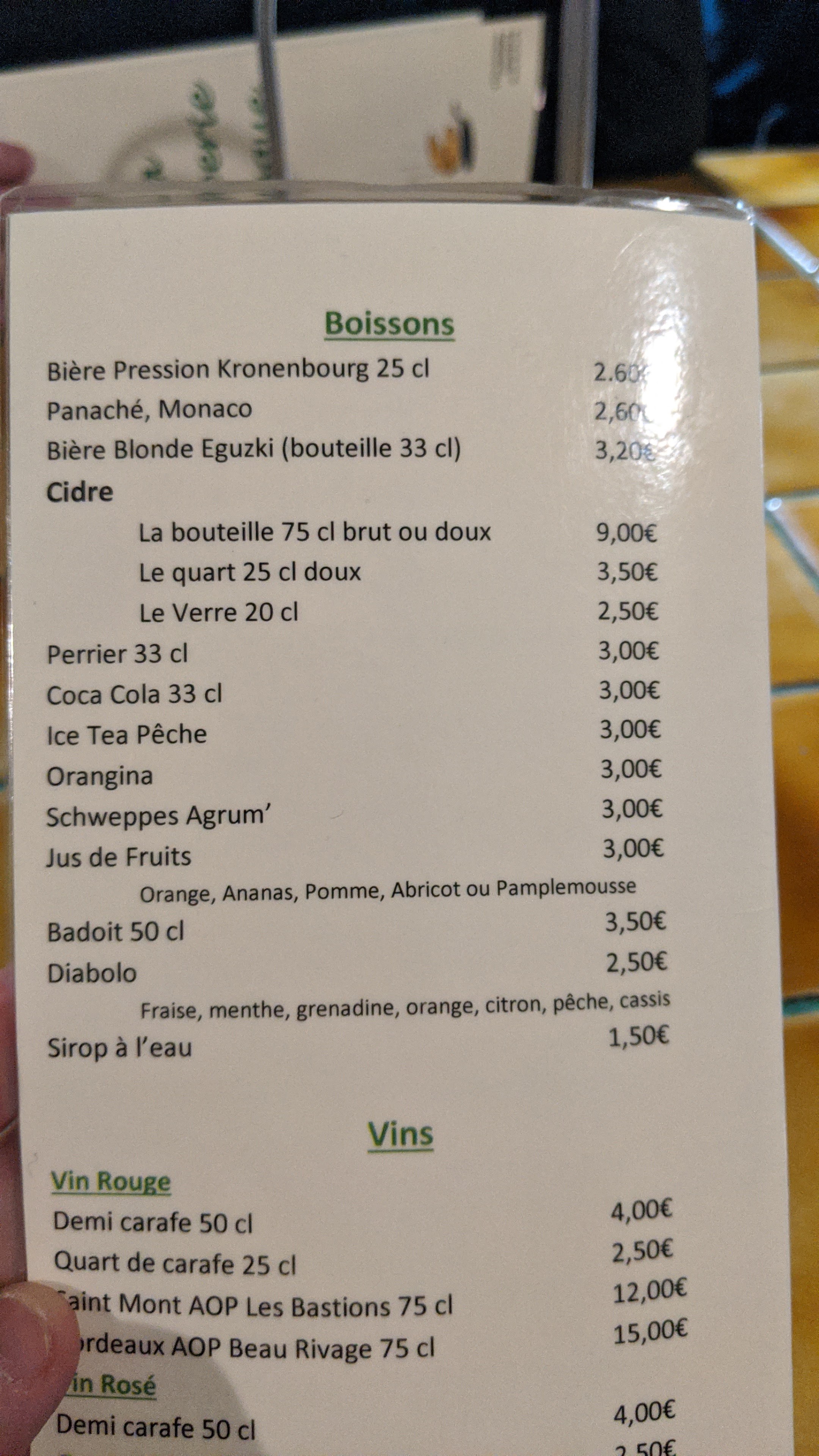 Très bon accueil. Ont y mange très bien. Potage, entrée, plat, dessert et vin à volonté pour 12 €.( menu ouvriers). Je recommande vivement. Plat copieux ( les plats changent tous les jours).