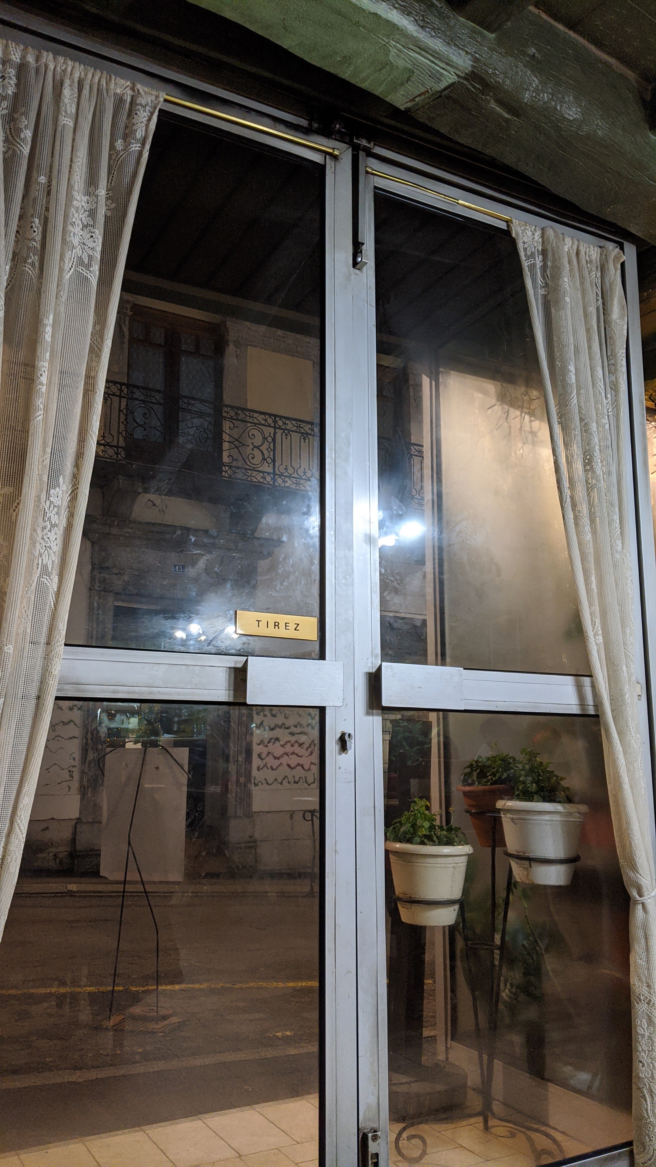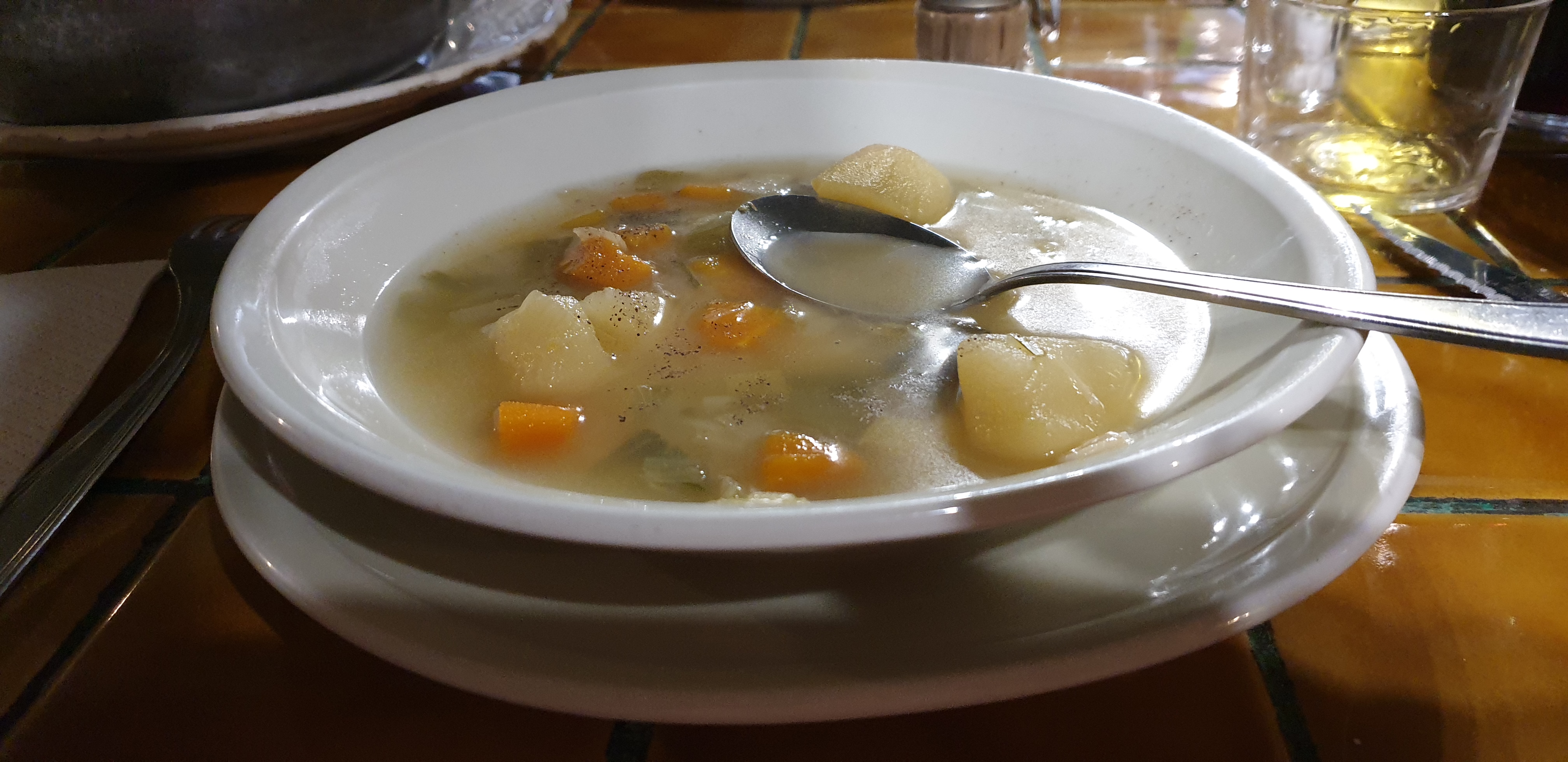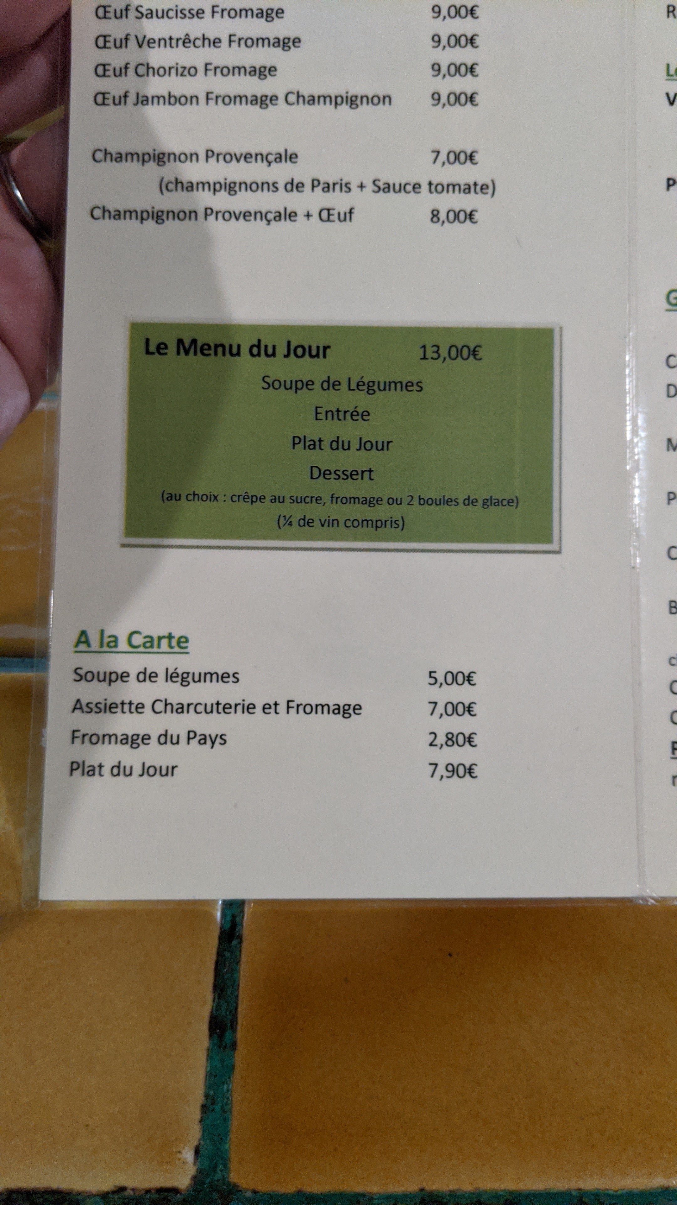 Restaurant comme chez mamie. Soupe, entrée, plat, dessert, café et vin. 13 €