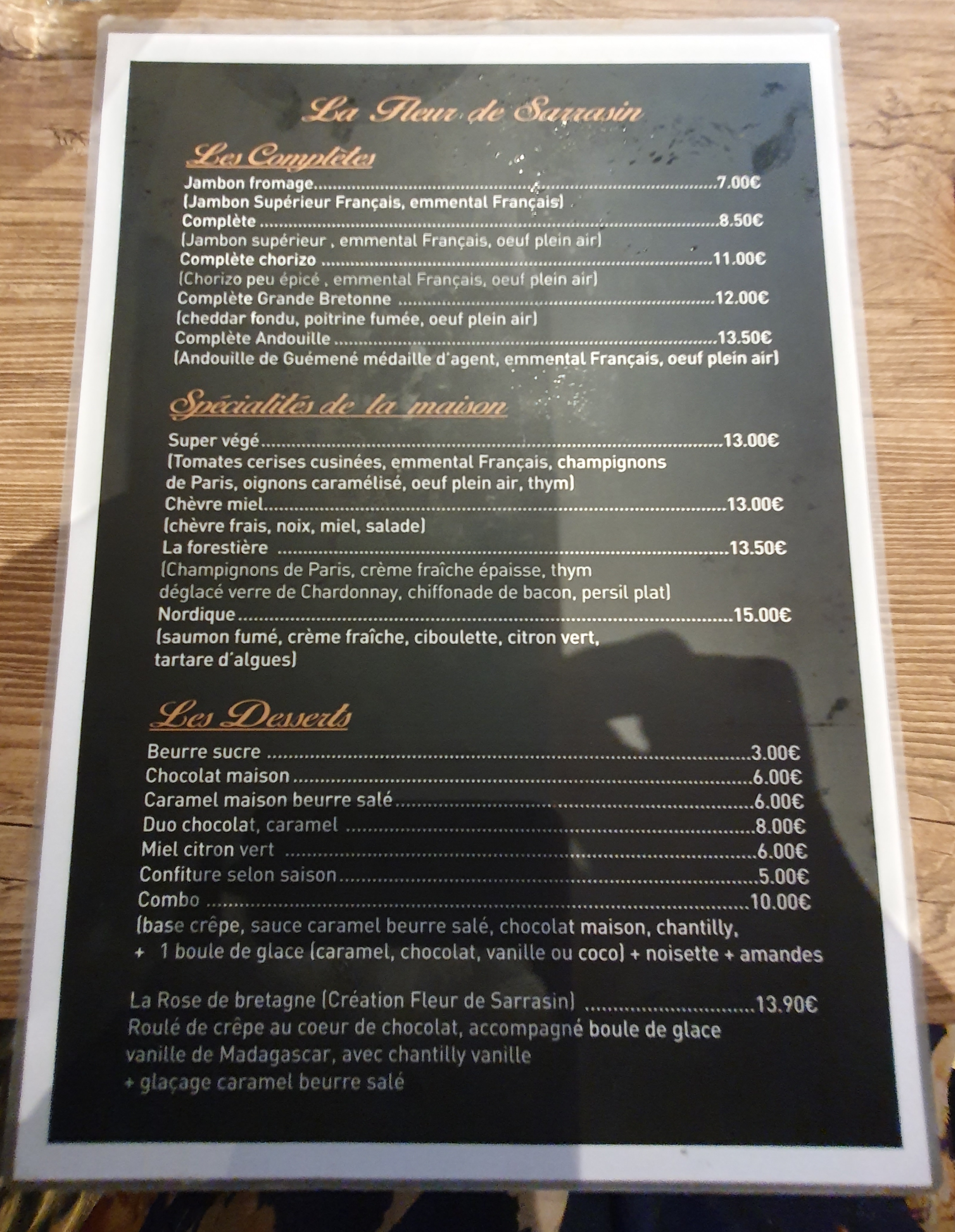 Une crêperie qui Gère ! En quête d’un restaurant et pas du coin, nous sommes tombé sur la fleur de sarrasin. Une bonne surprise ! On a eu peur dans un premier temps de ne pas être pris au vu de l’heure mais c’est passé et je leur en remercie, Les crêpes sont très bonnes, moi qui aime le chèvre miel, Ma compagne a eu un peu plus de mal car il y avait beaucoup beaucoup d’oignons caramélisés (après c’est les goûts ça 🙂). En tout cas ça nous a calé, on a fini juste avec une glace même si les desserts étaient vraiment tentant ! L’ambiance est cool, avec une terrasse et une plage en face, N’hésitez plus :).