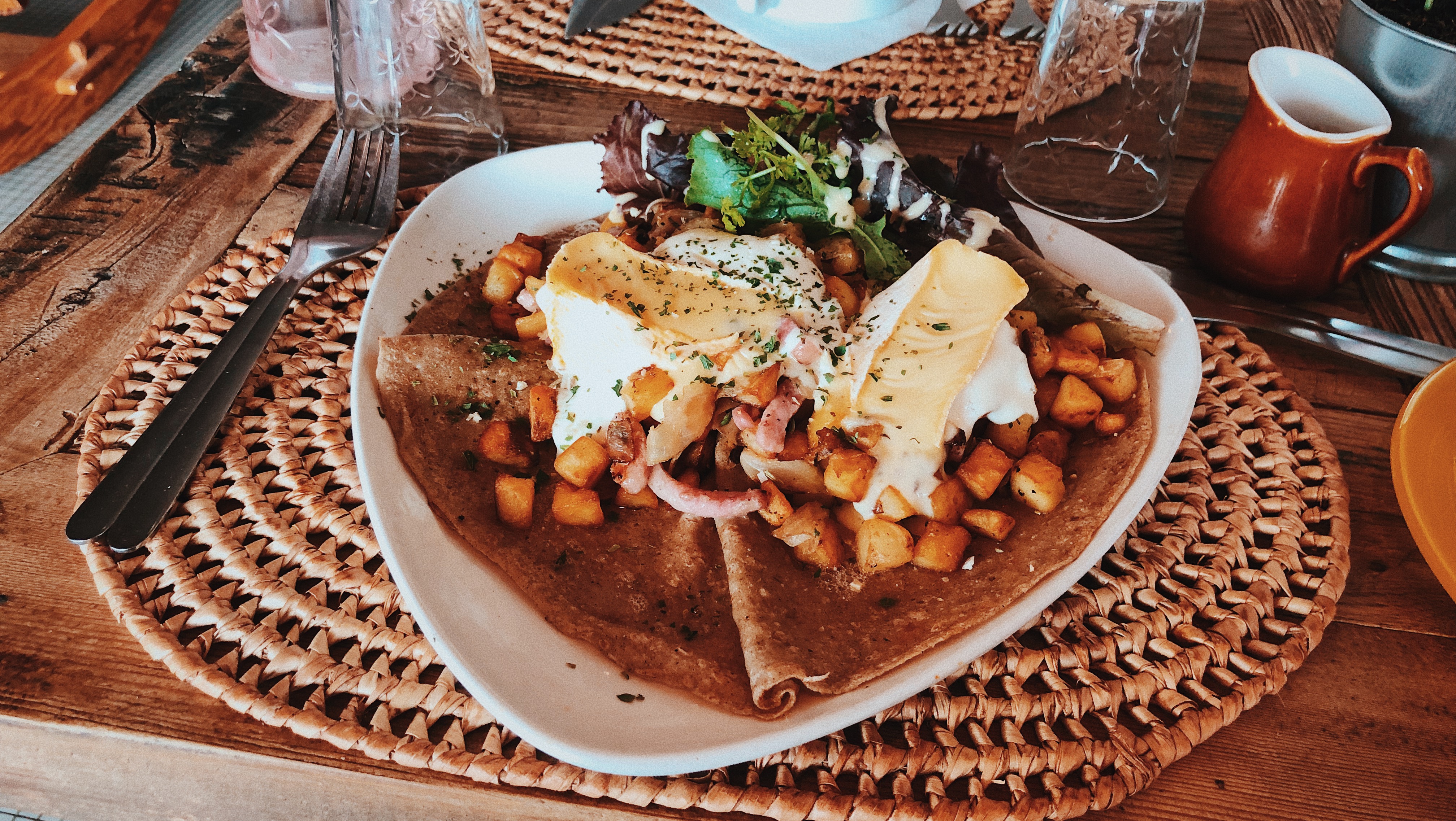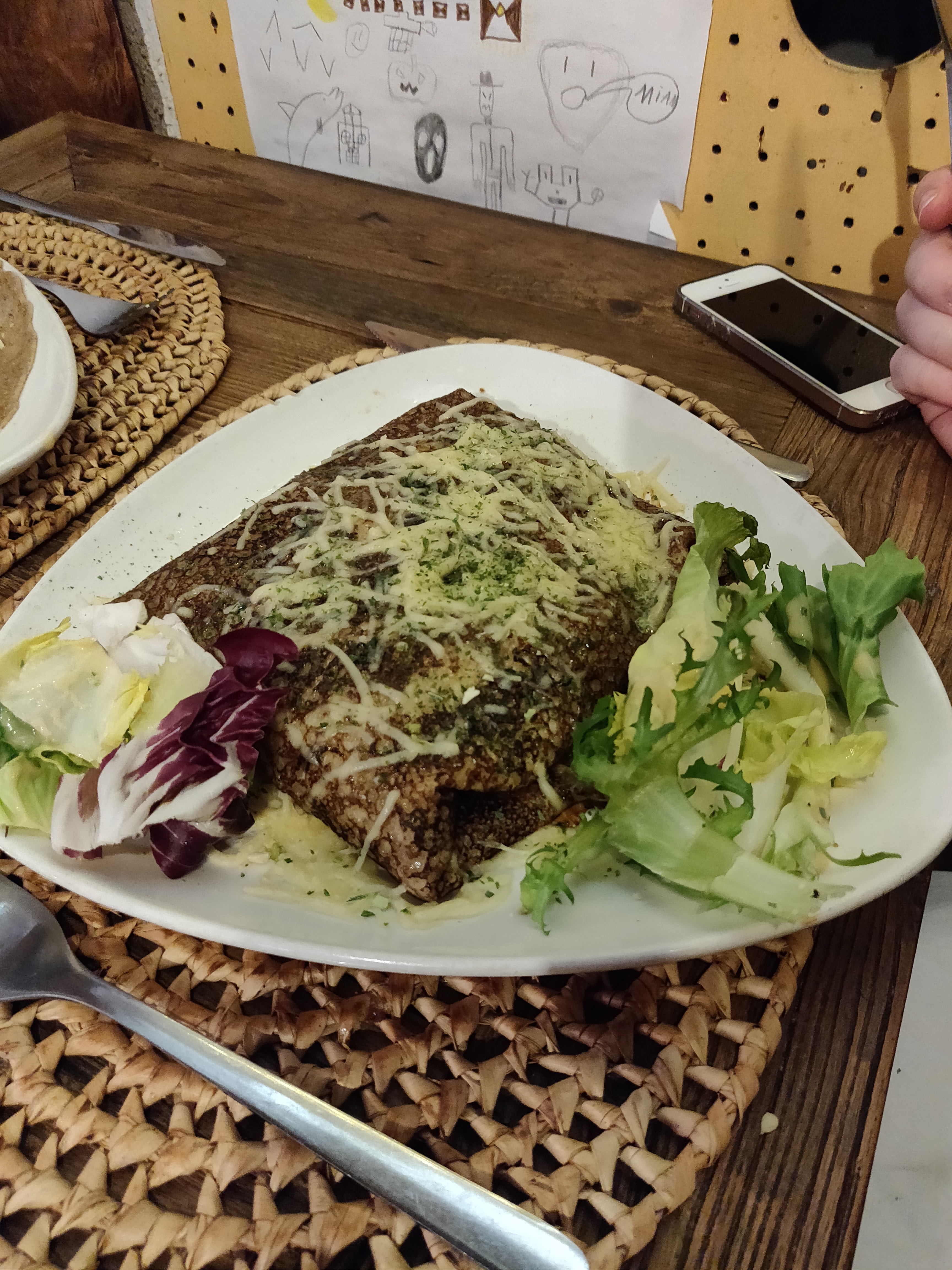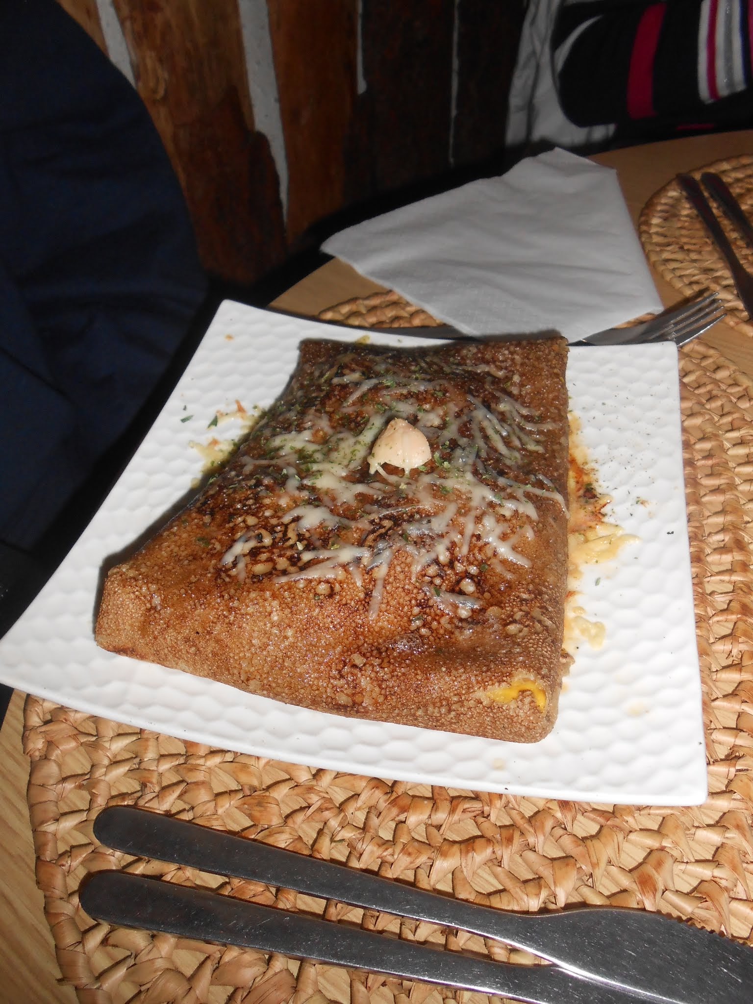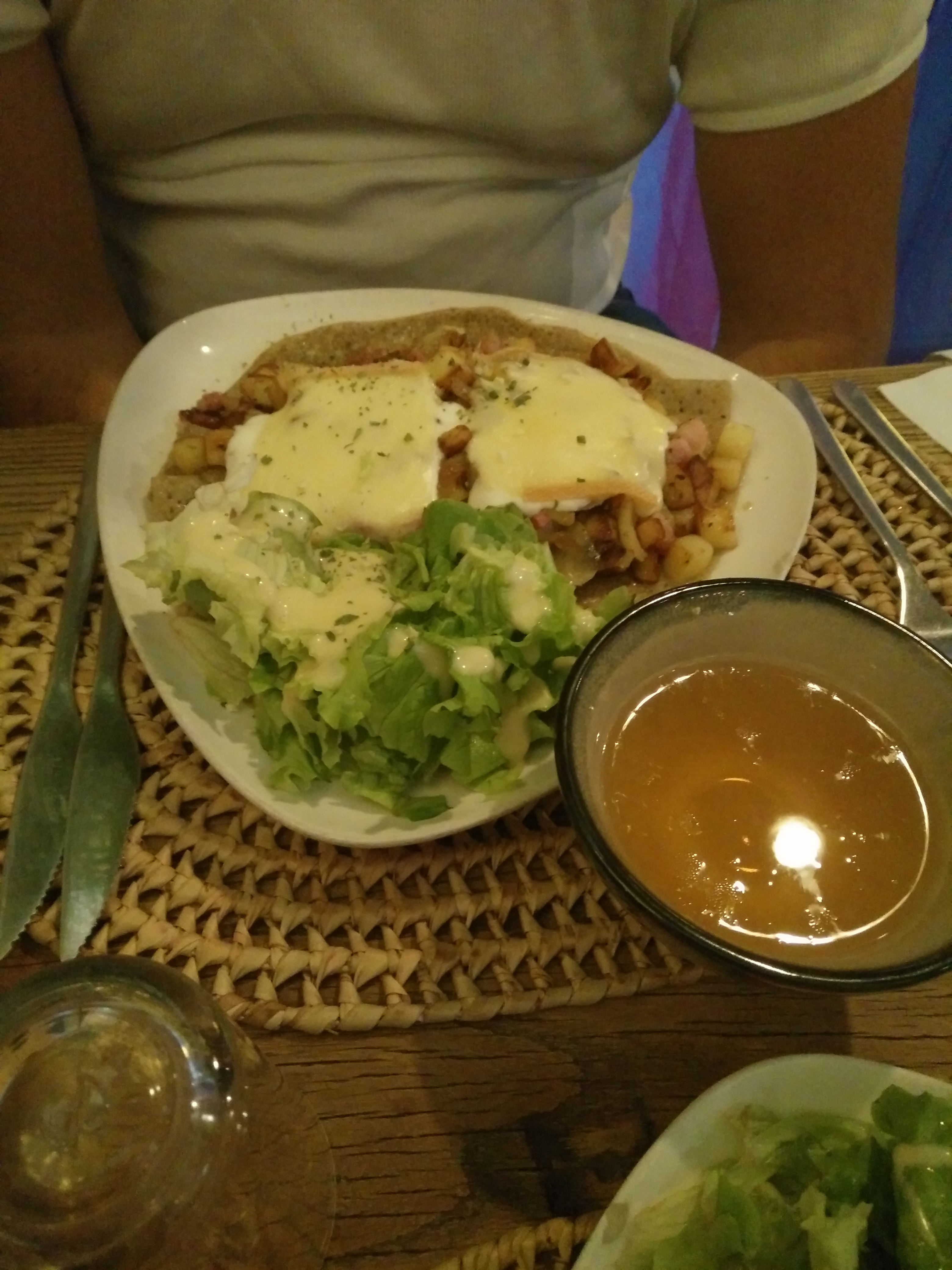 It's just disgusting. The cook has never been in Britany (homeland of crêpes) and makes them with oil ! (Crêpes are always made with salty butter) In a tasteless crêpe he puts tasteless ingredients and warmes everything in his microwave ! C'est absolument dégueulasse. Le cuistot n'a jamais mis les pieds en Bretagne et fait ses crêpes à l'huile ! Dans une crêpe froide sans aucun goût il ajoute des ingrédients sans aucune saveur et passe le tout au micro-ondes ! Sinon le décor est sympa. La seule crêperie au monde avec une balançoire !