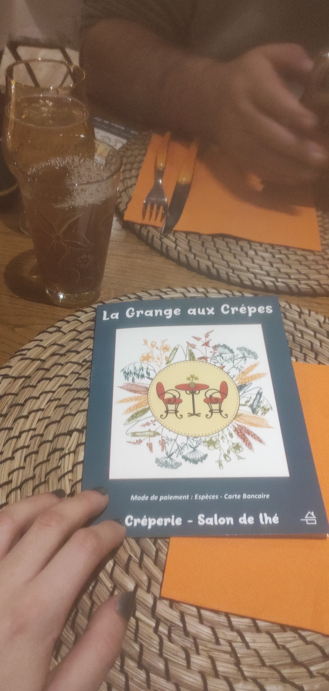 Une terrasse ombragée au soleil couchant, une ambiance familiale (tout le monde se salue 🙂) un accueil chaleureux, un service impeccable et des crêpes au blé noir et au froment qui font honneur à la Bretagne !! Une douce et joyeuse soirée à la grange aux crêpes. Je recommande 👍Aurélien, Nathalie, Didier et Corinne