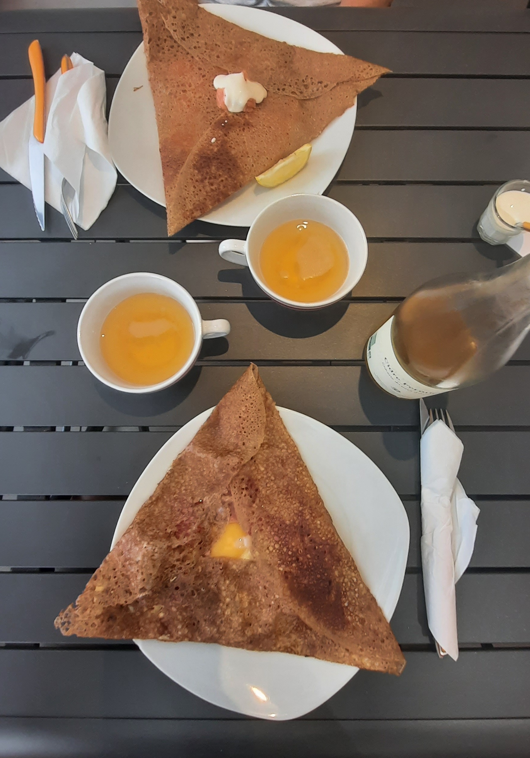 Nous avons pris le risque de réserver en extérieur malgré un temps incertain , crêperie complète en intérieur, (petite ). Et bien nous avons eu raison. L'accueil y est chaleureux, convivial, les galettes et les crêpes y sont excellentes et copieuses, accompagnées d'un cidre local bio, tout aussi excellent. Un très bon moment.