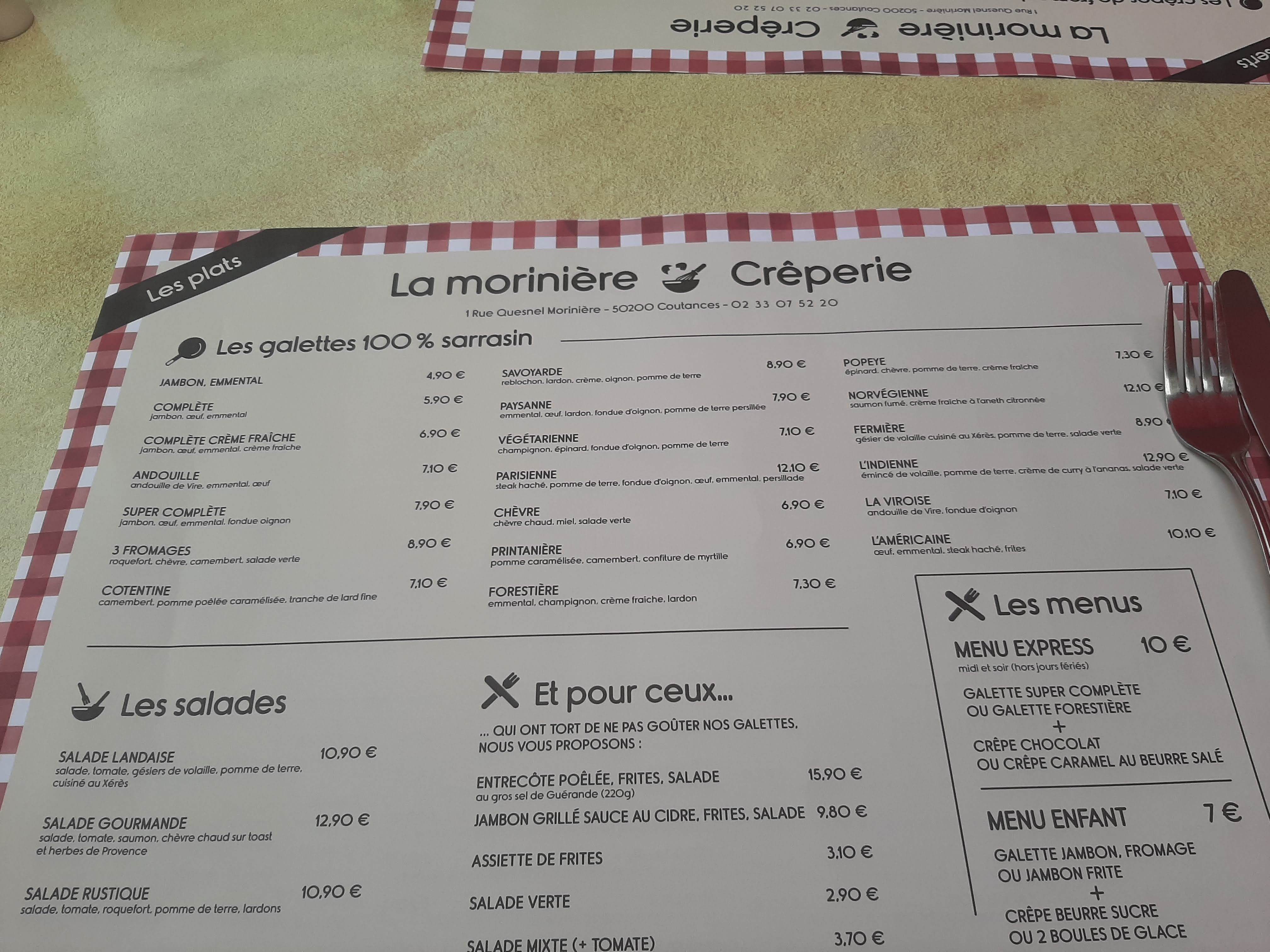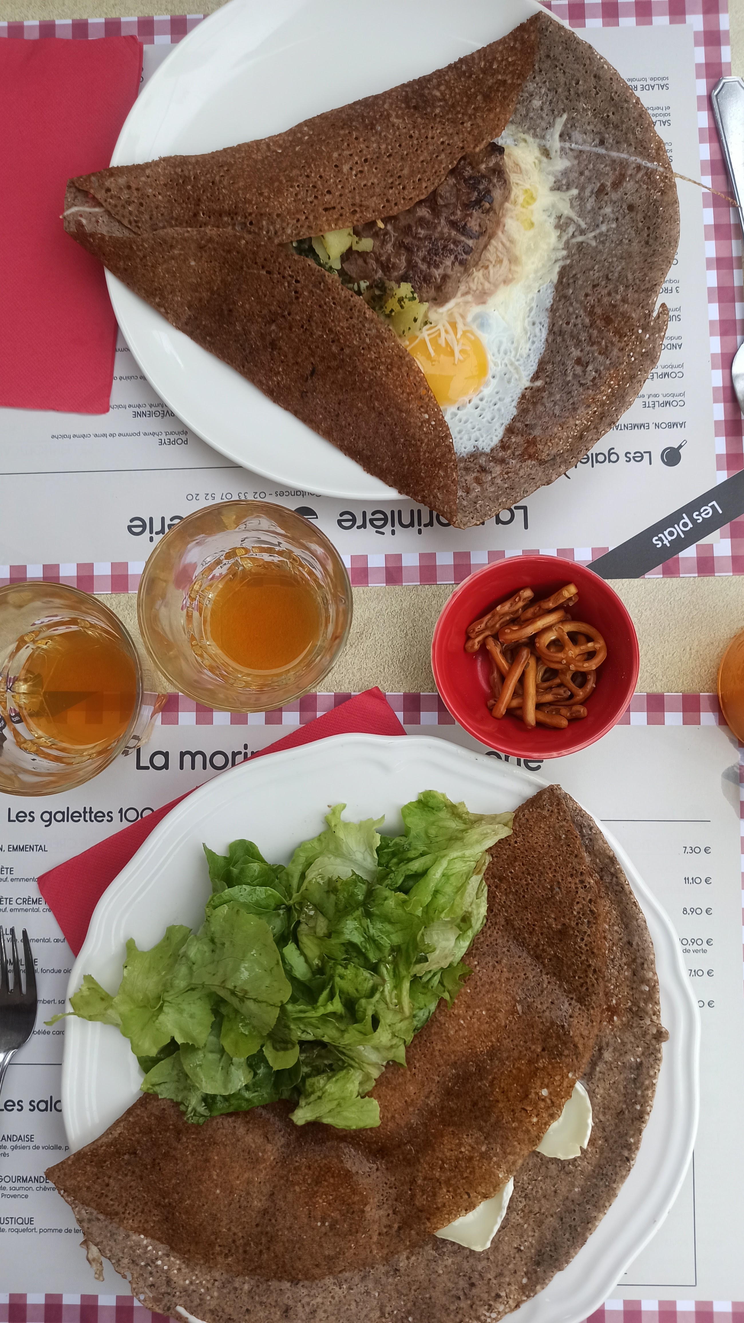 Nous avons à la crêperie La Moriniere. Les galettes chèvre miel sont un régal et les crêpes au caramel sont très bonnes. La serveuse est à notre écoute e tout ça avec le sourire en permanence. Nous y retournerons c'est certain