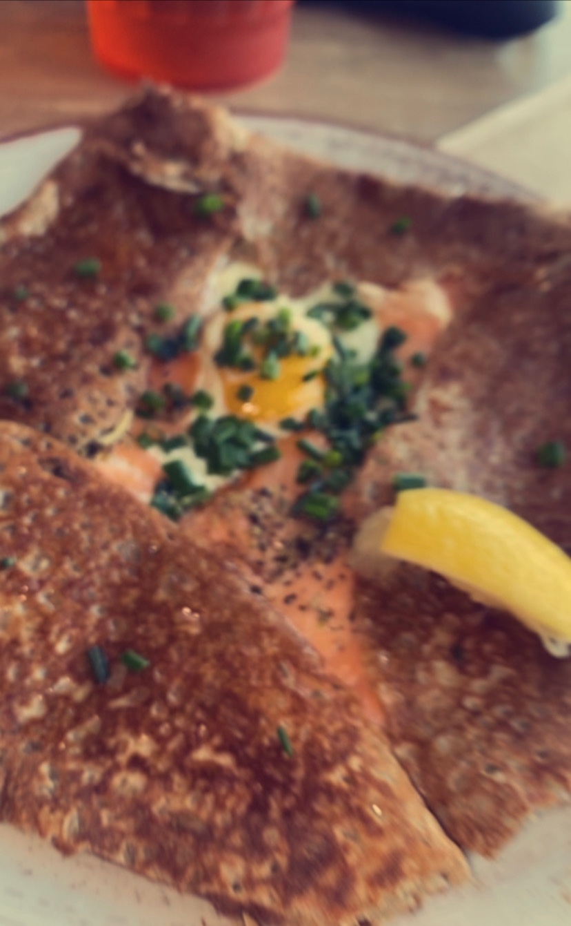 Petit déjeuner tous les matins de nos vacances,face à la mer. Très agréable et staff très sympathique! Galettes bonnes ,mais pas très fournies et attention à celles aux poireaux,ça croustille un peu sous la dent. Crêpes très bonne. Je recommande tout de même !