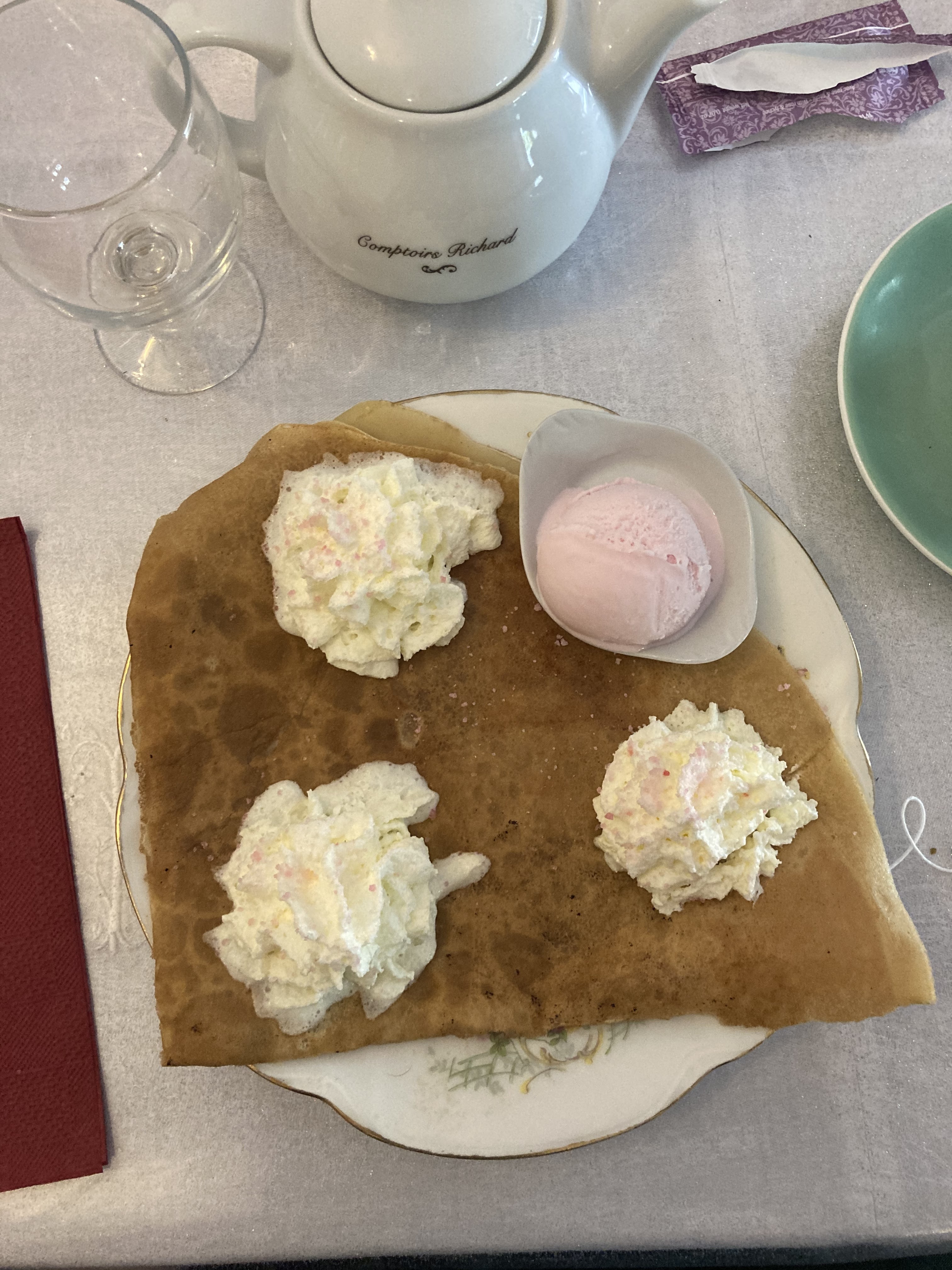 Galette du moment très bonne et glace à la violette à tomber...et très belle découverte du blanc moelleux de la cave du Vin du Tsar 🙃
