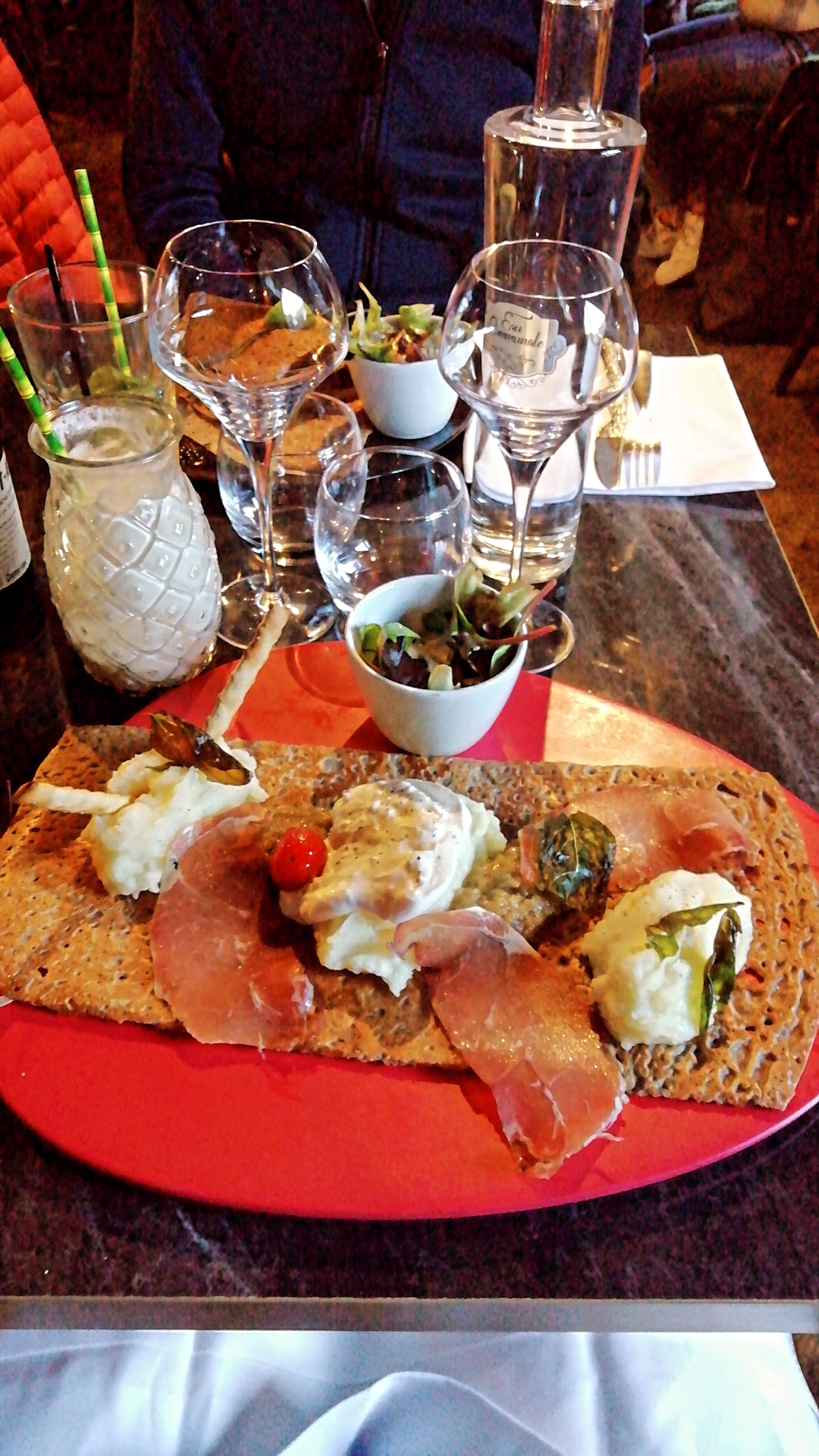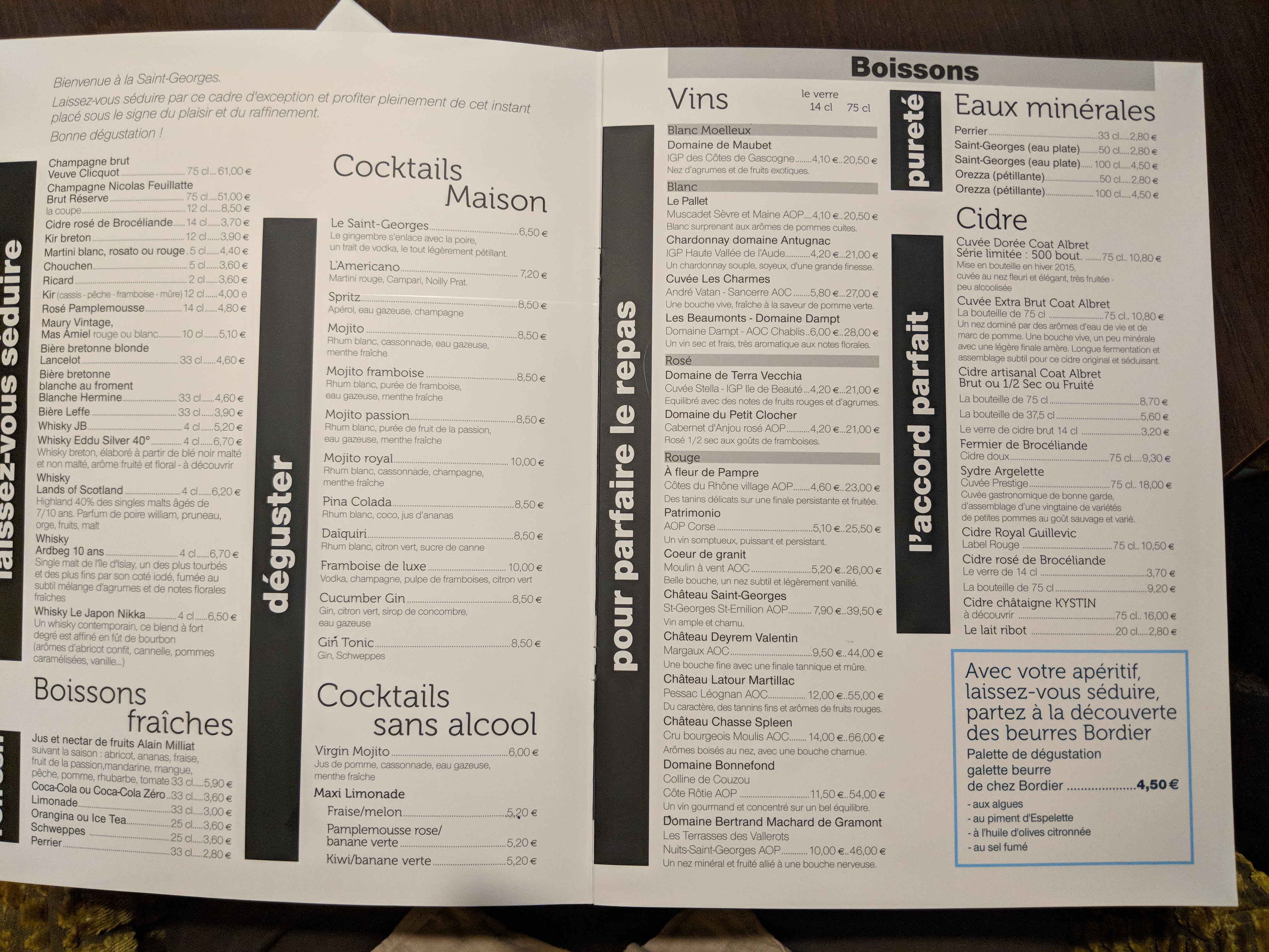 Malgré une déco non conventionnelle et des noms de galettes sympathiques. Les tarifs restent un peu élevés. Sur les softs, cela manque d'originalité. Virgin mojito au jus de pomme intéressant, dommage que le granité omniprésent dans le mocktail ne soit pas un granité de pommes pour y amener une originalité supplémentaire. Mais cette crêperie reste tout de même un endroit à faire. NB : pensez à réserver 😉.