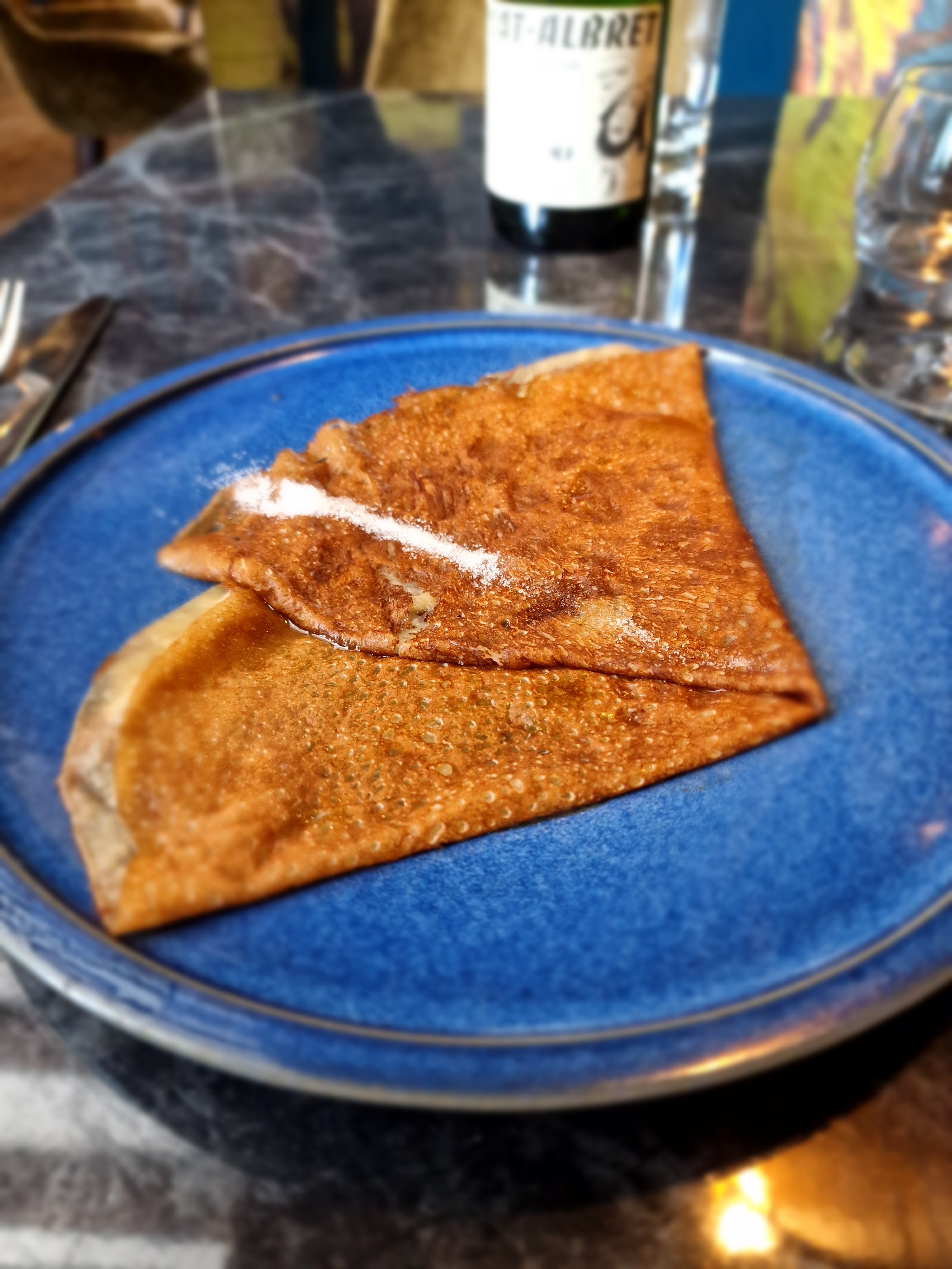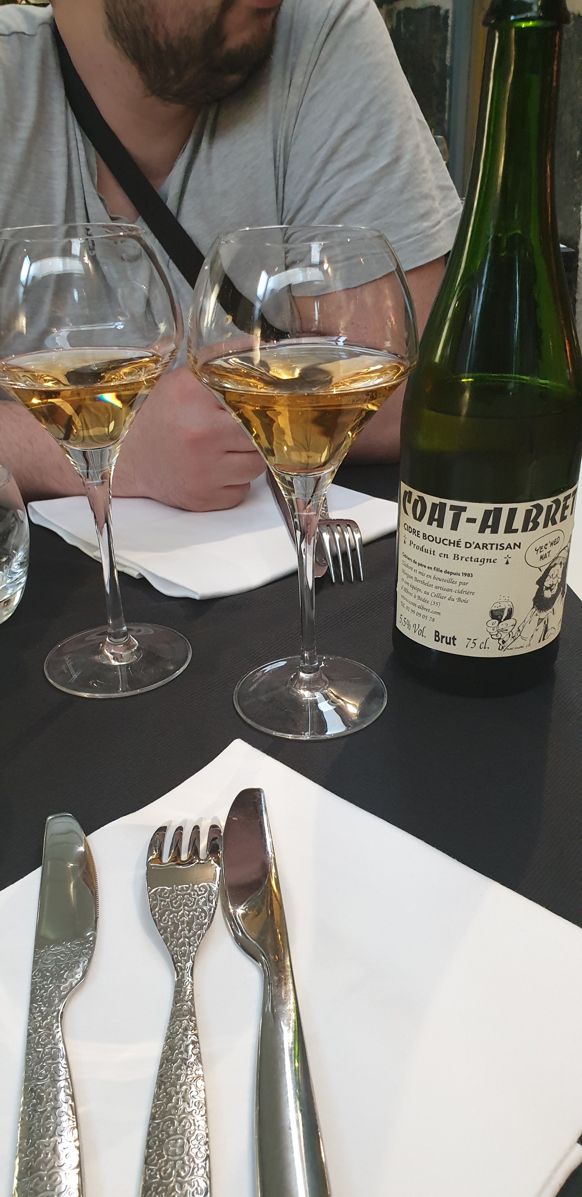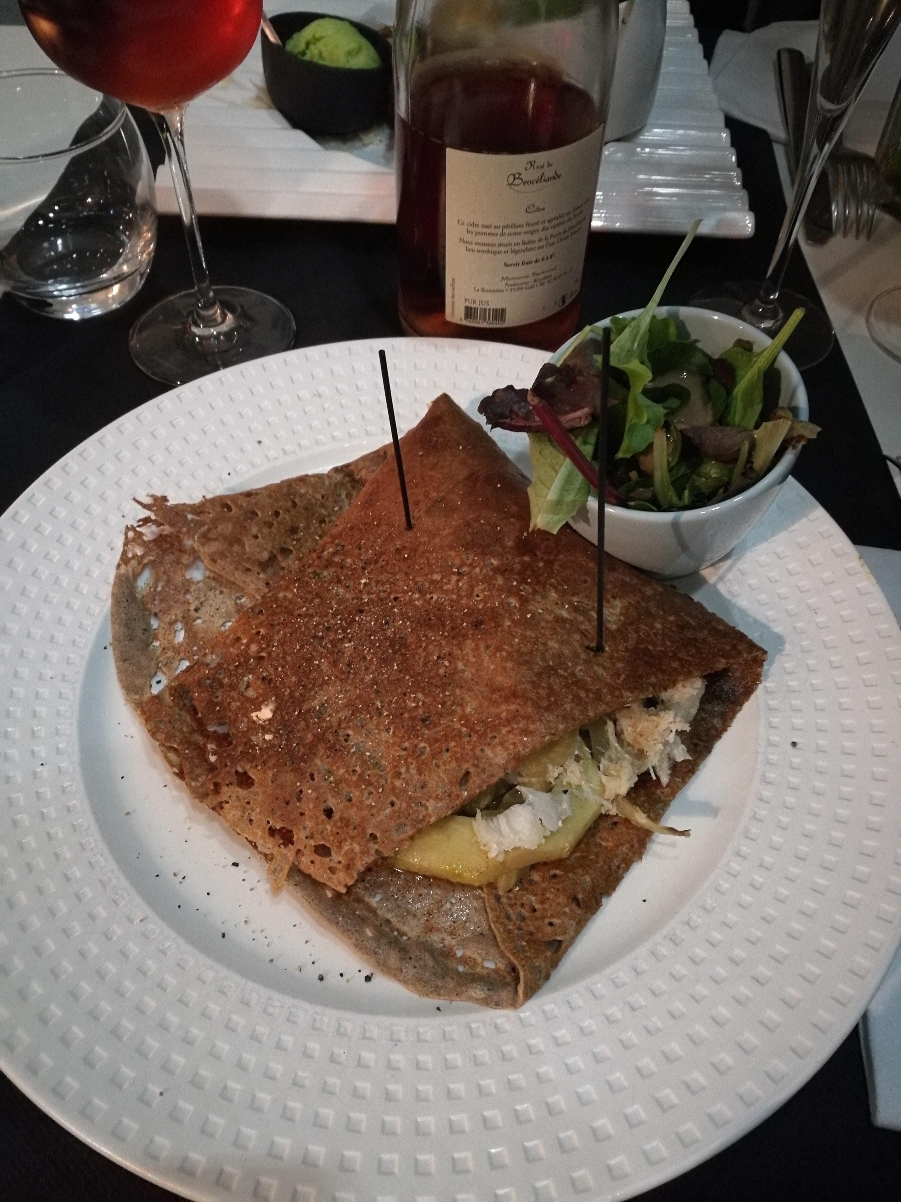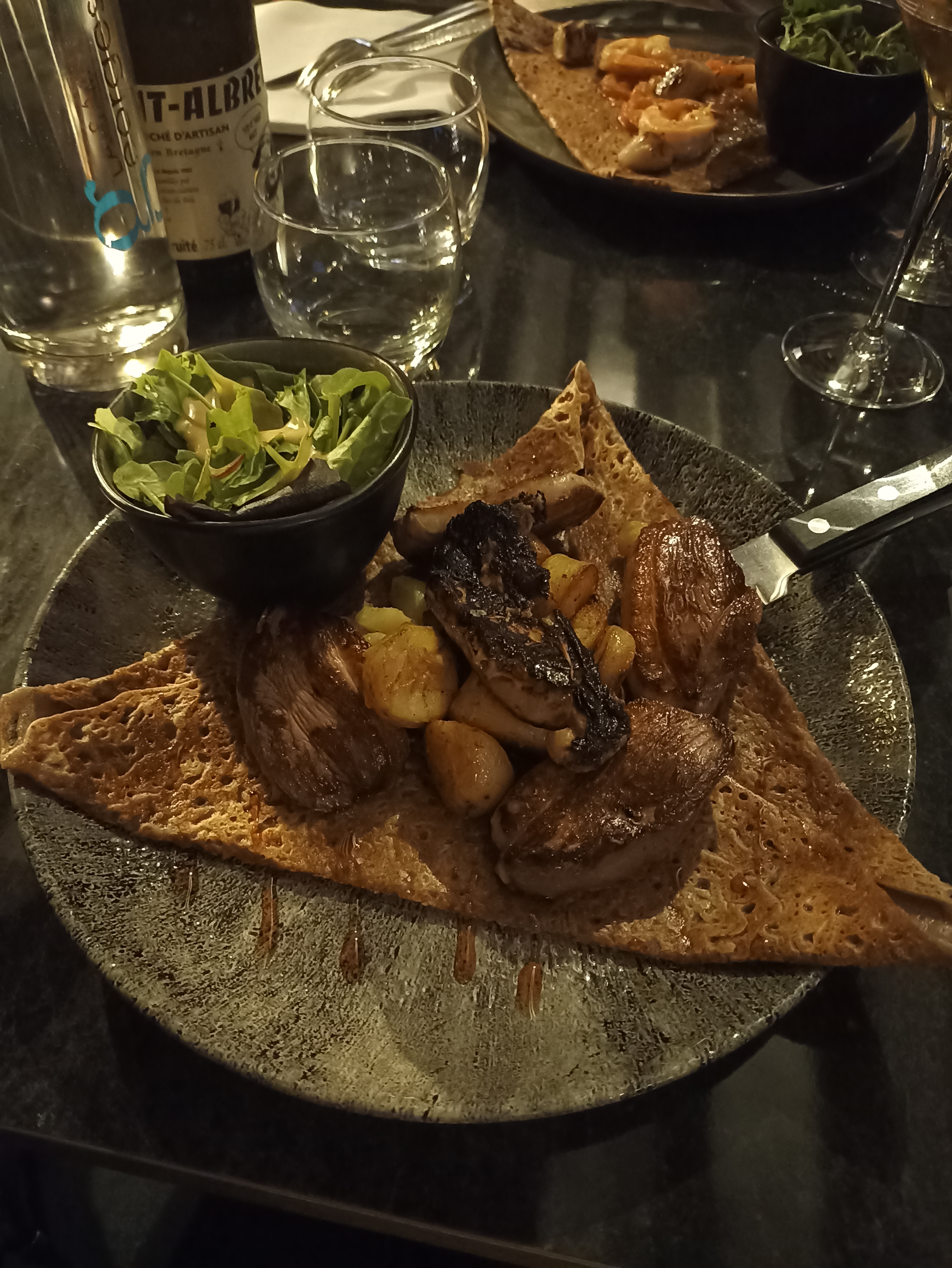 Des recettes qui sortent de la tradition pour de bonnes raisons. J'ai choisi une galette chair de tourteau, artichaut, délicatement parfumée au citron confit et fenouil. Un cidre artisanal très brut, très franc et vraiment très bon avec ça, c'était parfait. Et une crêpe beurre sucre, juste assez sucrée, très bonne soirée.