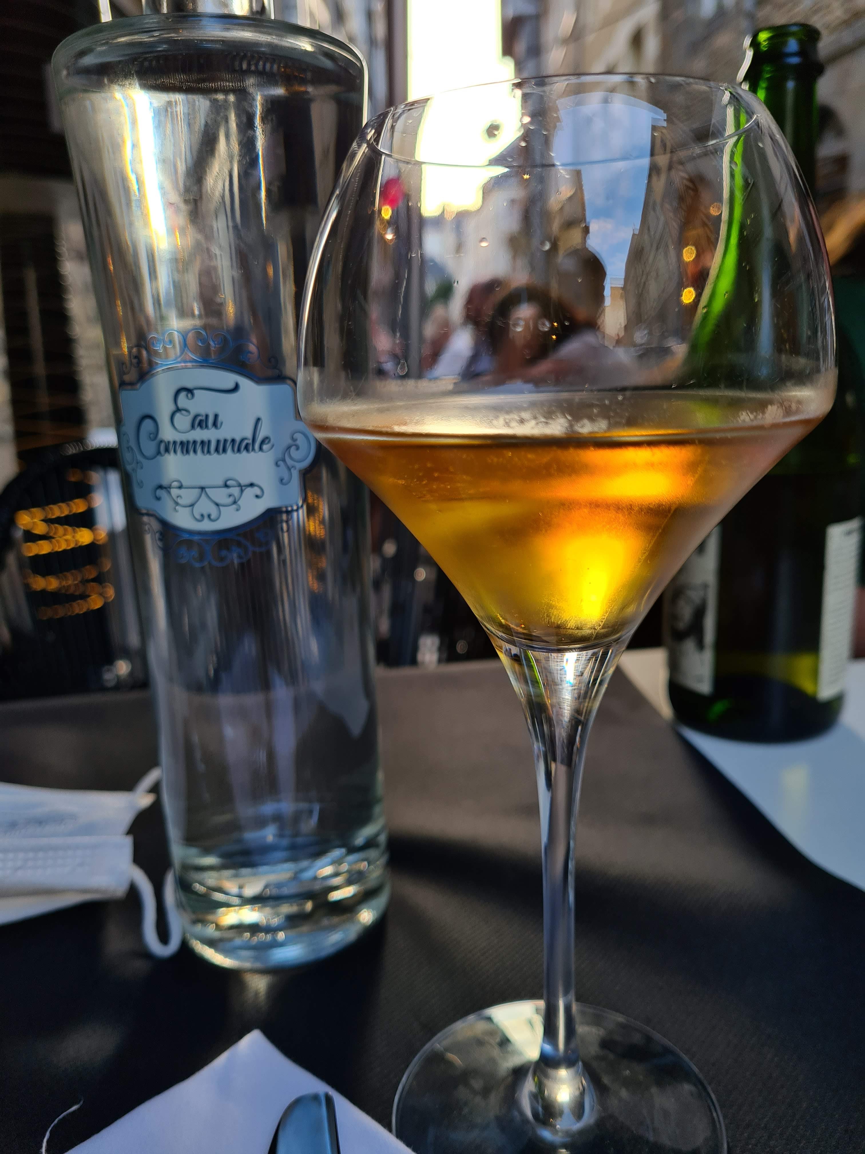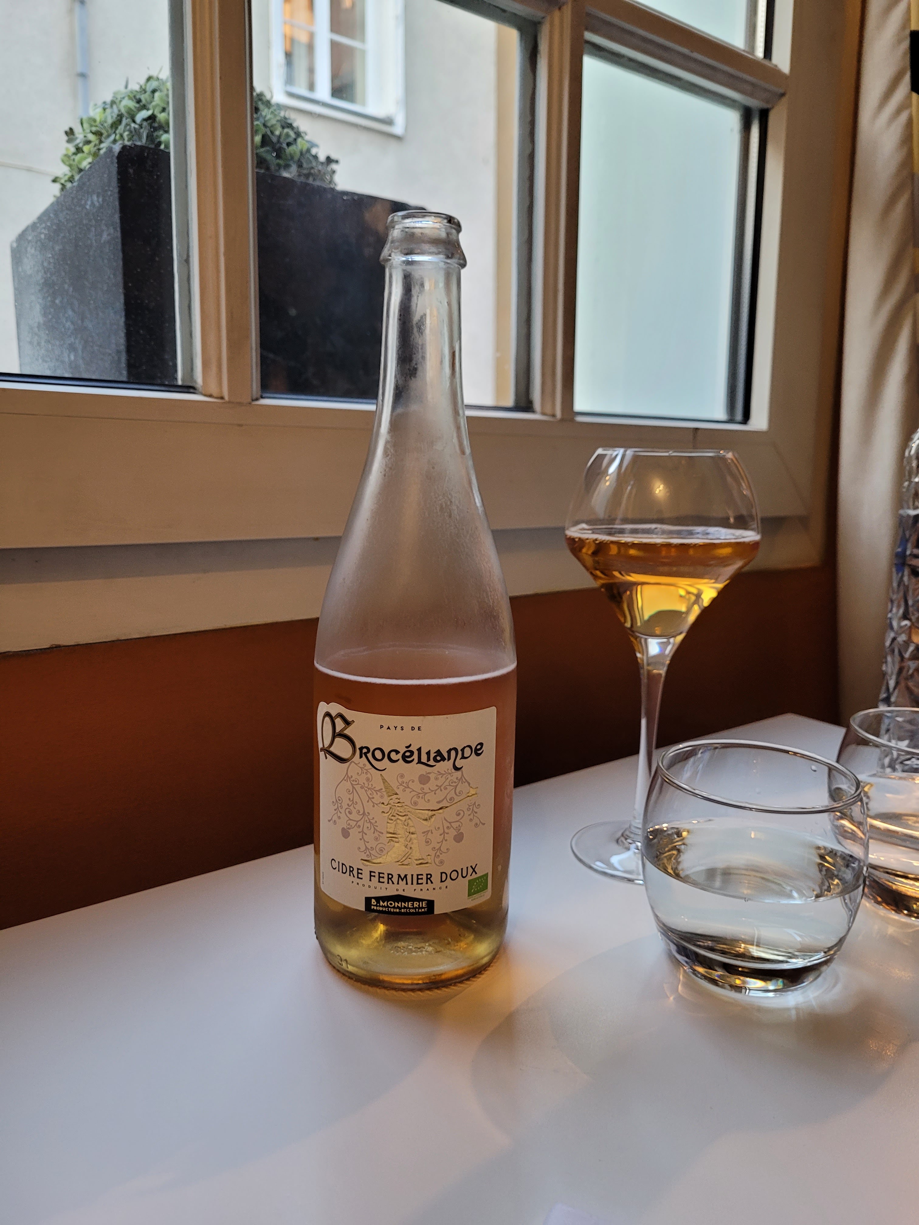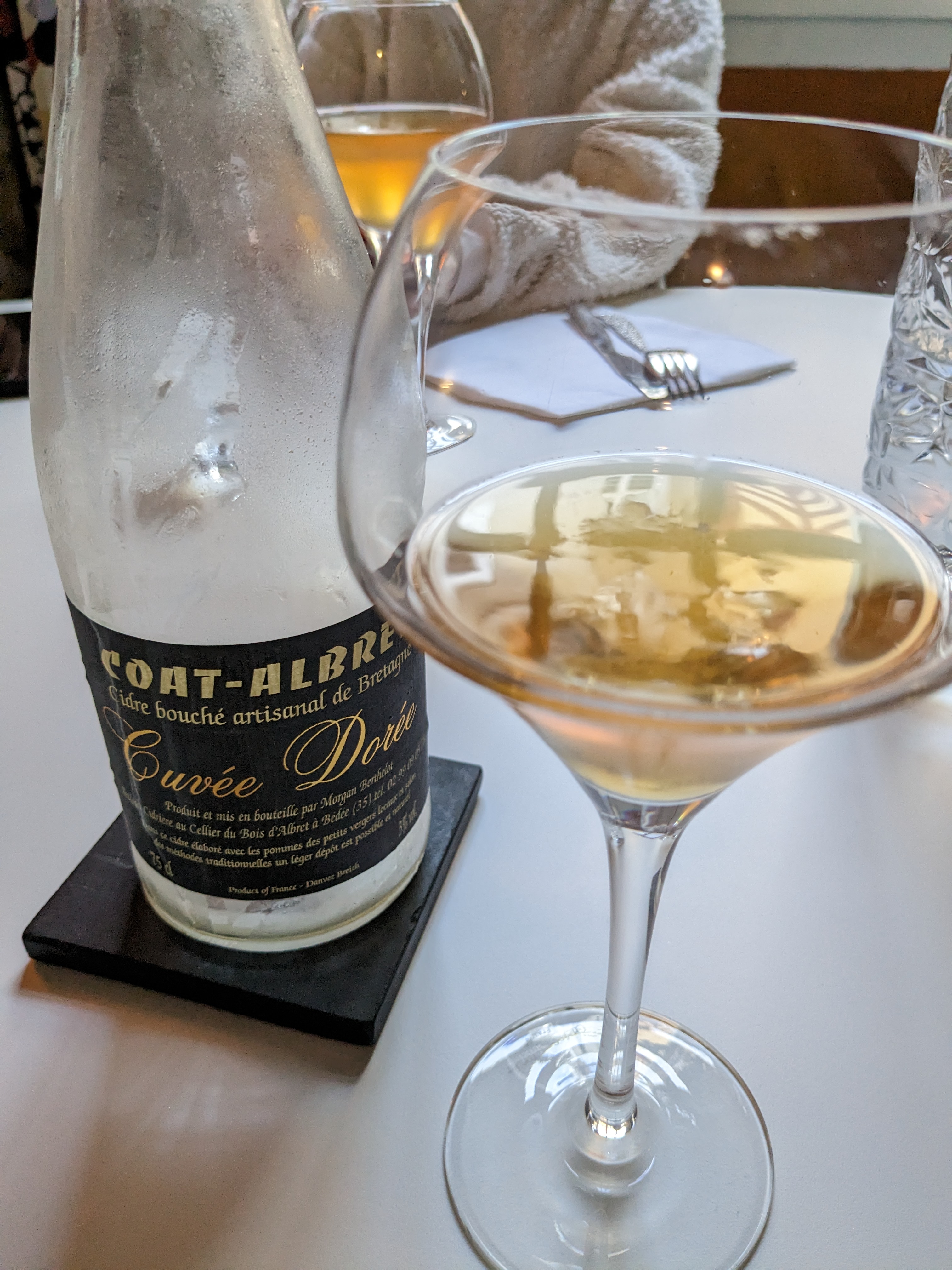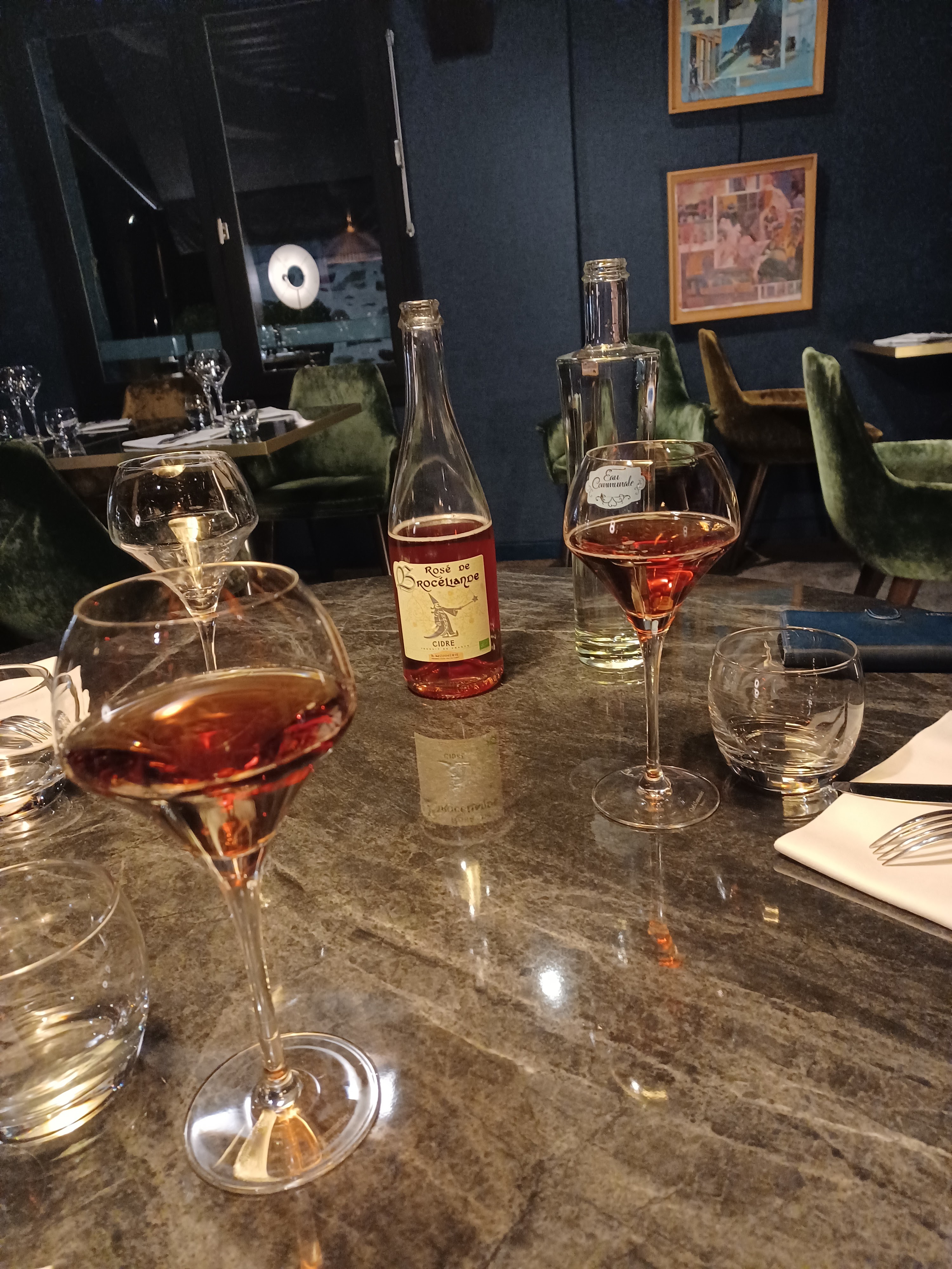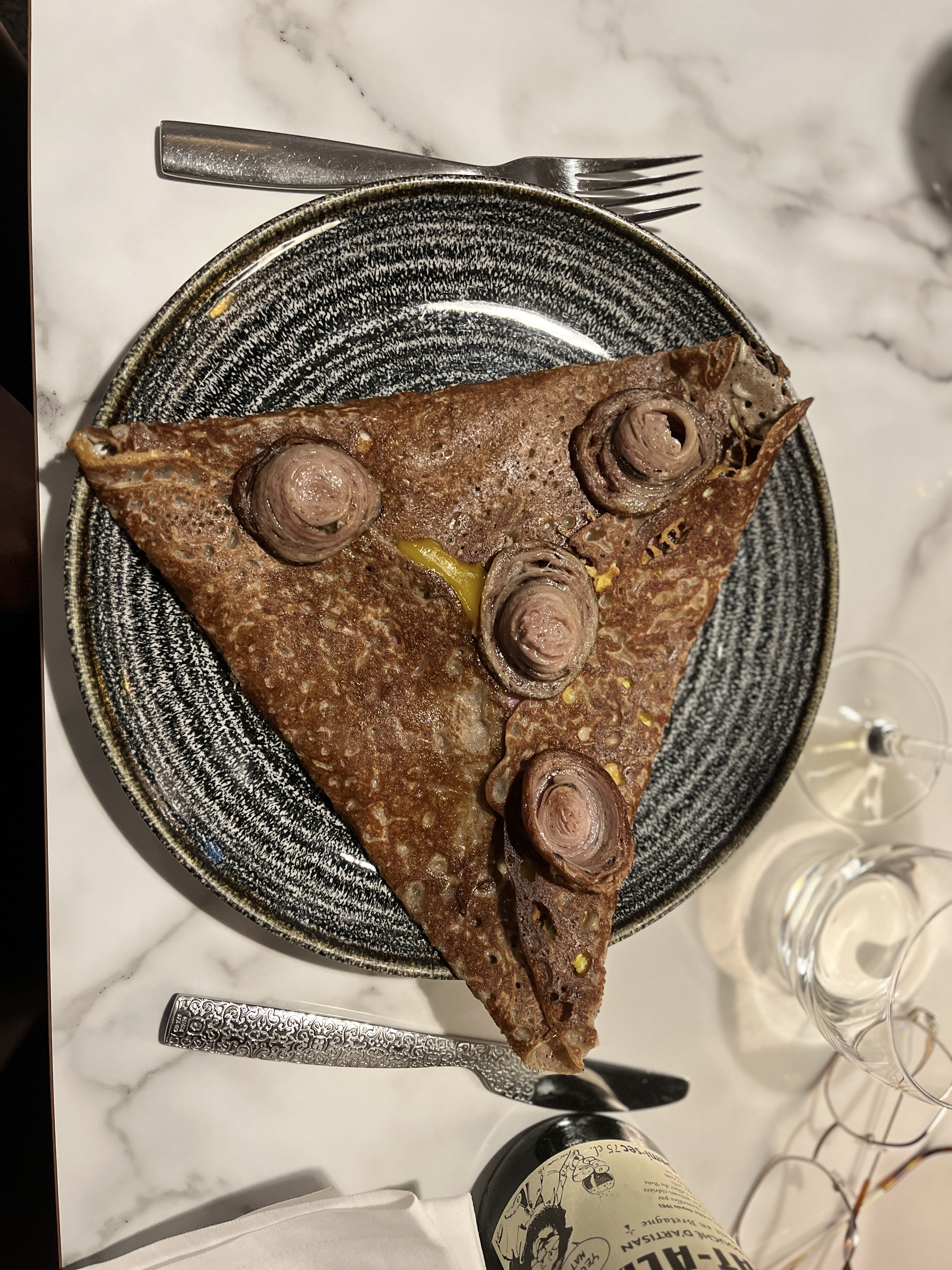 Des recettes qui sortent de la tradition pour de bonnes raisons. J'ai choisi une galette chair de tourteau, artichaut, délicatement parfumée au citron confit et fenouil. Un cidre artisanal très brut, très franc et vraiment très bon avec ça, c'était parfait. Et une crêpe beurre sucre, juste assez sucrée, très bonne soirée.
