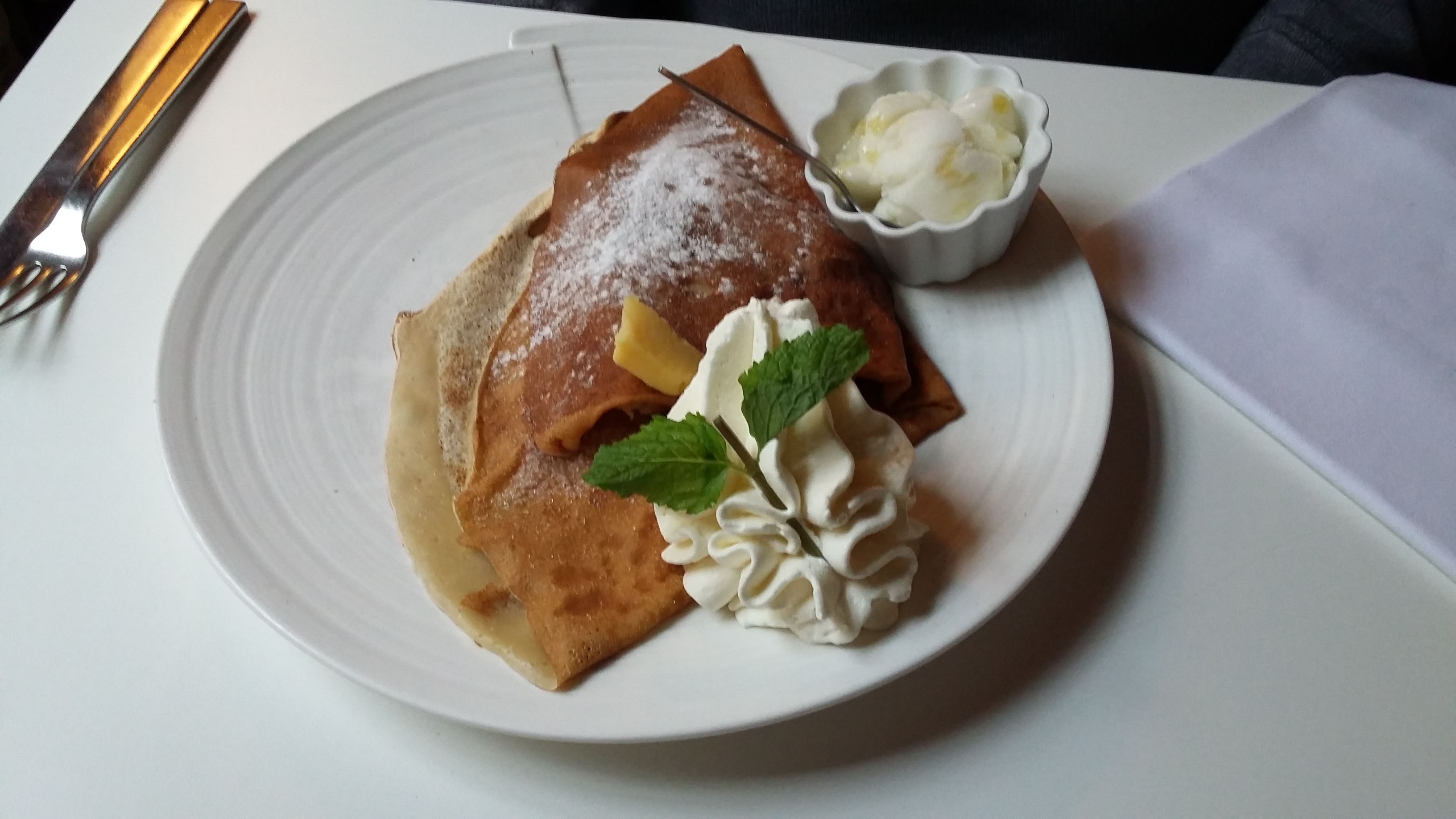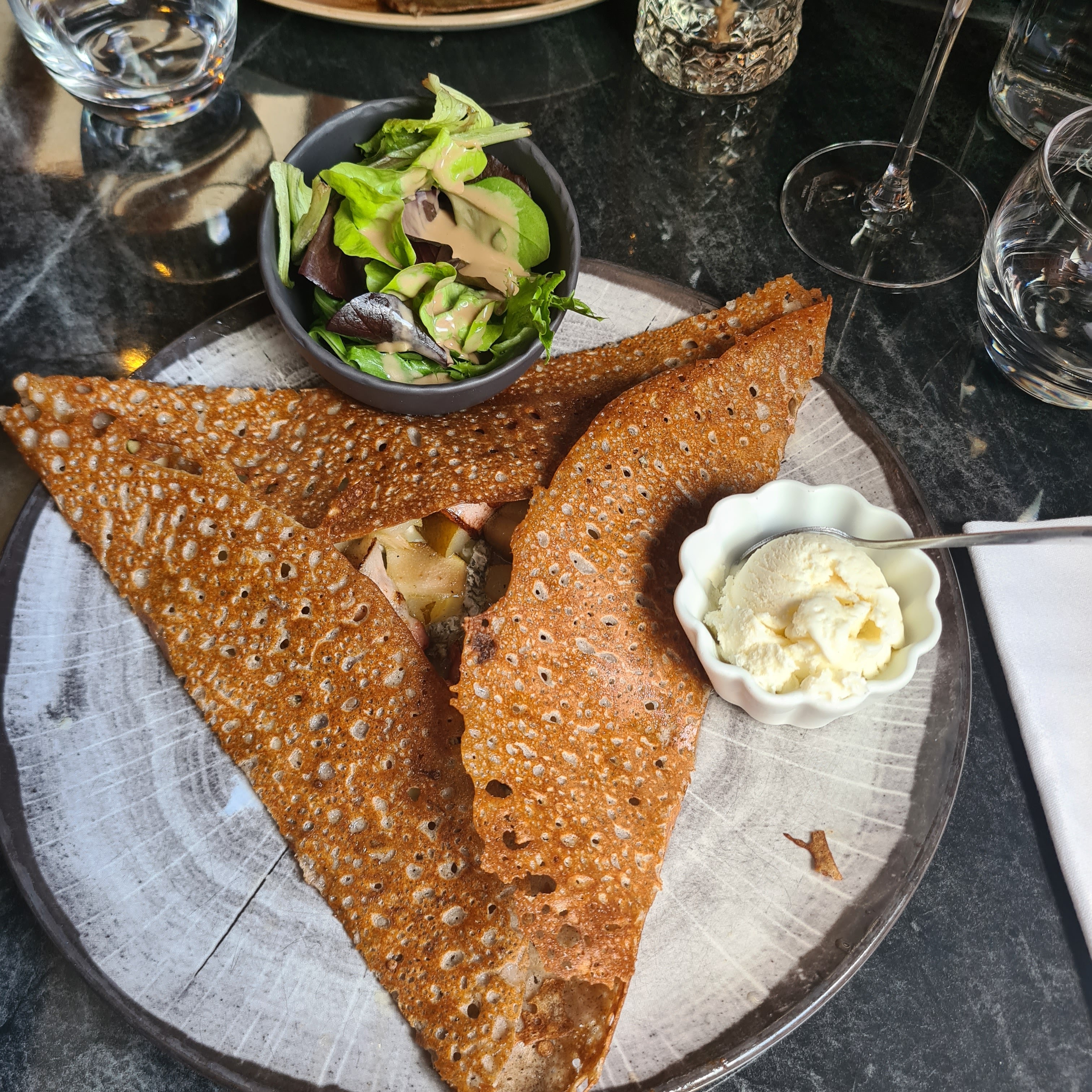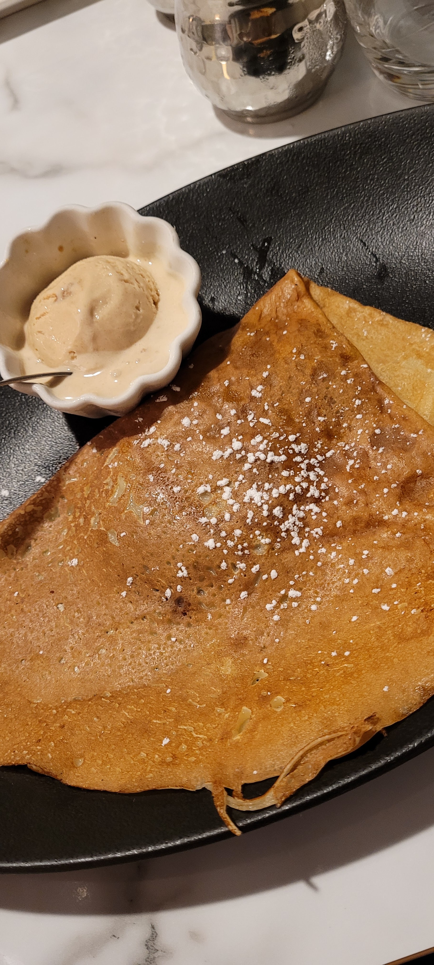 Excellente service, crêpes originales mais quantités pas énormes. Servies avec un délicieux accompagnement (glace salé+salade).ambiance légèrement chic.