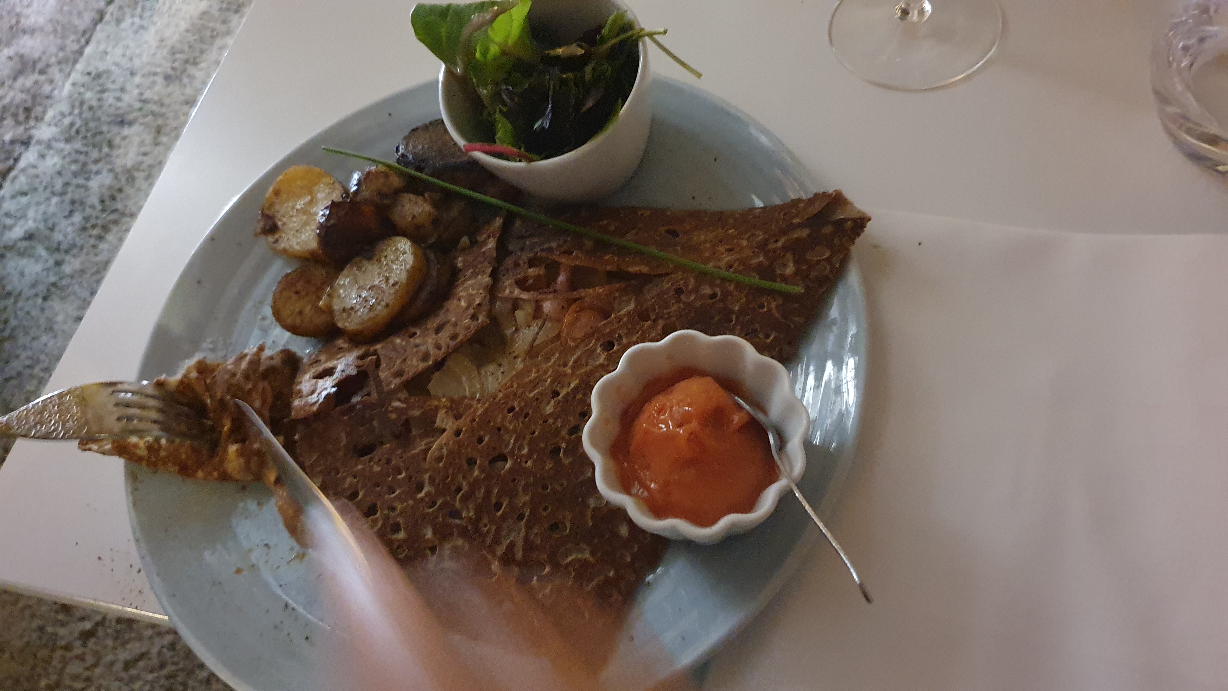 Tout était parfait ! Le cadre etait magnifique, avec un esprit chaleureux et moderne qui vous poussera à la détente. La nourriture était excellente et originale pour des galettes, vous retrouvez une cuisine élaborée à un prix certe plus élevé que la norme mais raisonnable au vu de la qualité des produits. Pour finir le service a été rapide et adapté à nos attentes. Nous recommandons vivement ce restaurant.