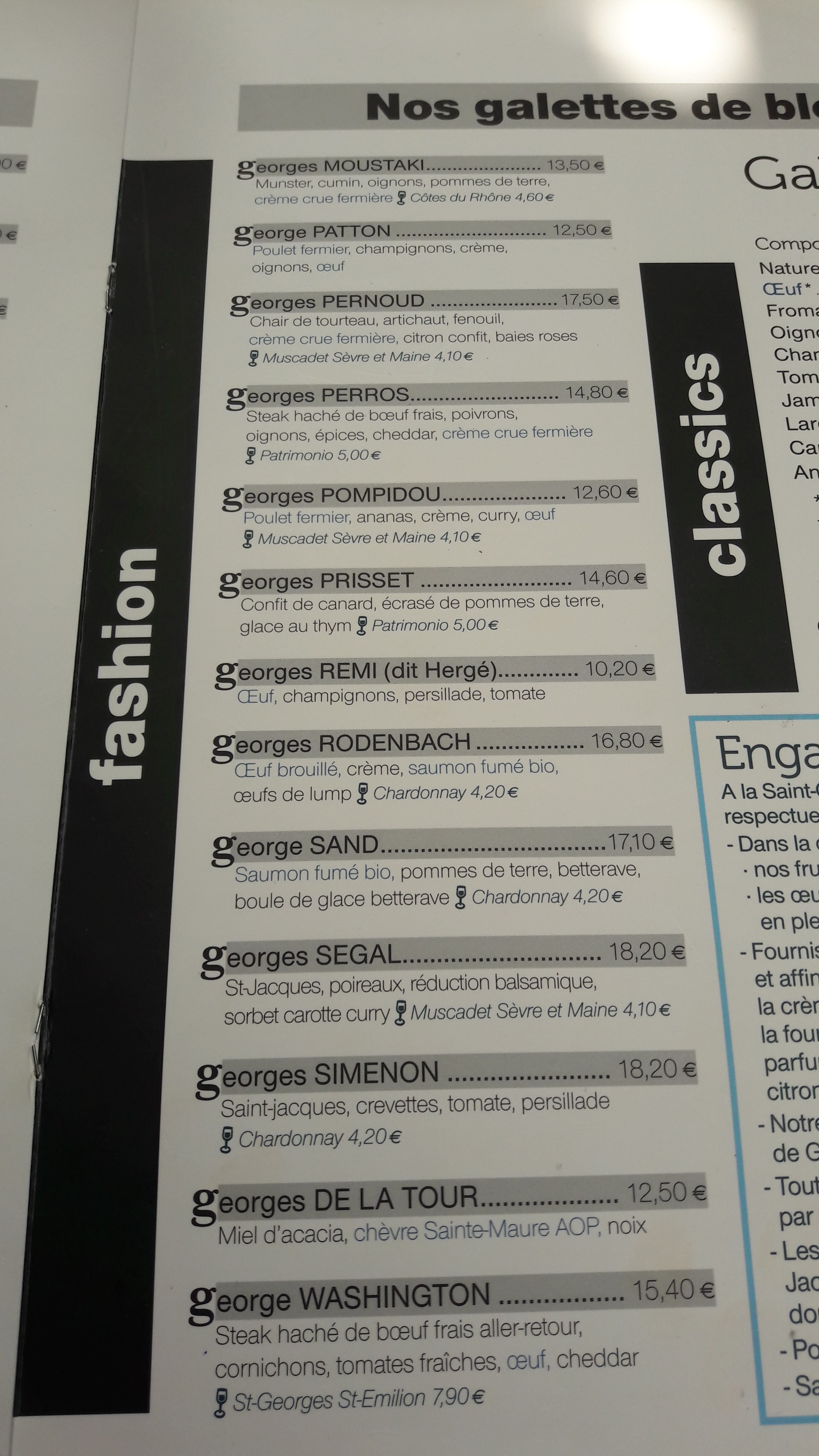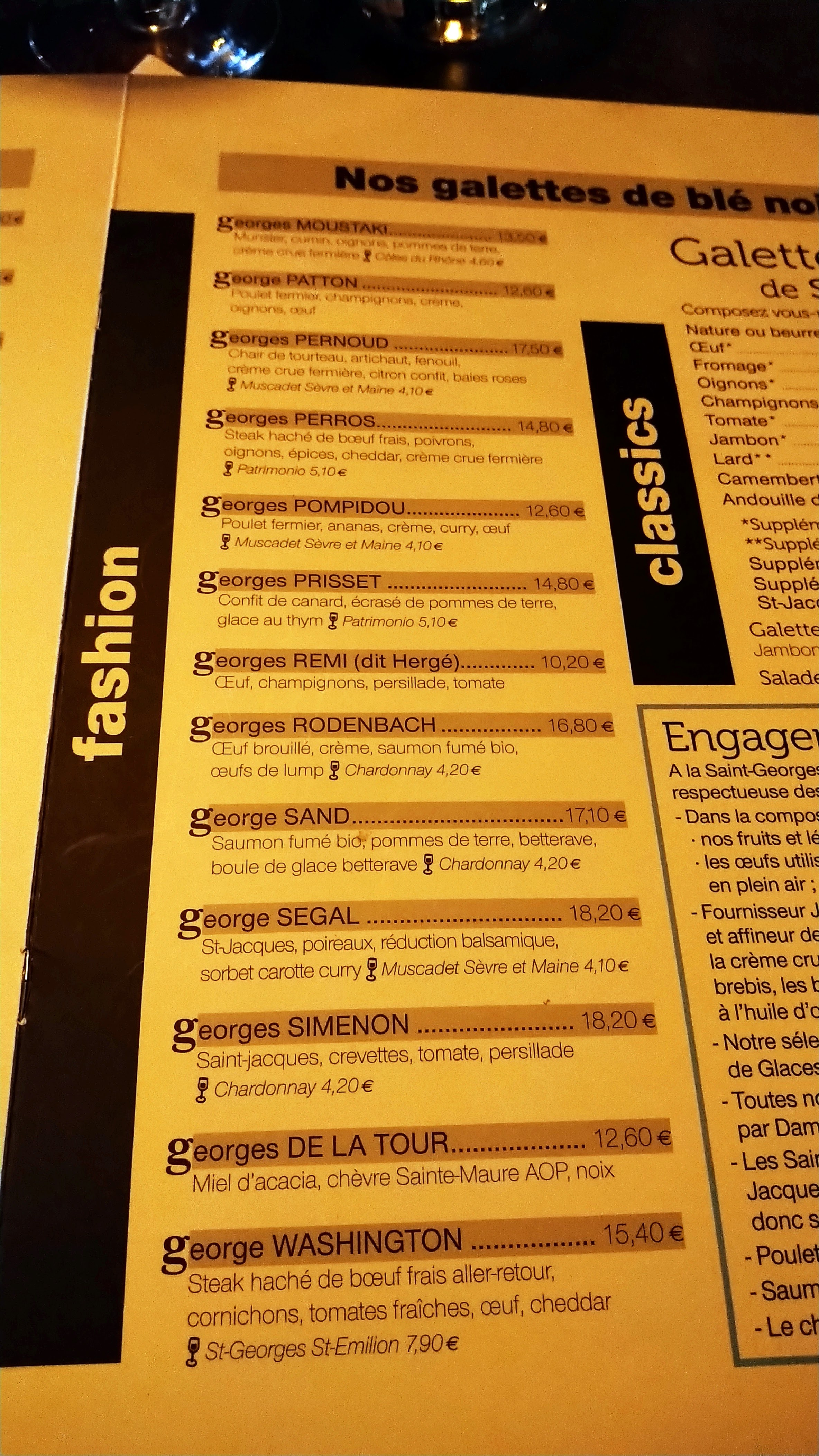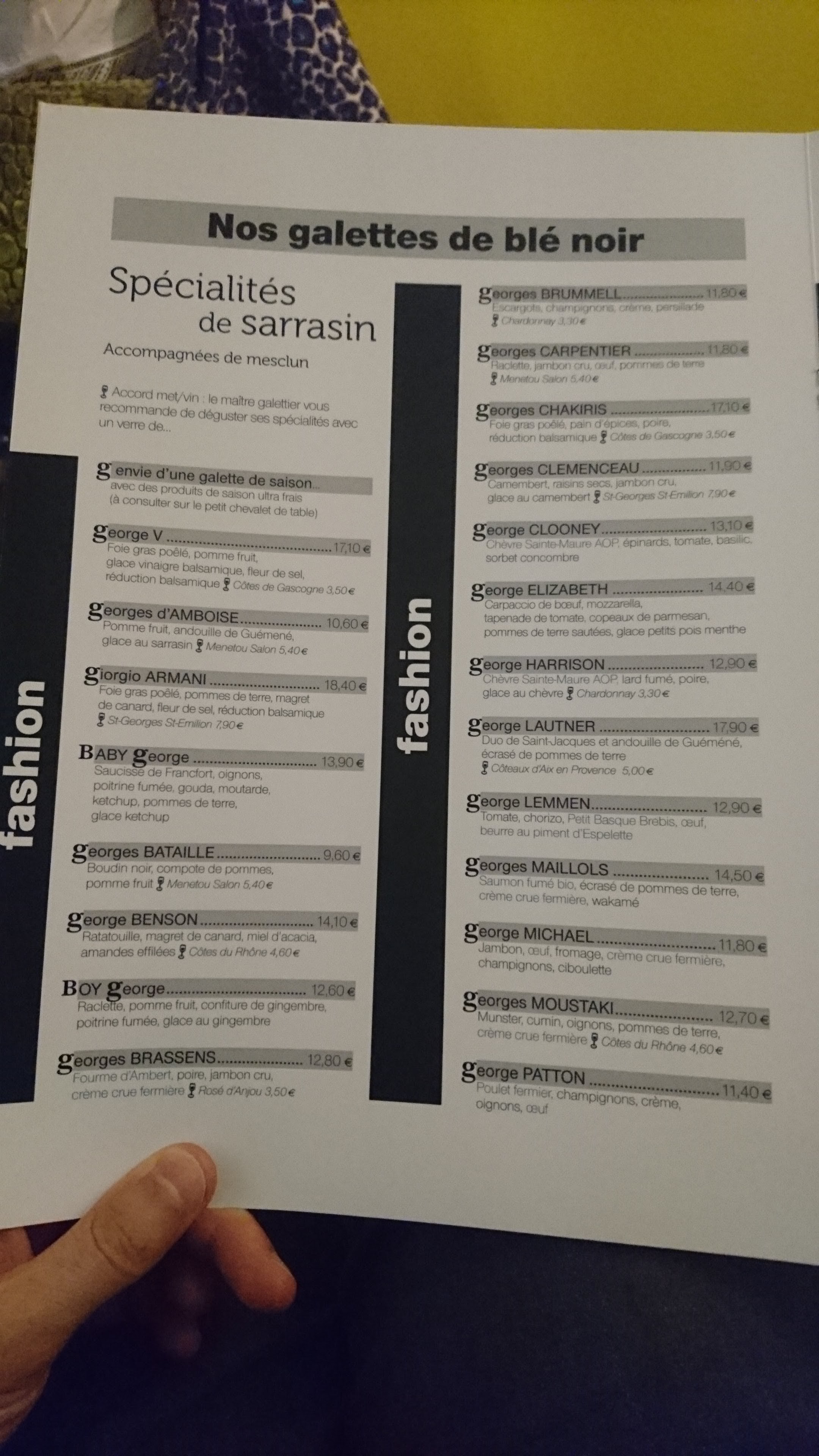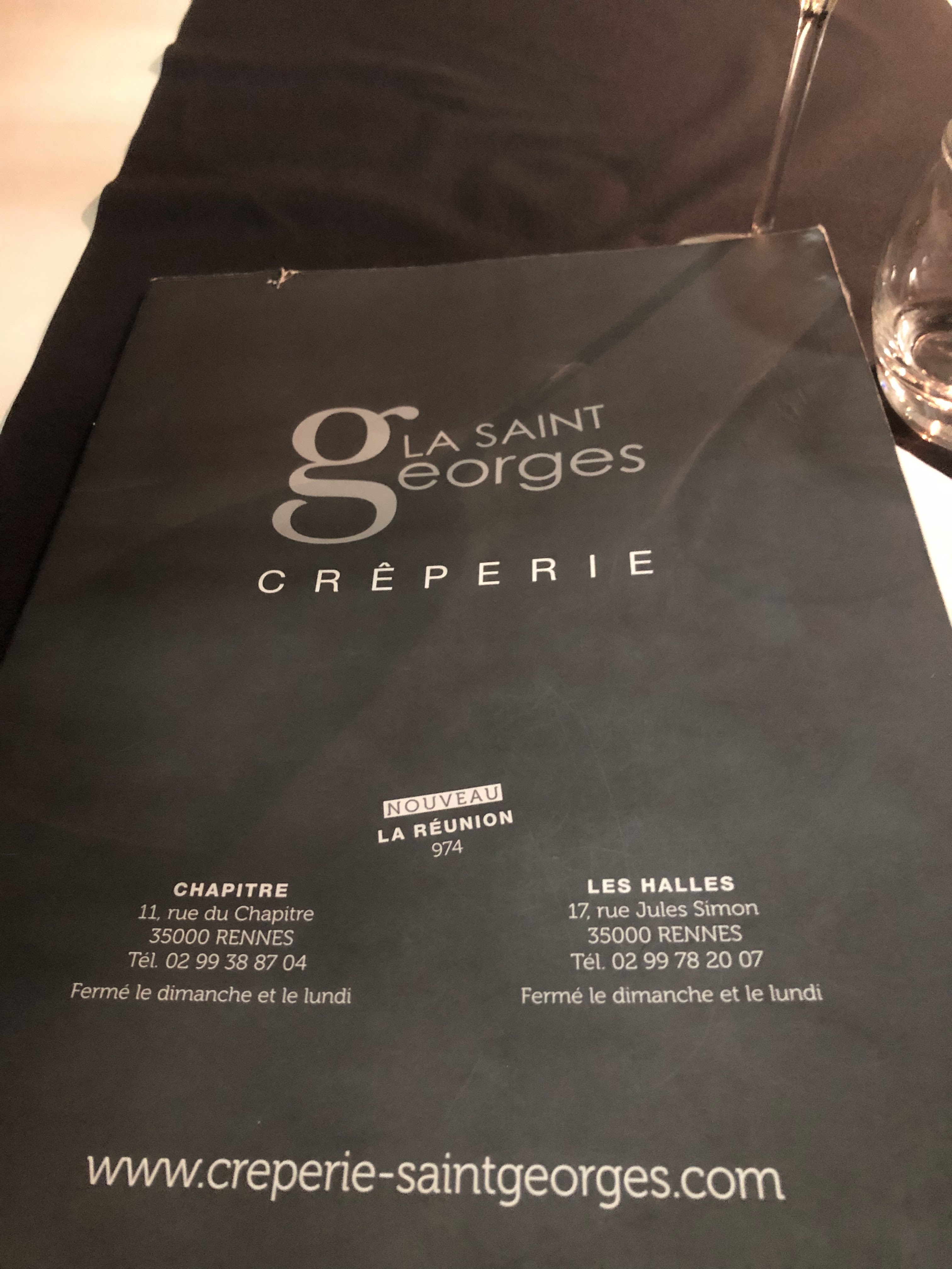Après de nombreux séjours à Rennes à entendre quoi, tu ne connais pas la Saint-Georges ?, j'ai finalement réussi à y déjeuner. Ce n'est pas une crêperie, c'est de la bistronomie sur base de galettes, toutes les crêpes portent le nom d'un Georges (ou une George) célèbre, et c'est super bien fait ! La galette au magret de canard, ratatouille et miel d'acacia est parfaitement cuite et aux alliances de saveurs bien maîtrisées. Les prix sont plus élevés que dans une crêperie traditionnelle, mais sont à comparer au prix d'un plat du jour, pas d'une galette complète. Vivement que j'y retourne pour tester les autres Georges !