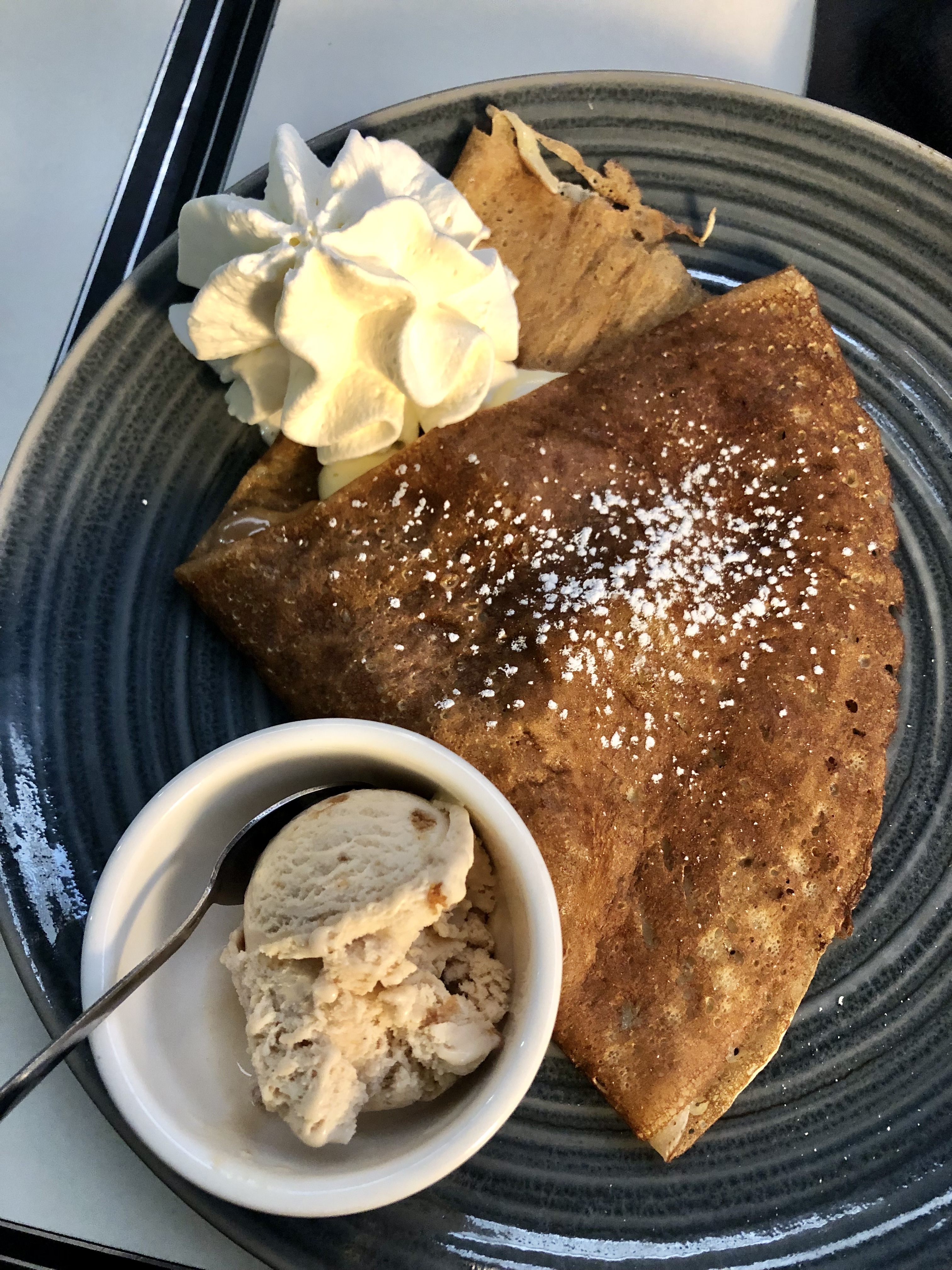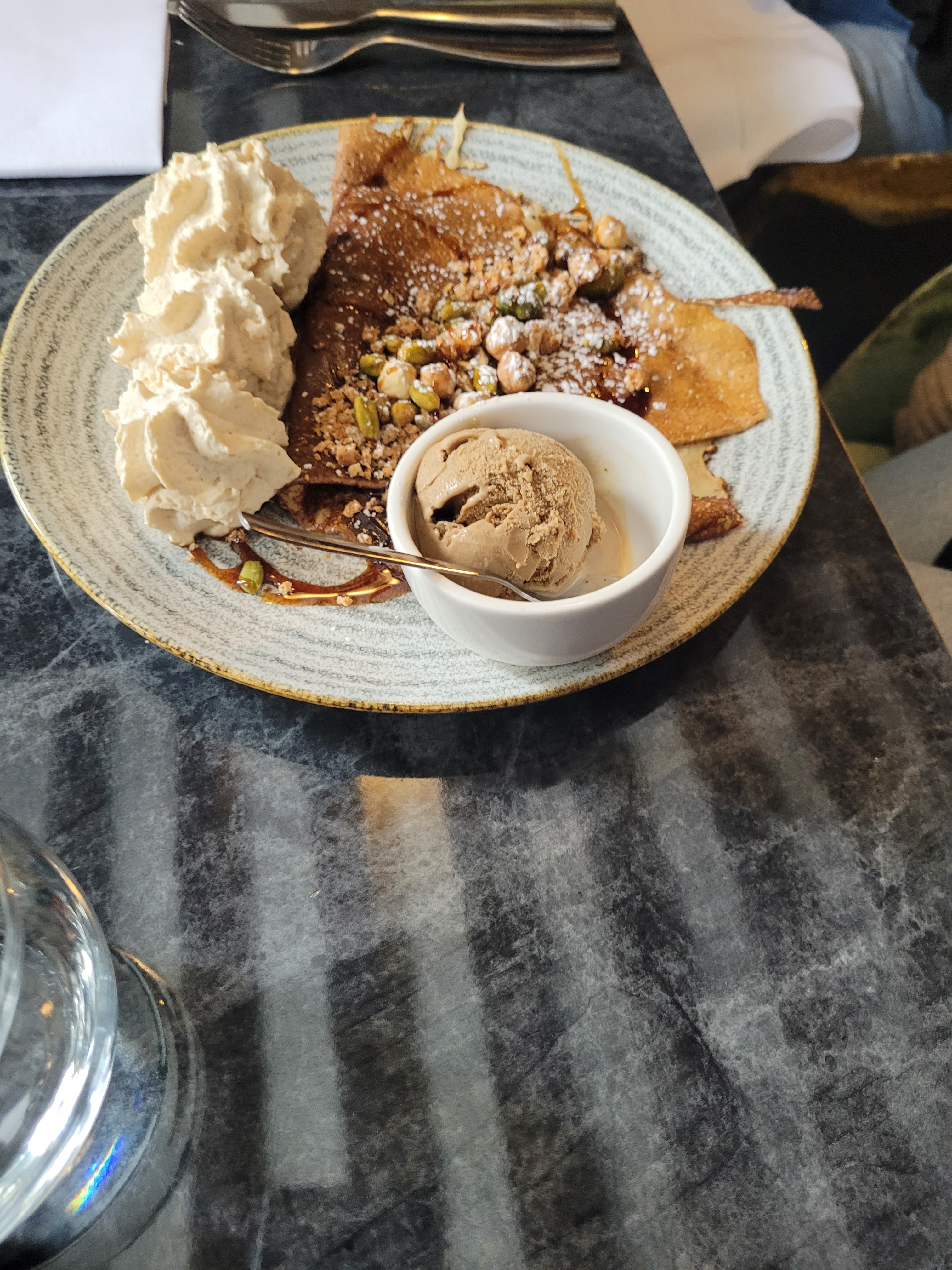 Super crêperie, très chic et bonne ambiance. J'ai adoré l'originalité des glaces qui accompagnent les galettes. J'ai pris glace au chèvre ☺
