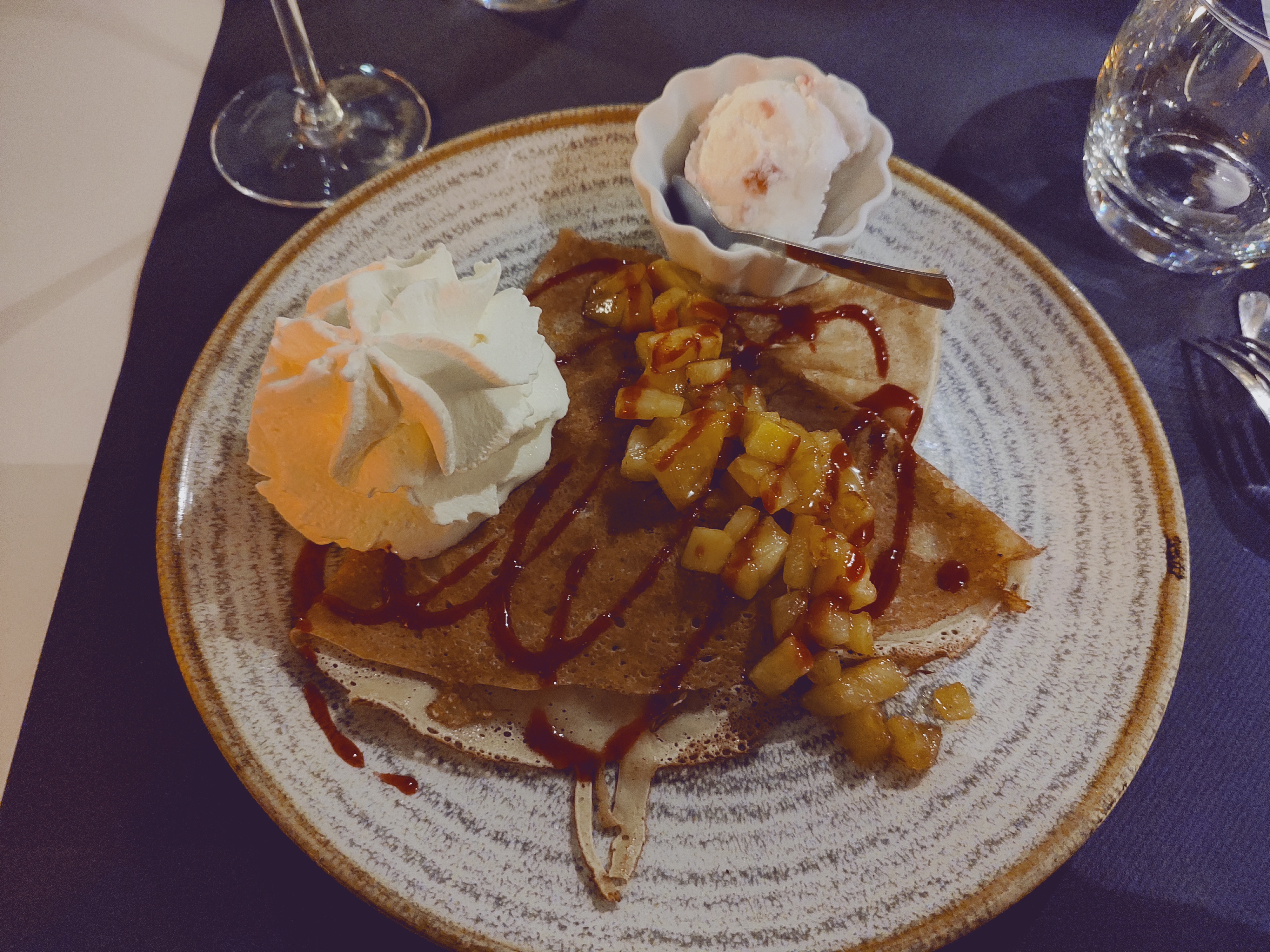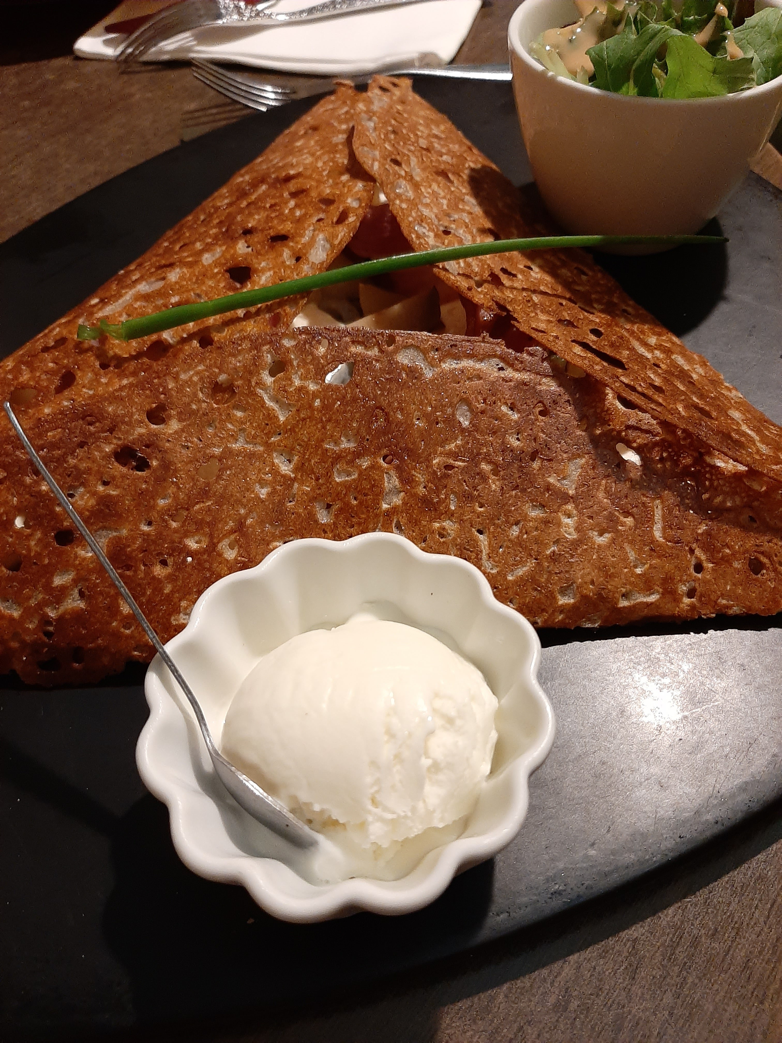 Délicieuses crêpes avec une composition très originale ! La glace au chèvre allait très bien avec la galette salée ! Le parfait mélange sucré salé et chaud froid ! Le dessert était parfait ! Merci pour ce repas !