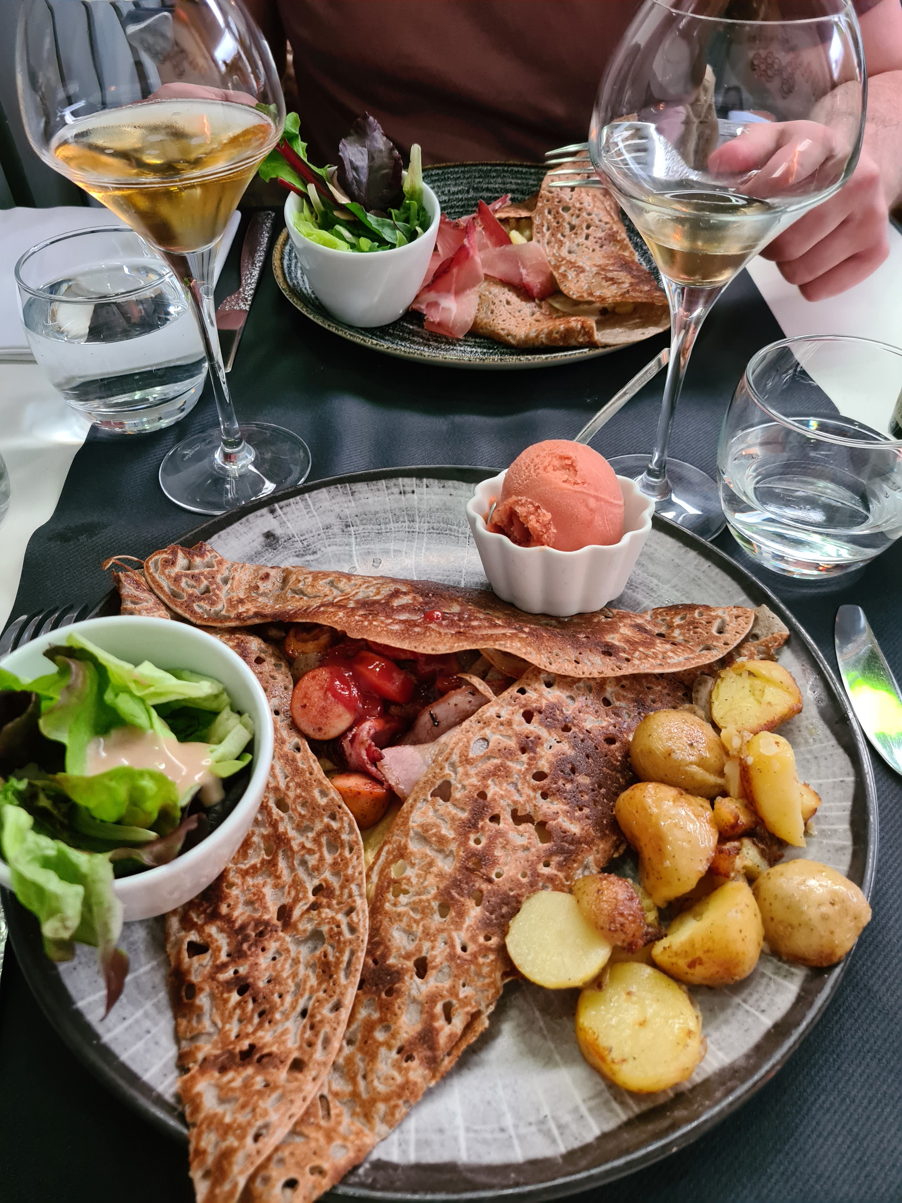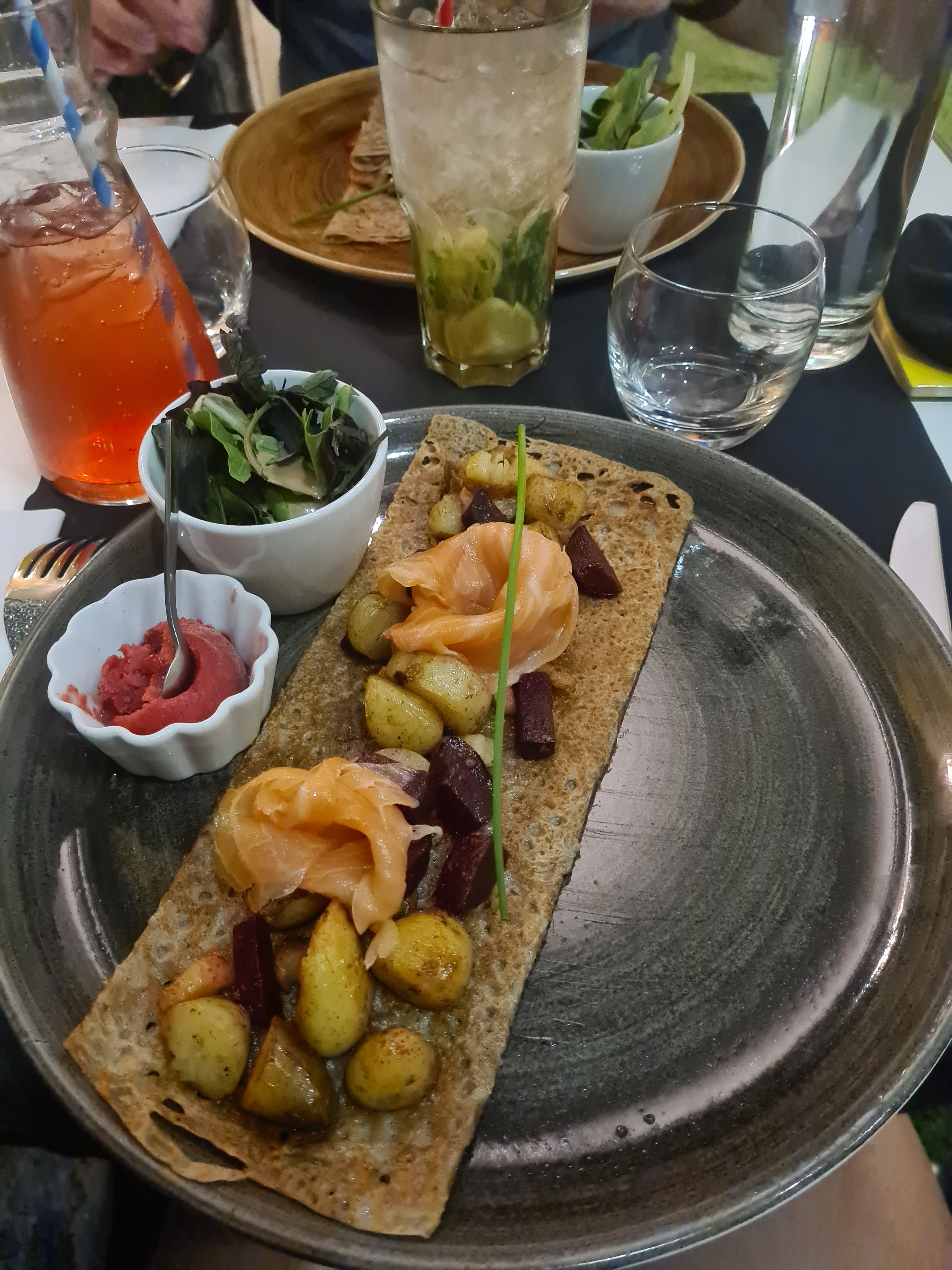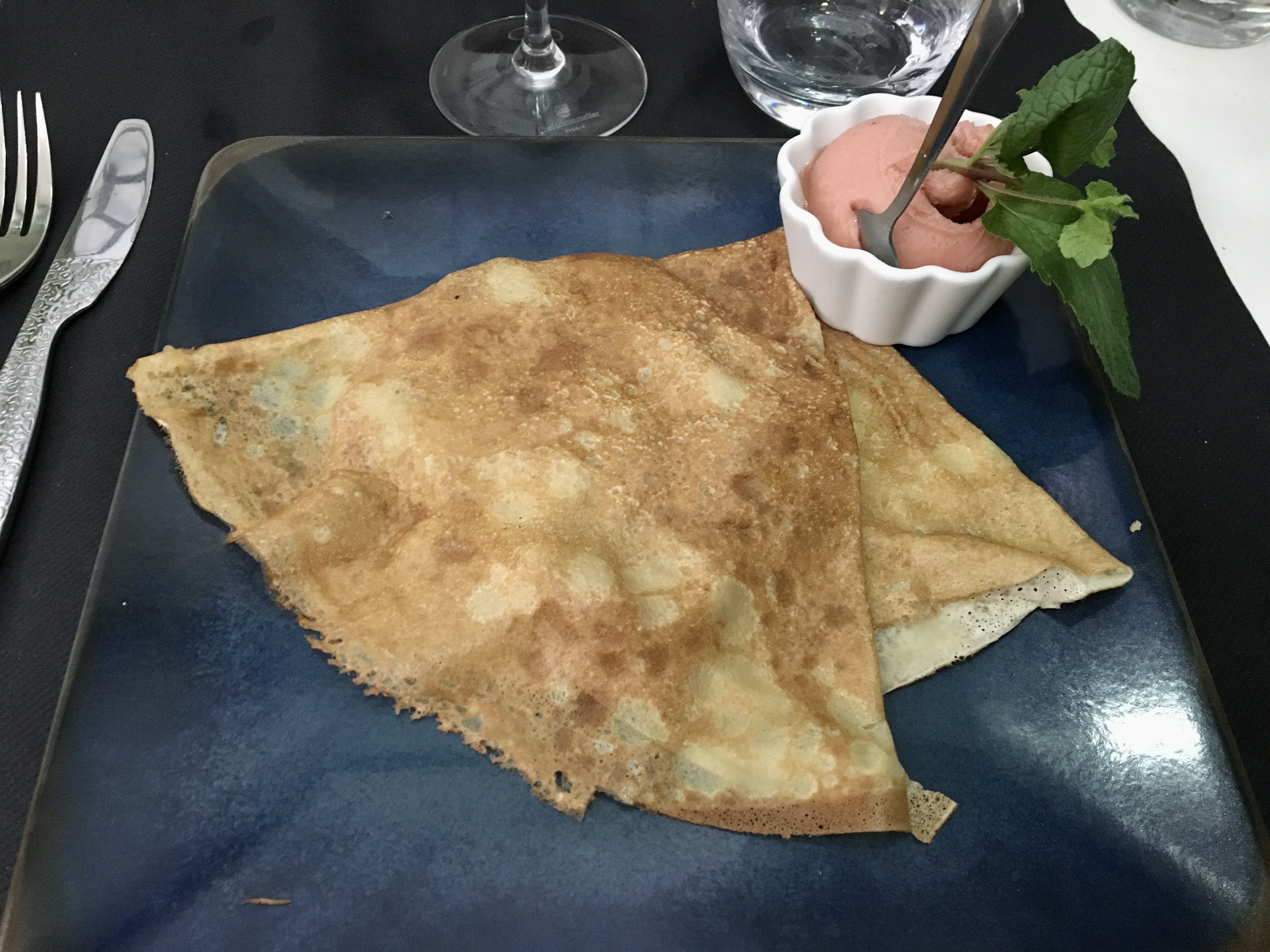 Crêpes très bonnes avec sorbet bien original, serveurs sympa, tout c’est bien passé. merci!
