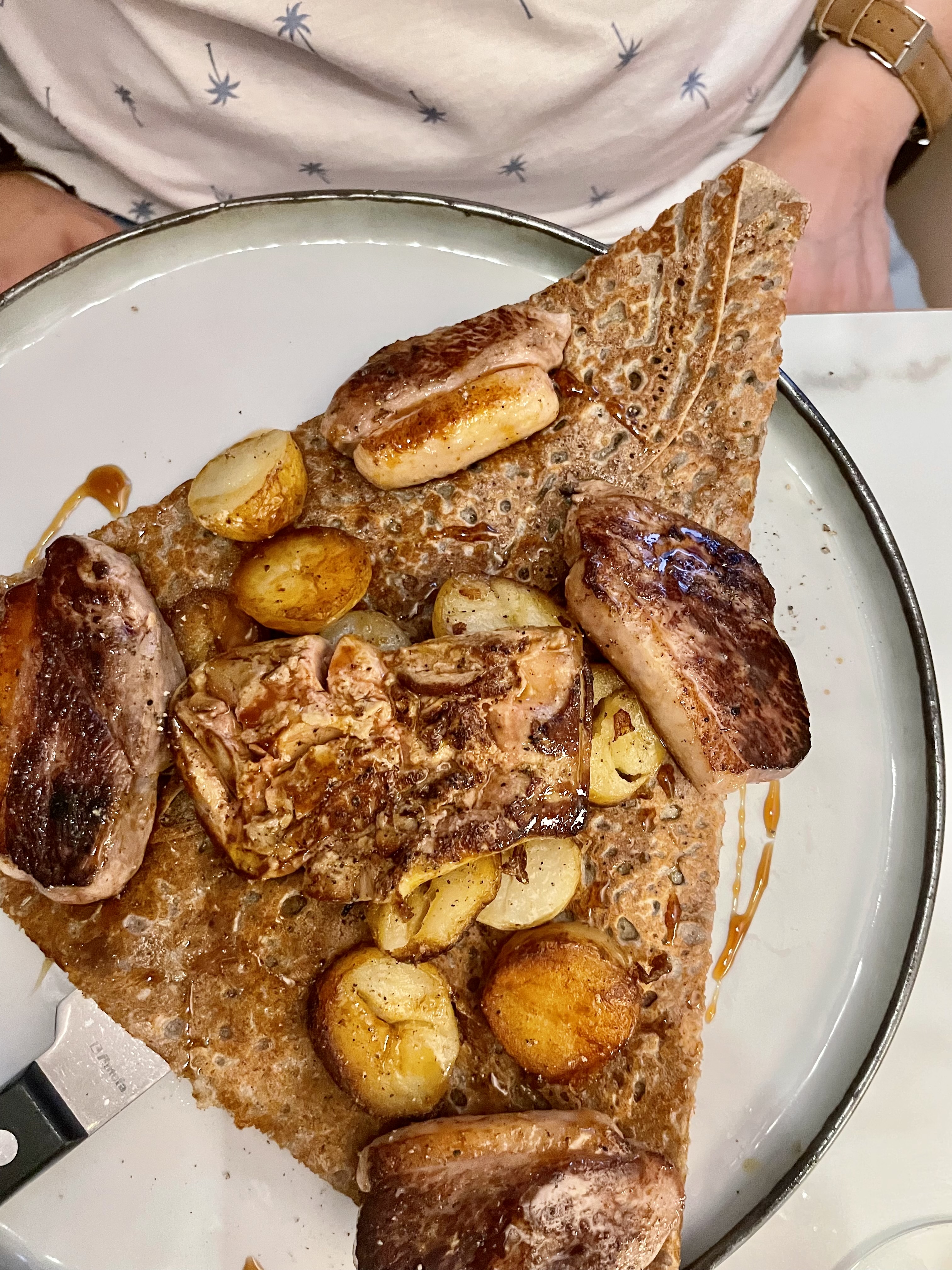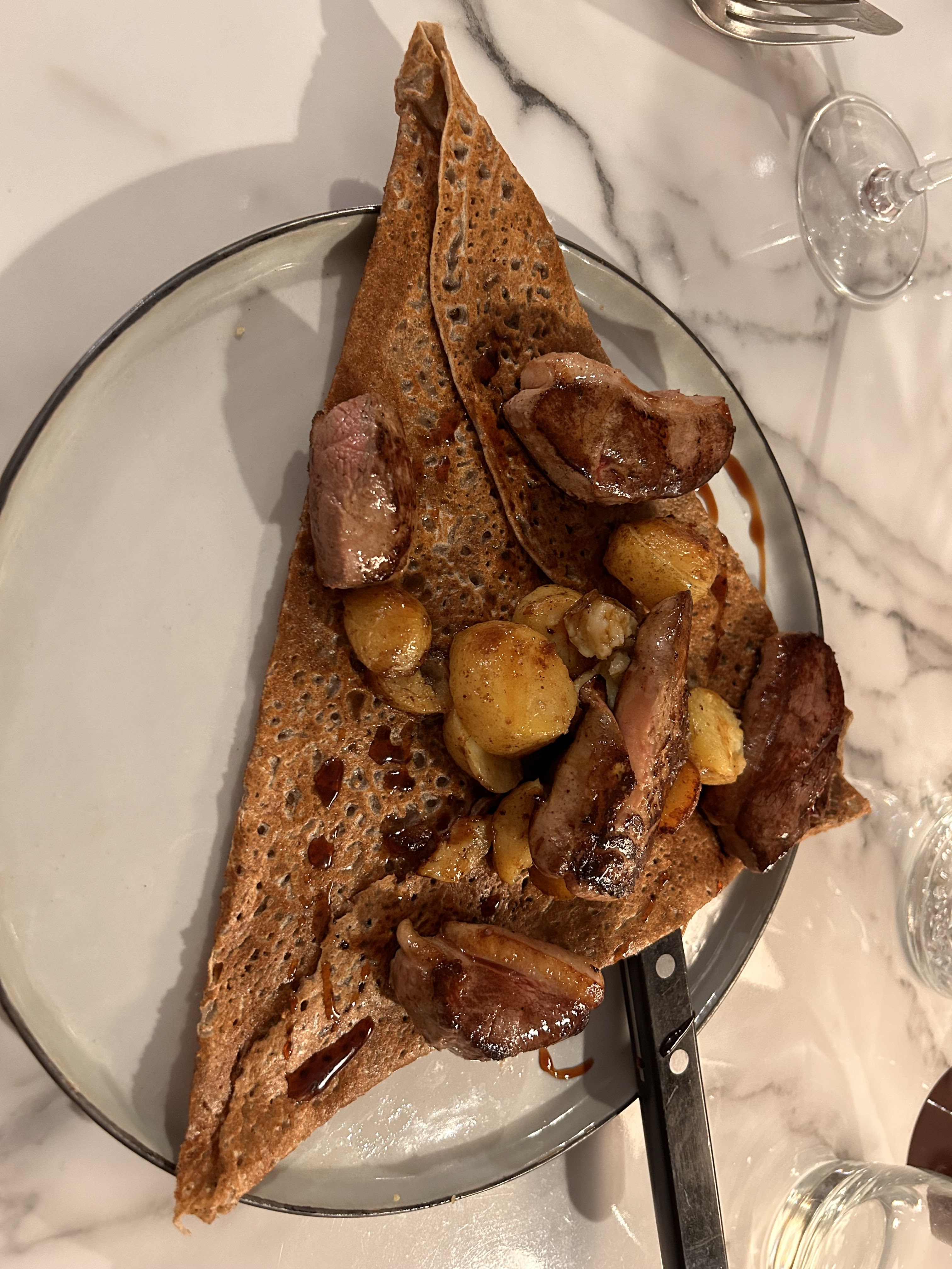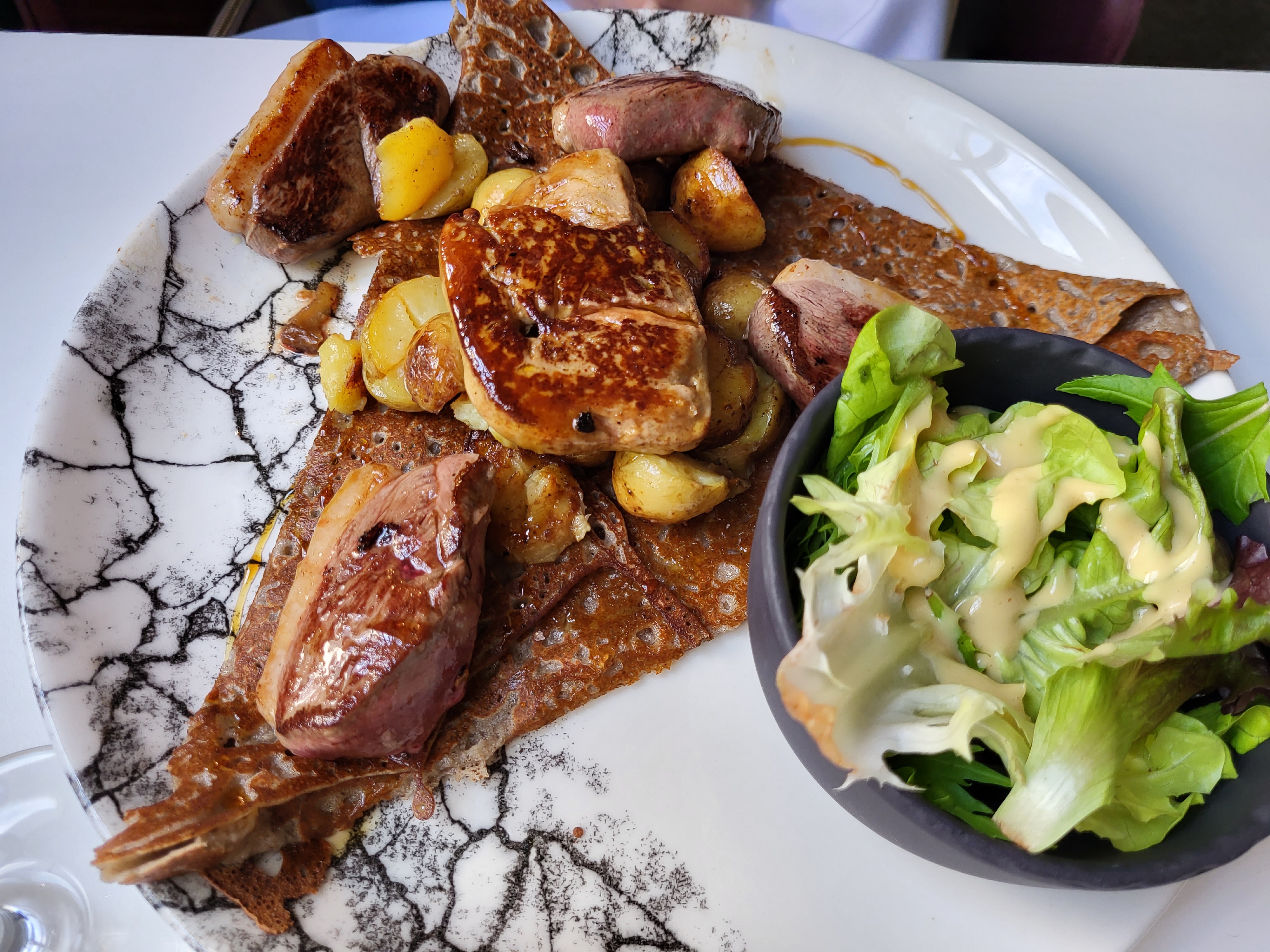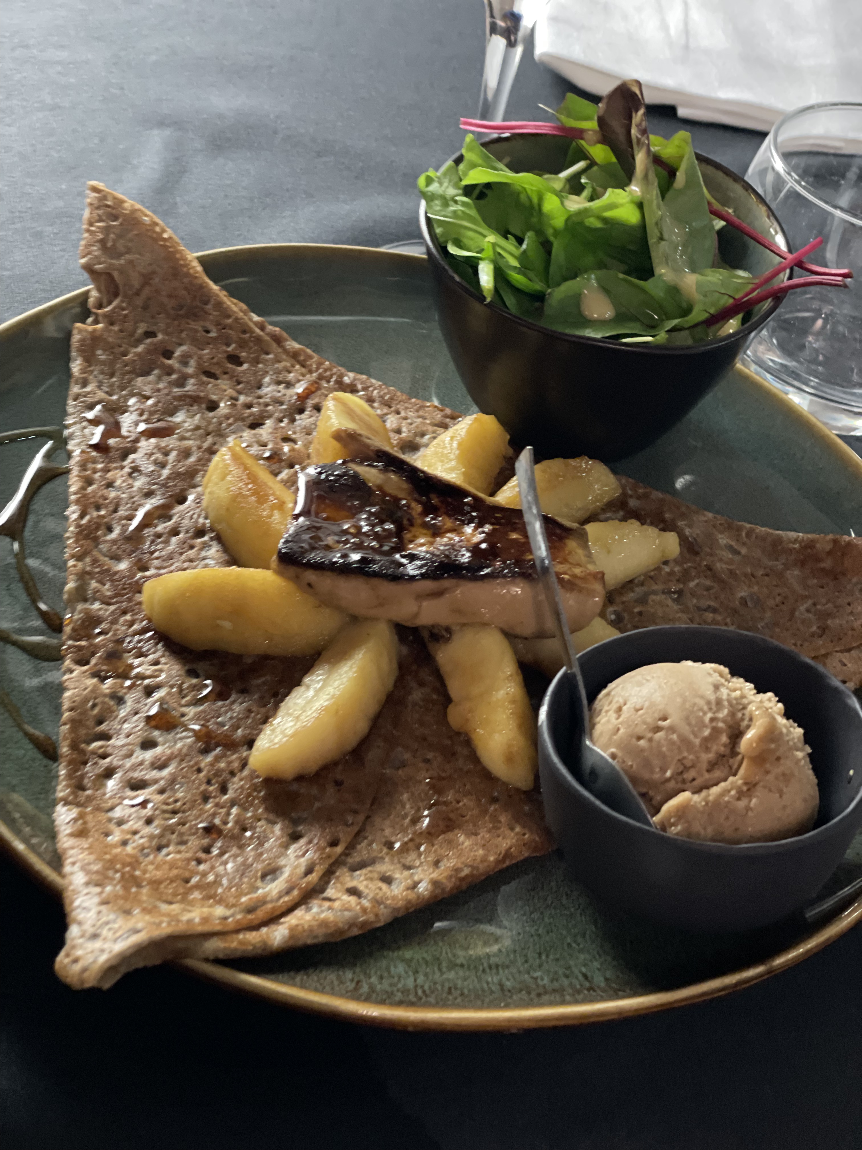 La galette avec le foie gras avait une texture étrange, pas vraiment bonne en revanche la galette au camembert était excellente. Tarif très élevé pour une crêperie. Les crêpes sucrées étaient excellentes.
