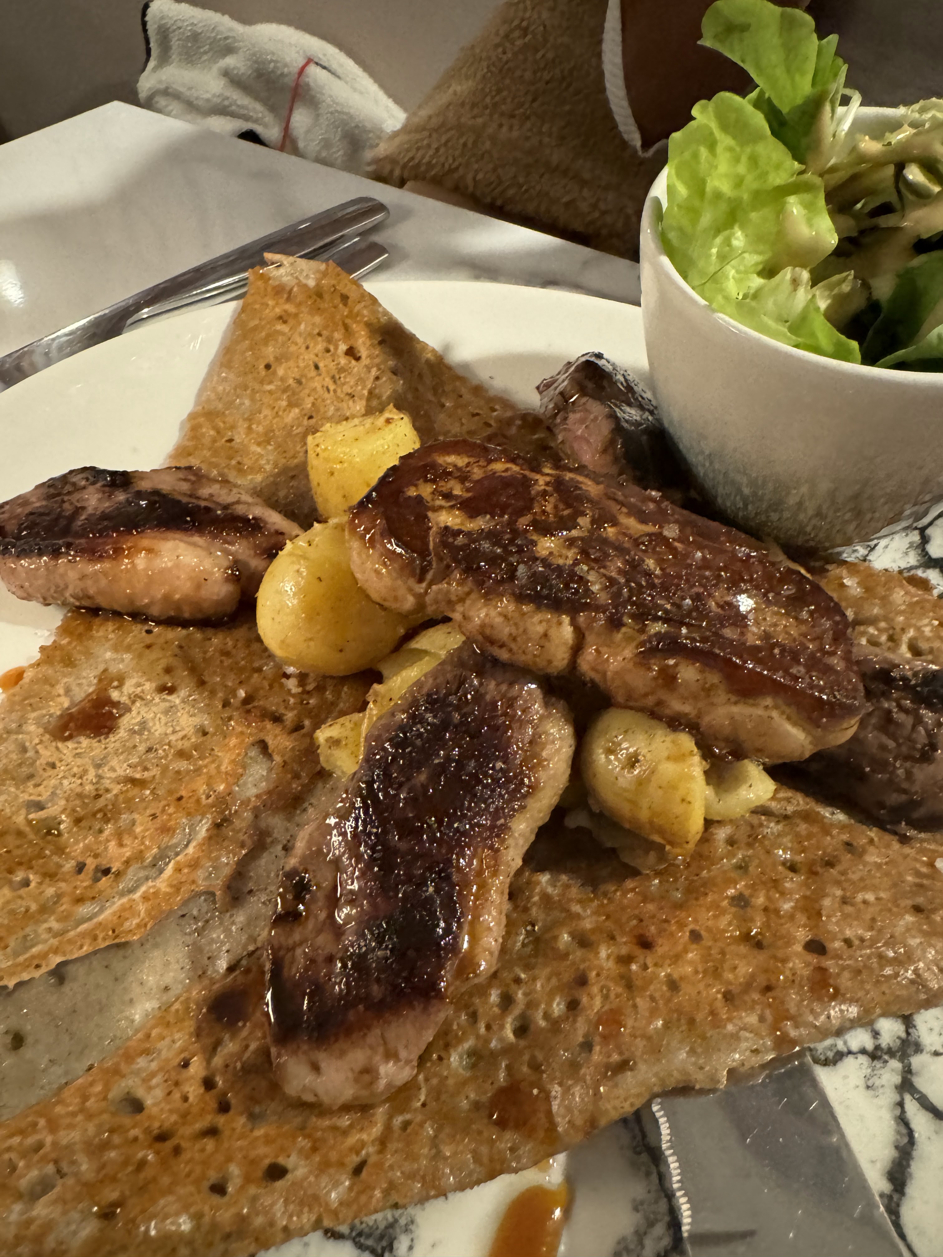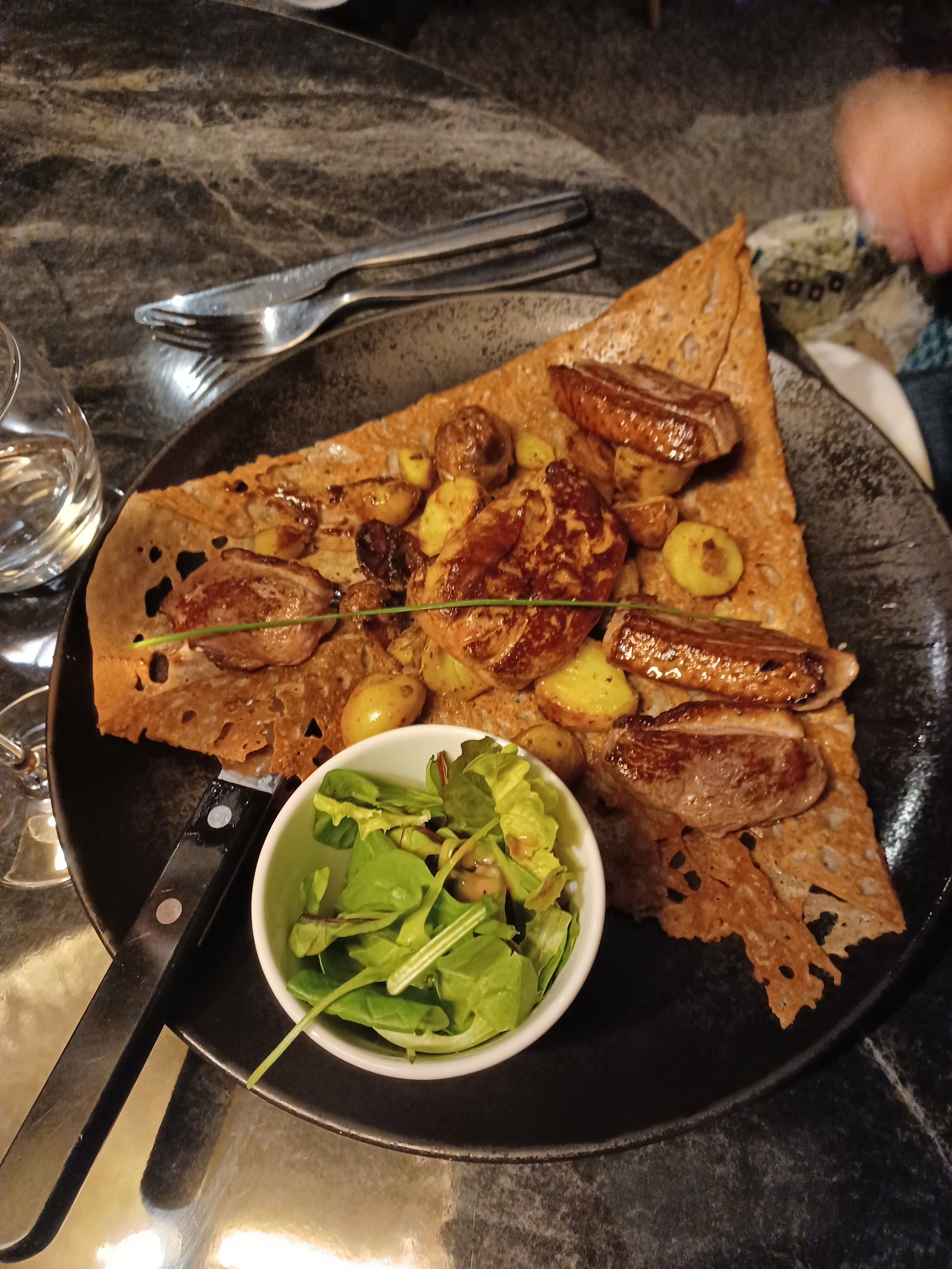 J'ai commandé une crêpe au foie gras et pain d'épice avec de la poire caramélisée, et c'était un régal. Le foie gras était de très bonne qualité et servi en quantité généreuse et le pain était savoureux. Pour le dessert, j'ai opté pour une simple crêpe au chocolat, et même celle-ci m'a impressionnée : la pâte à crêpe était excellente, légère et bien cuite. Une expérience culinaire à renouveler sans hésitation !