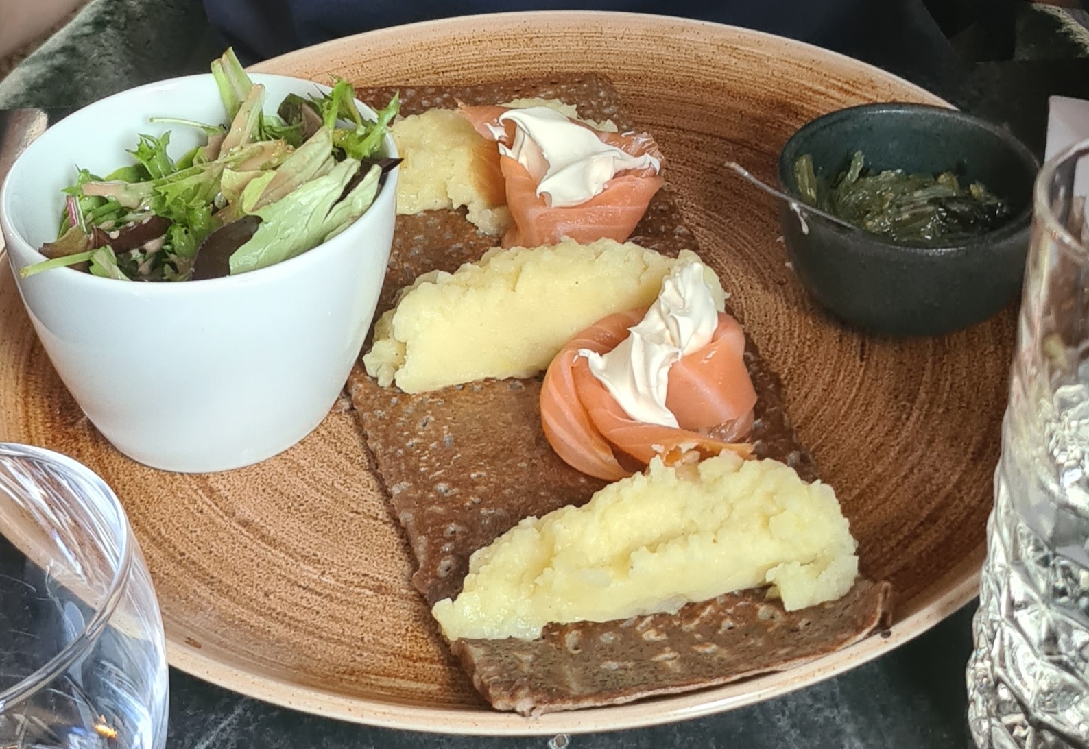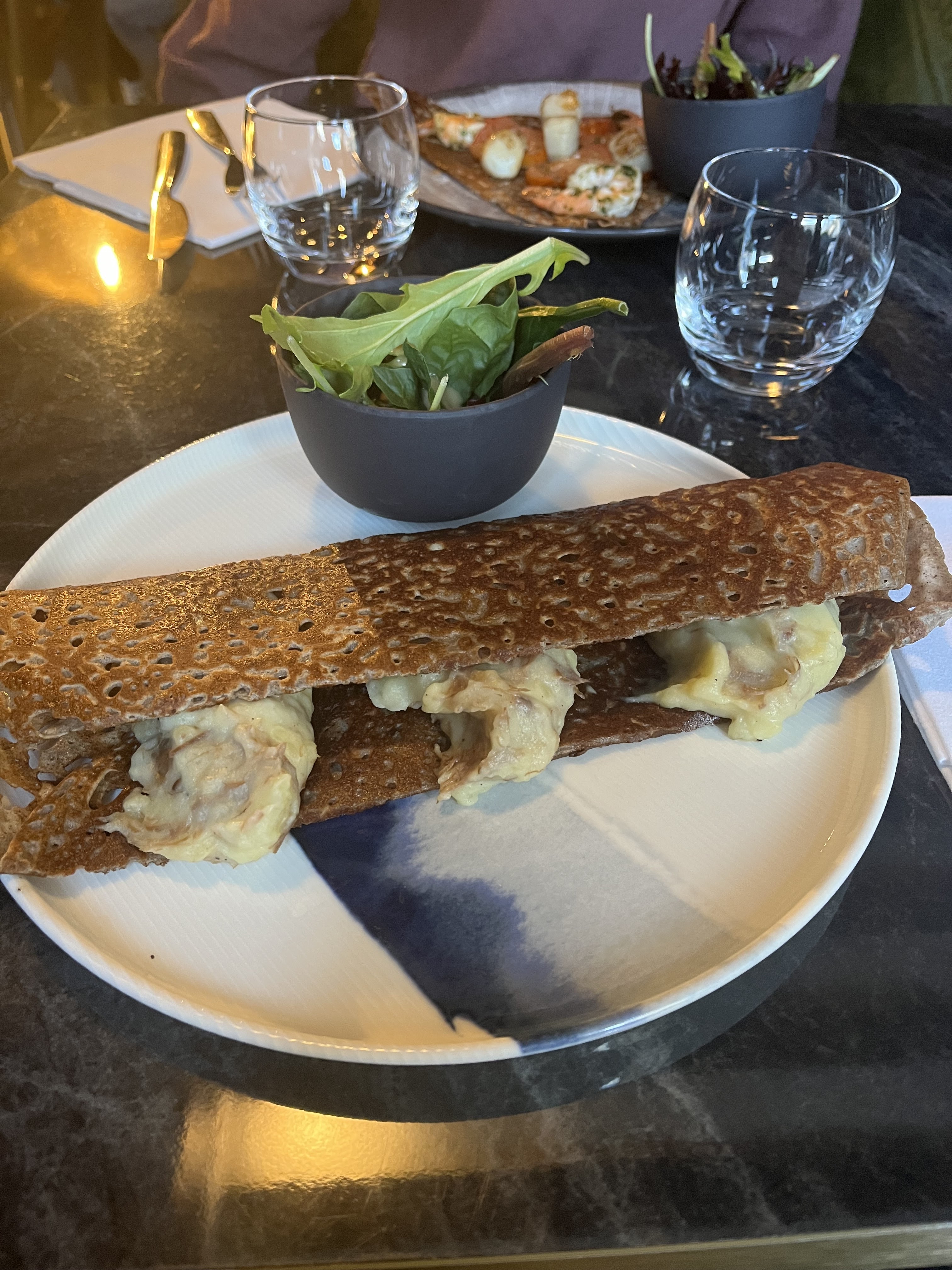 Ambiance moderne et chic, service agréable. Prix un peu élevés pour ce que c'est mais carte variée avec des galettes originales. Mon plat était plus froid que mon dessert, c'est dommage. Mais agréable moment quand même, à essayer !