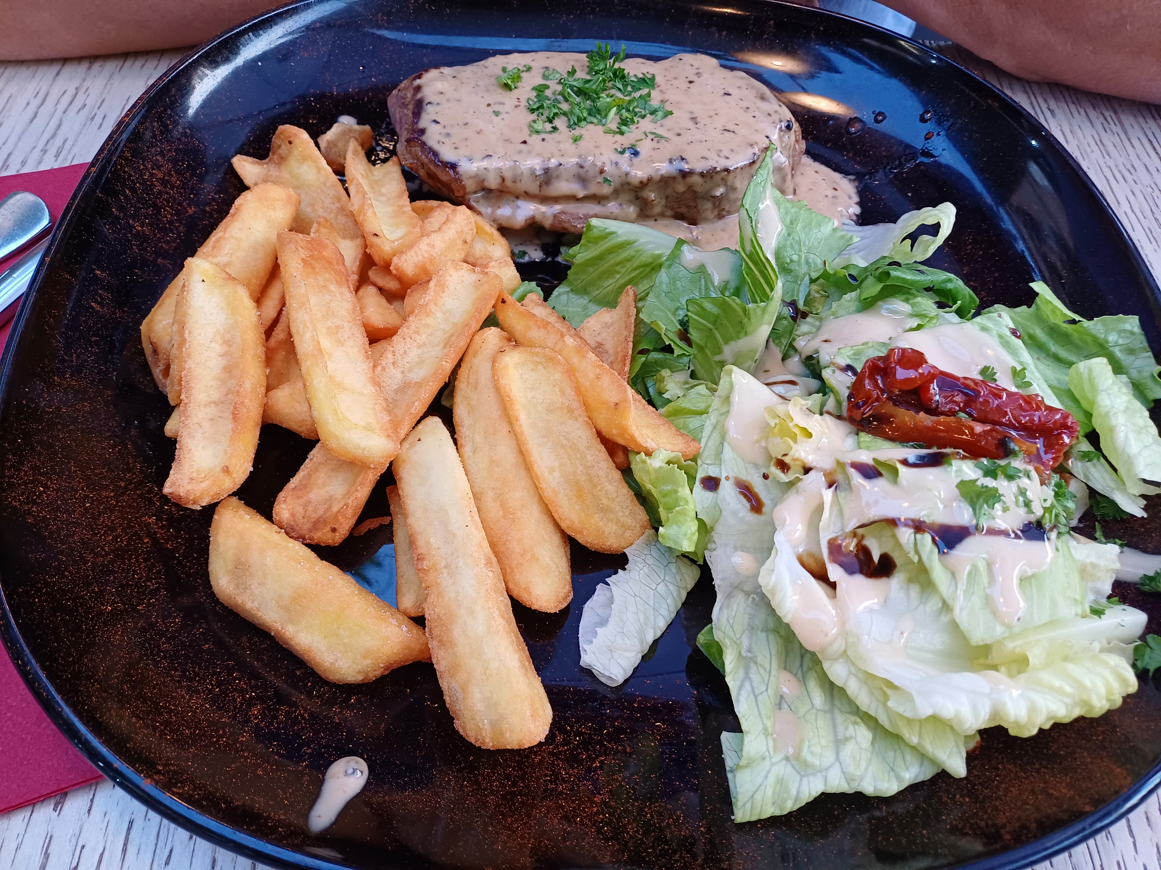 Pour la soirée du 31 octobre, nous avons choisi ce restaurant car son emplacement était idéal. Comme nous devions nous rendre au château à 20 heures, nous avons demandé s’il serait possible que nous puissions manger en moins de 50 minutes. Ce fut un grand succès. Nous n’avons pas eu le temps d’attendre tant le service était prompt. La cuisson de la pièce du boucher était parfaite. La sauce au roquefort était divine. L’assiette était agrémentée avec goût. Mon seul regret est que des personnes aient été placées à la table qui était à 10 cm de la nôtre, alors que des tables de deux à l’écart sont restées vides durant tout notre repas. Avec le volume de la musique extérieure, impossible de tenir une conversation avec mon amie sans l’imposer aux personnes d’à côté et inversement. C’était une soirée difficile, je l’entends. Le restaurant doit être des plus agréables en temps normal. Je le recommande grandement tout de même et ne regrette pas ma venue.
