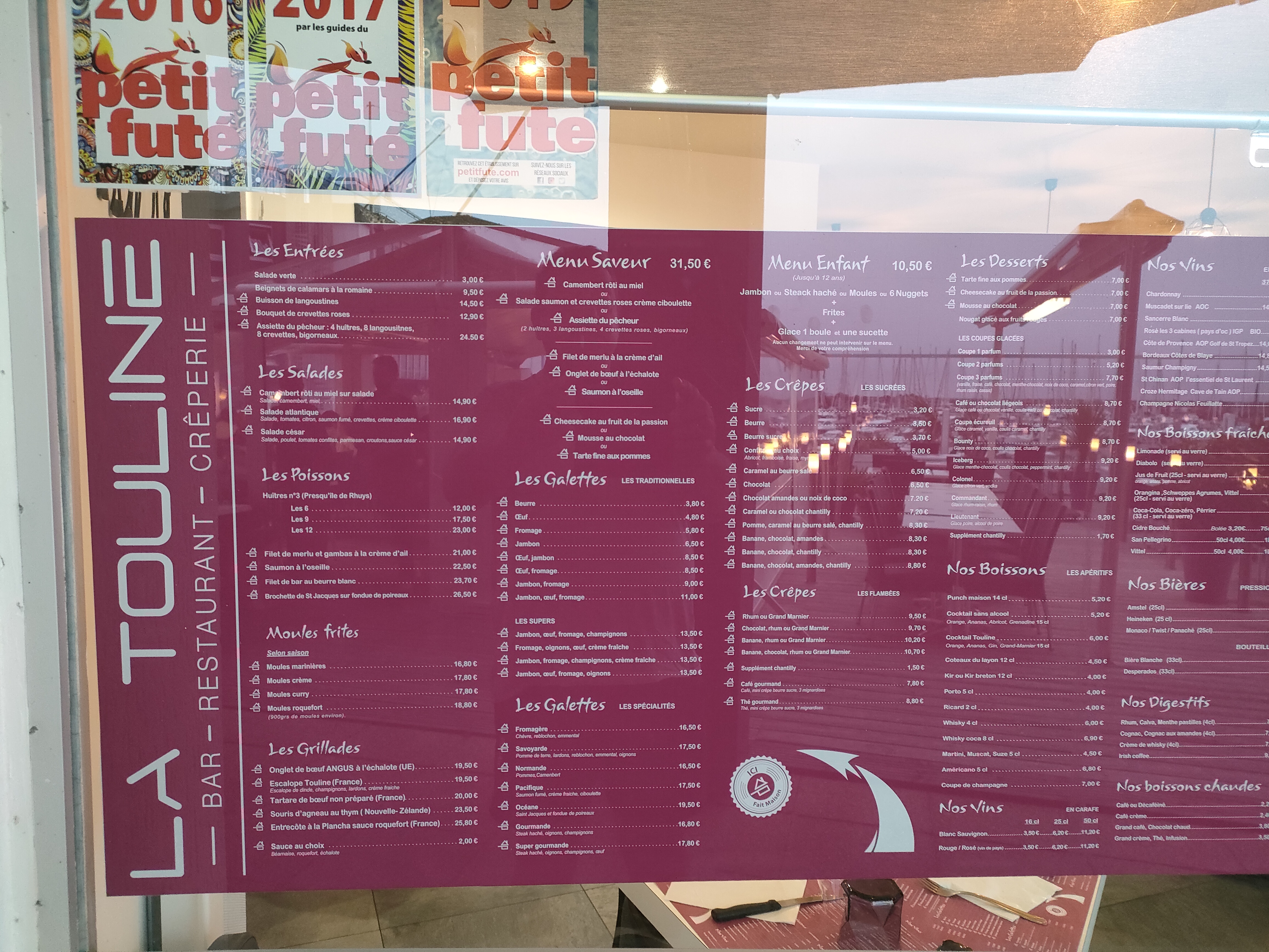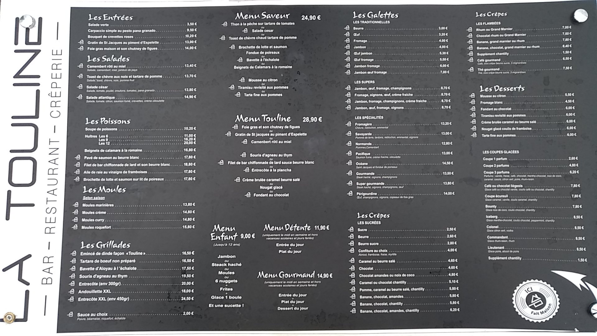 La Galerne était fermée, alors on s'est rabattu sur La Touline, juste à côté. Aucun regret, malgré l'heure tardive où l'on est arrivé, service parfait, gentillesse et plats très bons et copieux. On y reviendra en 2016, après les vacances hivernales.