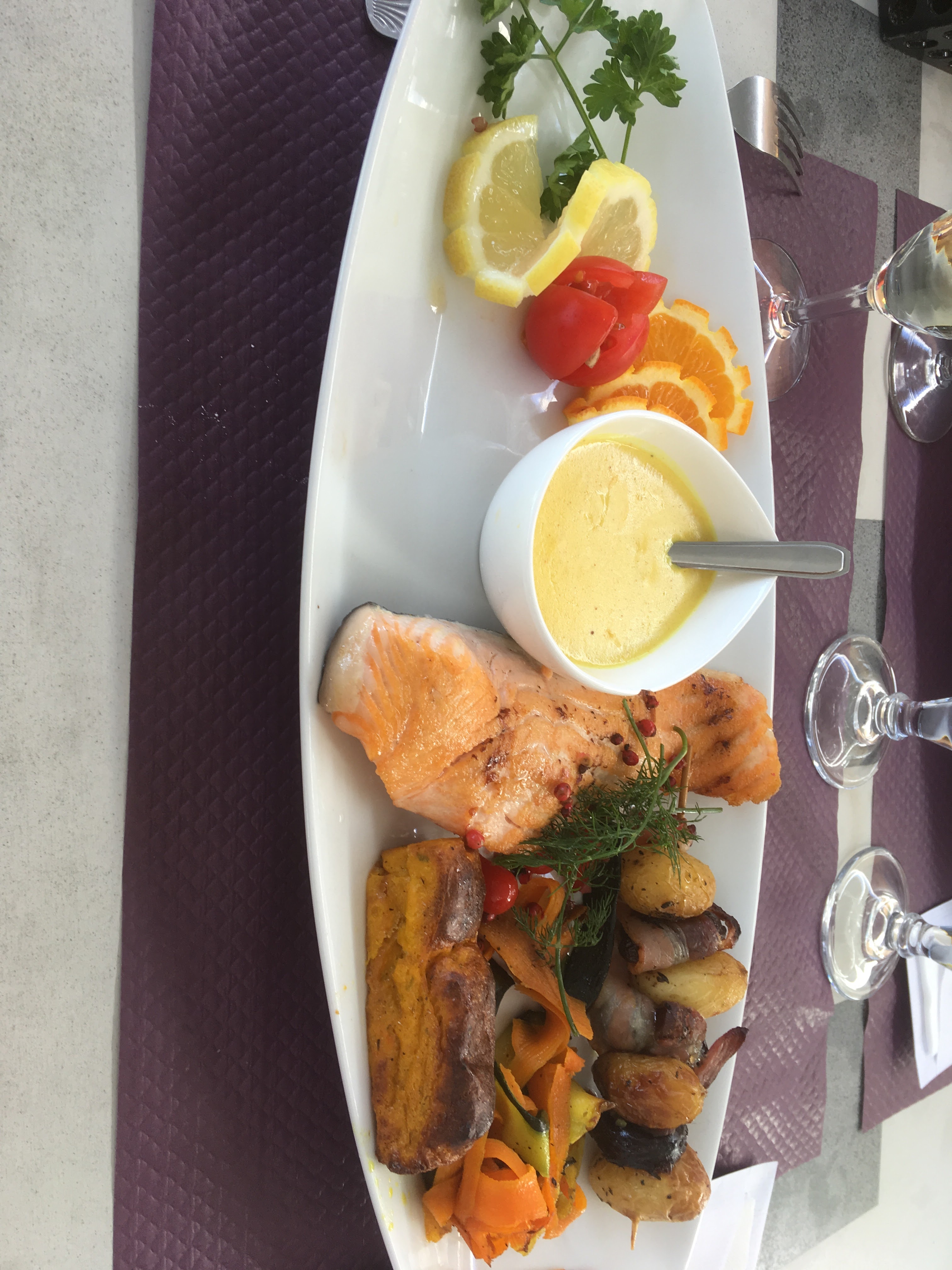 Jolie vue sur le port , le saumon avec ses accompagnements étaient très bon , la tarte fine excellente . Lieux propre , service rapide .