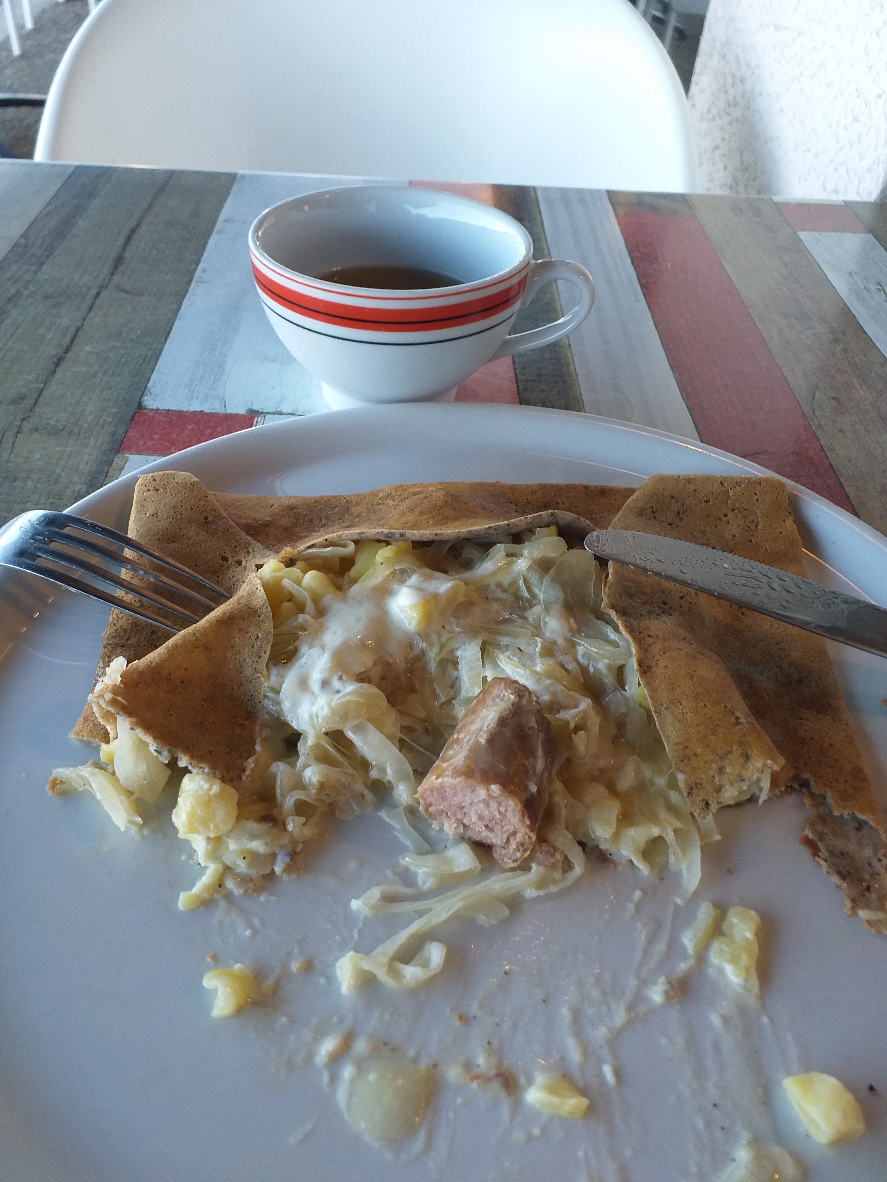 La galette était trop cuite donc desséchée. Nous n avions mm pas terminé notre galette que la serveuse nous apportait la carte des crêpes dessert. Pas de 2e galette donc ! La crêpe était bonne mais pas le temps d en profiter : la serveuse nous propose un café ou autre boisson chaude pour terminer le repas. Pas de 2e crêpe non plus donc !!!! Du coup on n'a pas pris de café. Et on n a pas eu droit au ticket de caisse non plus ! Je déconseille pour un repas