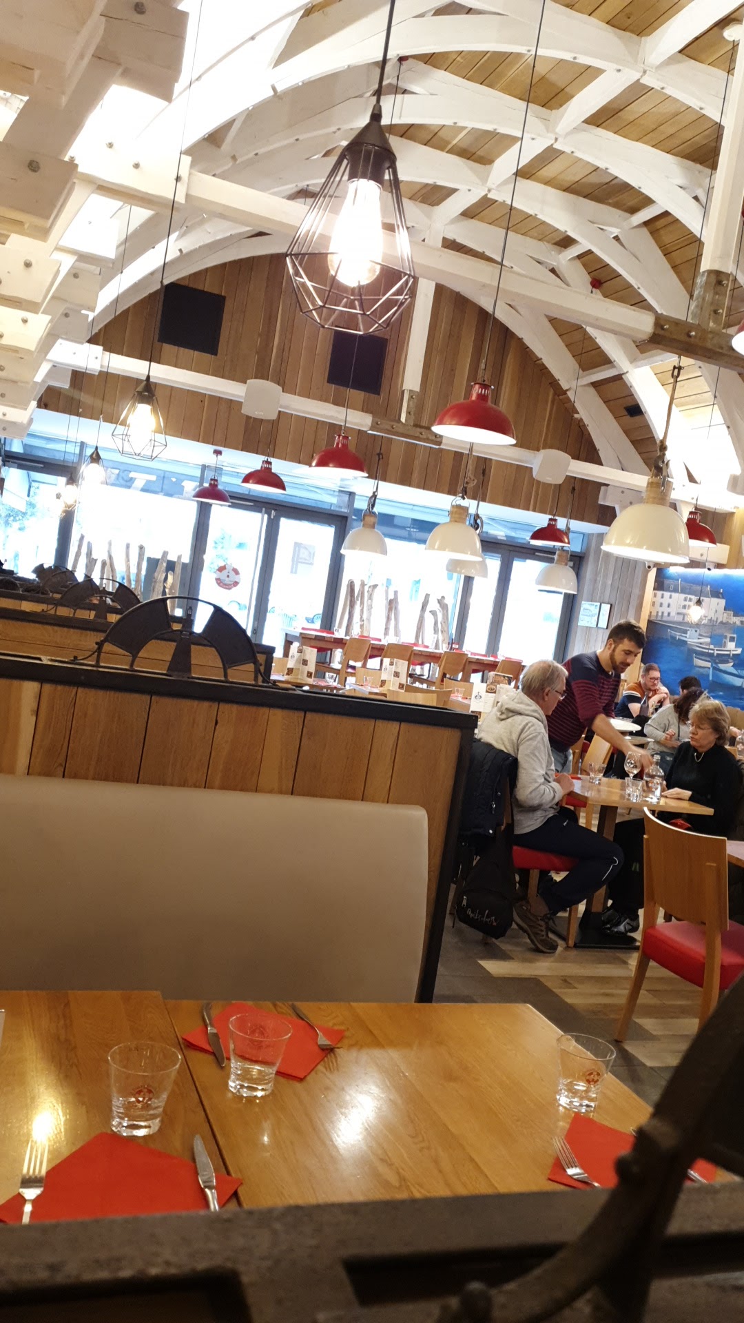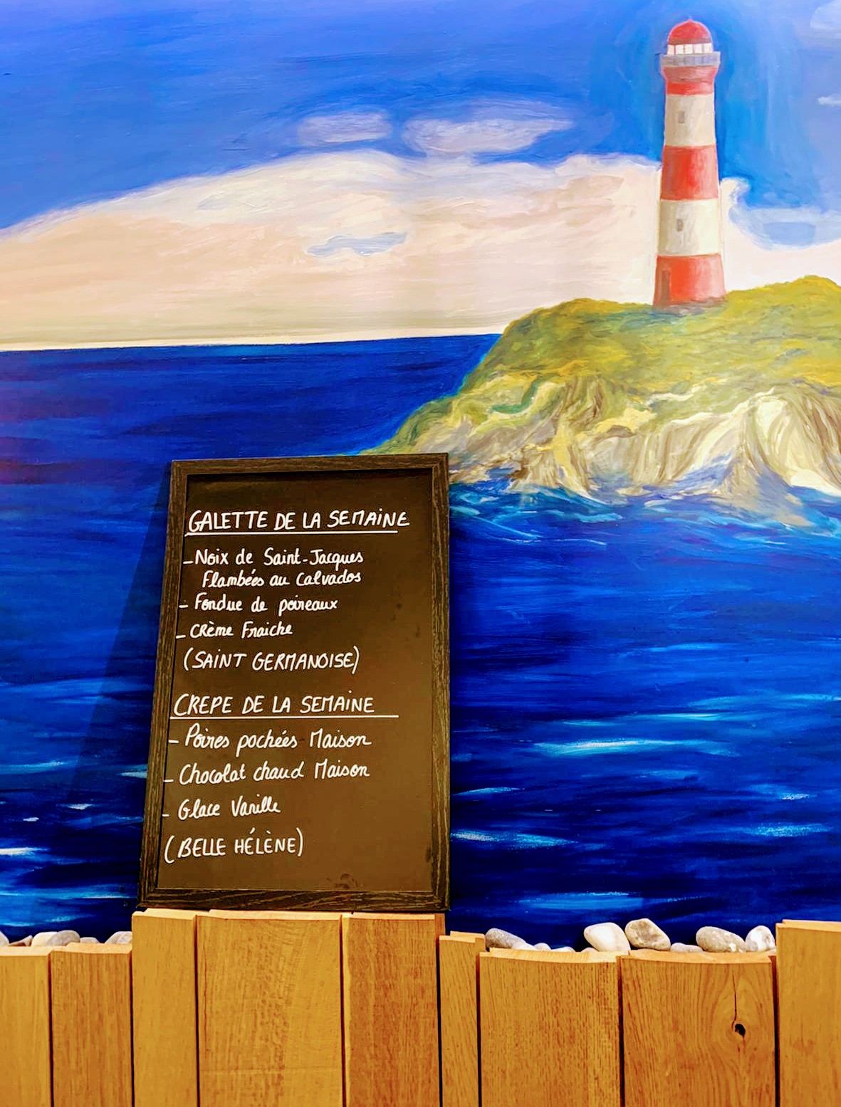 Restaurant très bien situé à côté du cinéma. L’effet whoa en rentrant, on est comme dans une grange avec une belle hauteurs sous plafond, décor en bois . Sur la gauche , on a une fresque avec vue sur la mer. Au fond du restaurant , on voit un bout de phare. Les galettes sont généreuses et délicieuses. Ma crêpe Belle Hélène manque de gourmandise ( la demi poire était petite par rapport à la taille de la crêpe ) les autres sont bonnes.
