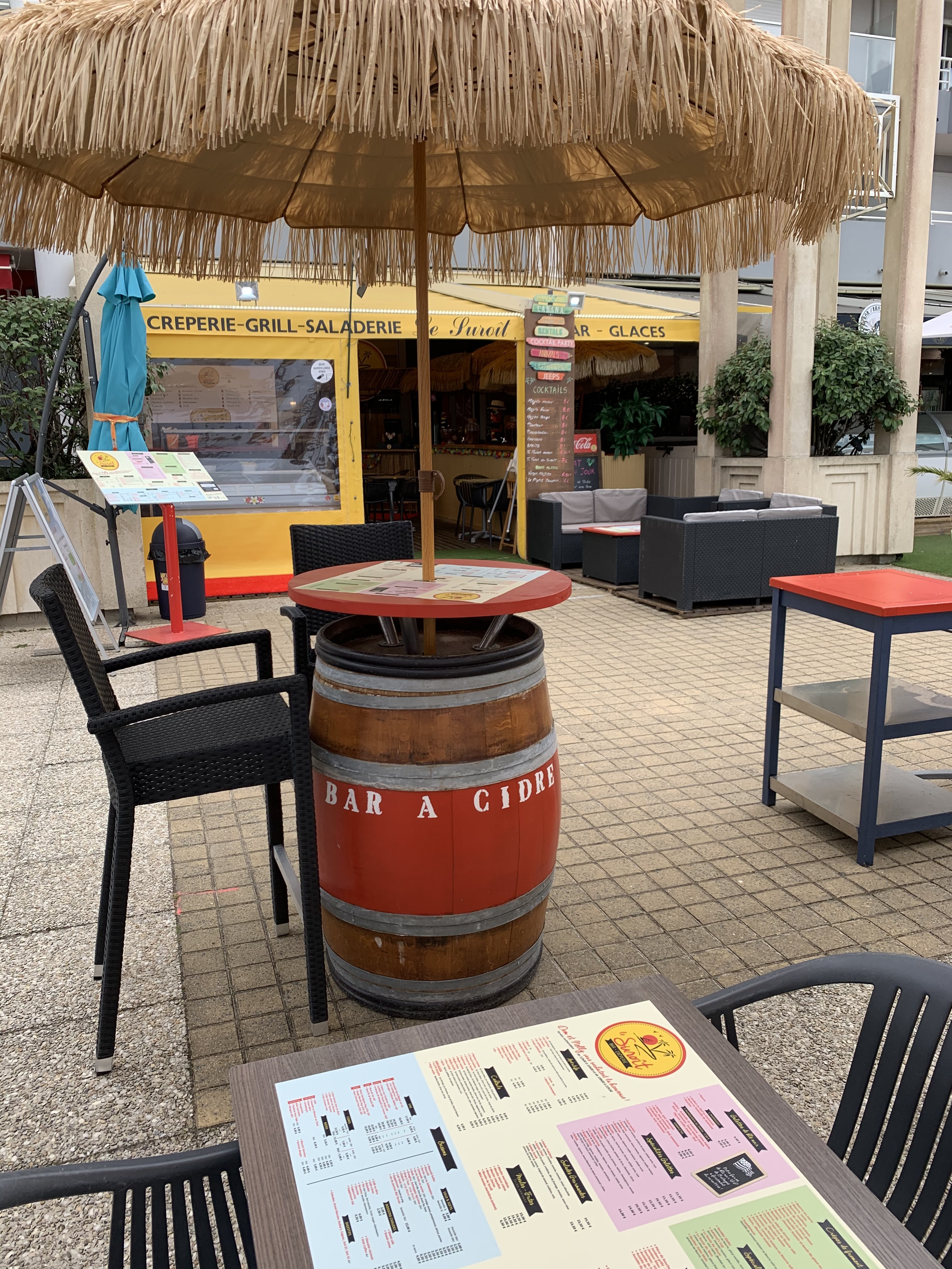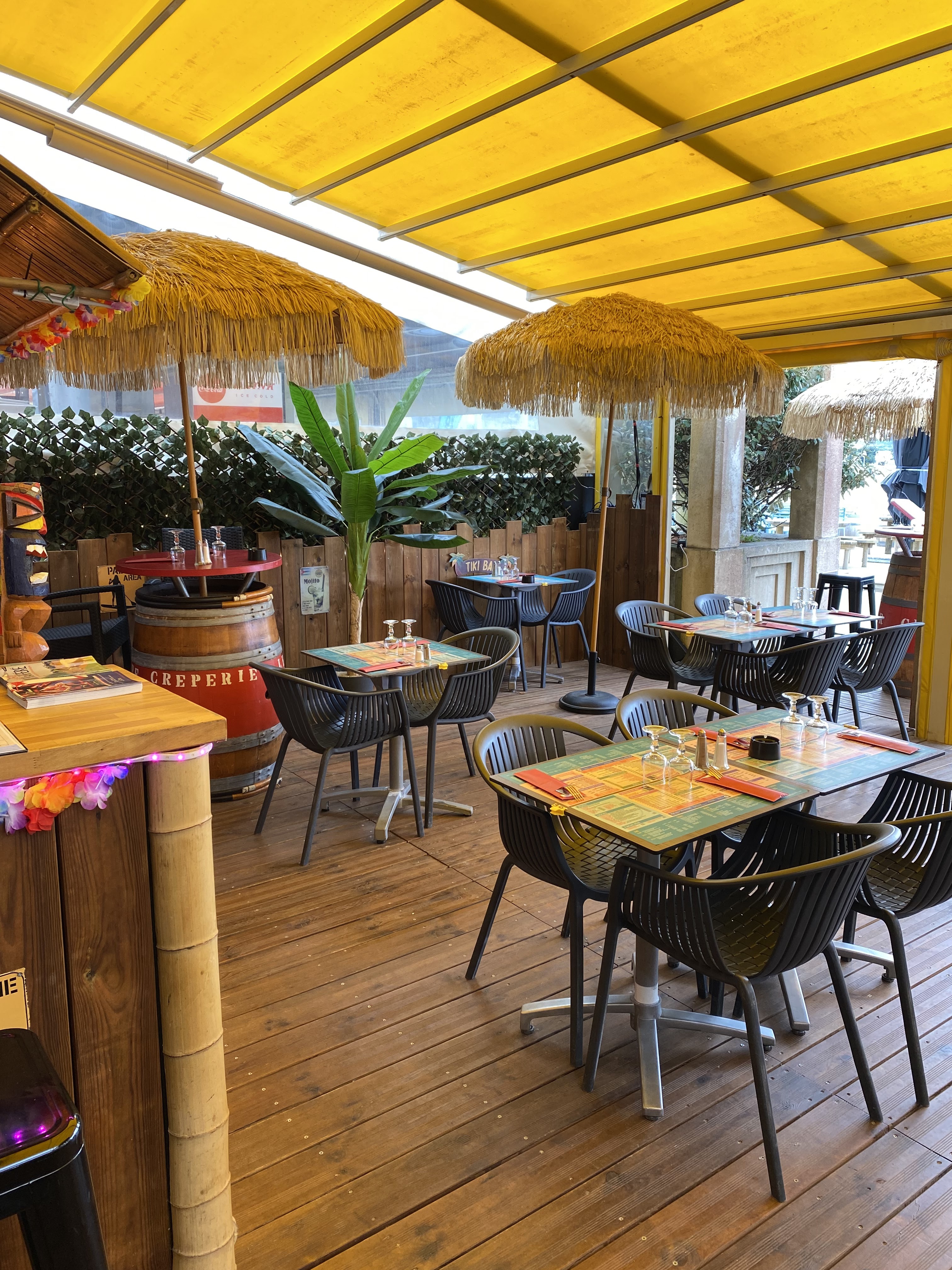 Repas pris le midi en terrasse en saison estivale. Pensez à réserver surtout en saison. Août 2022: Vous serez servis par des serveurs en chemises hawaïennes aux couleurs vives, sous des parasols dans l'esprit tropiques, tout comme l'intérieur du restaurant et du bar avec une déco murale sympathique. Vous y mangerez bien et vous serez vite servis. J'ai pris une galette landaise (avec du canard et des pommes de terre), en dessert une crêpe avec du caramel beurre salé et une bolée de cidre. Un bon moment en famille. Vous ne serez pas déçus. Juillet 2023: Repas renouvelé, période estivale, avec toujours les mêmes qualités. Servis par Kaya et Julie cette fois, des gens sympathiques, polis et bienveillants. Restaurant vivement recommandé !!!