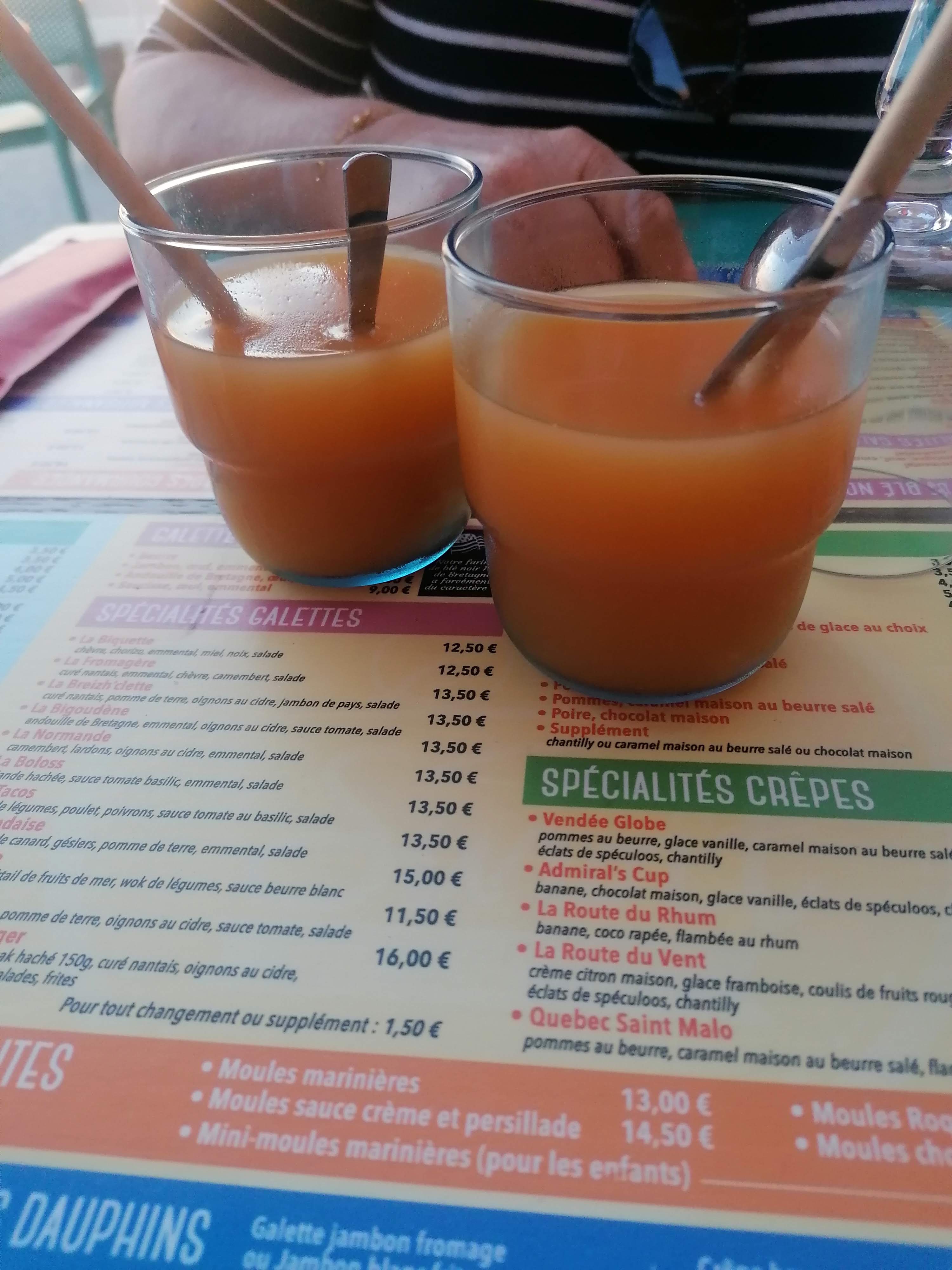 Menu midi correct, boisson, galette complète et crêpe beurre sucre. La galette est assez acide mais ca passe avec la garniture. Blé noir bio ! Tarifs plus chers qu'ailleurs car bord de mer...