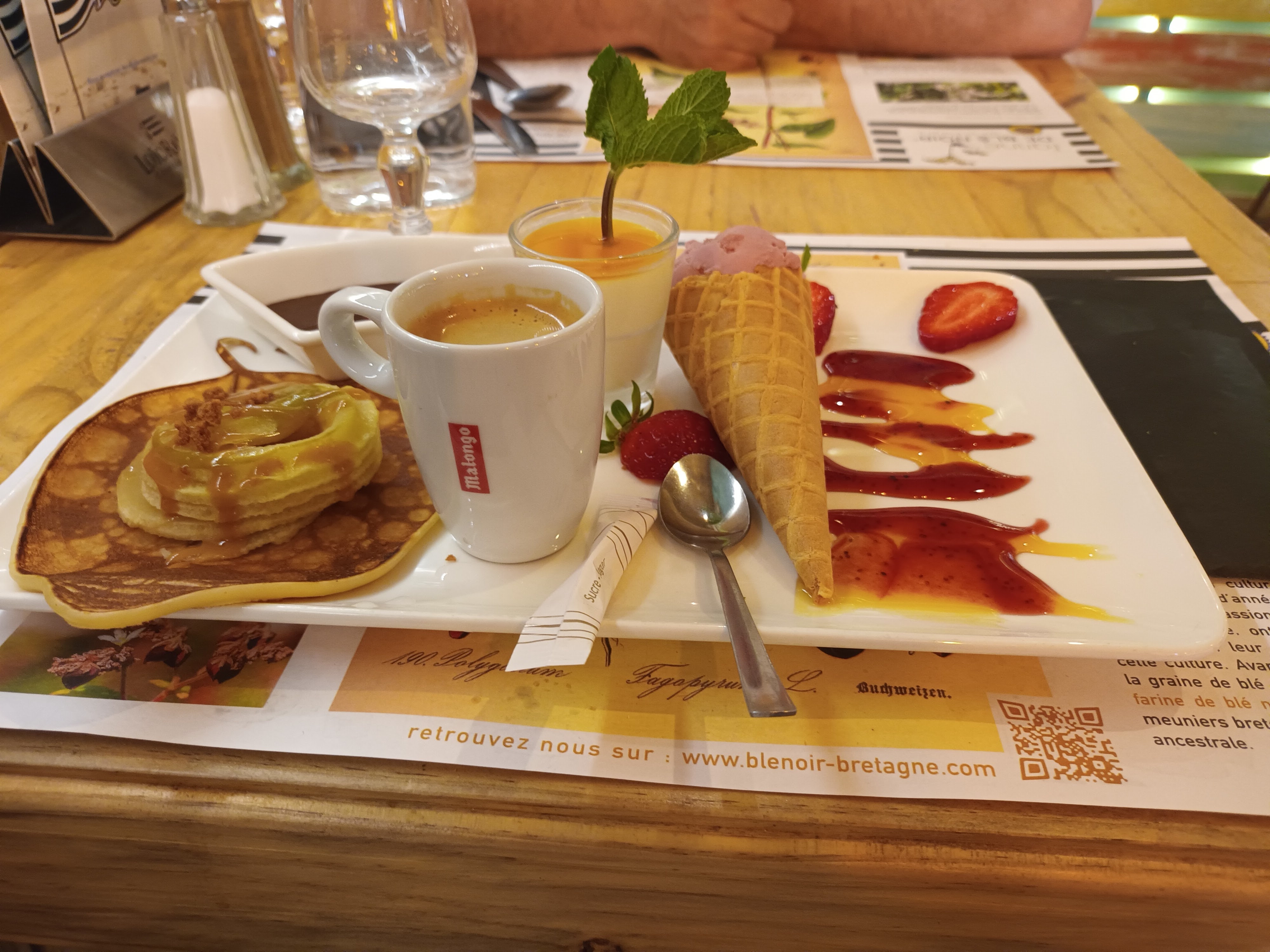 Très bon accueil , Très bon et beau plat Moules frites aux roques fort Et un « breitz burger » excellent Pour finir une glace tagada et un onctueux café gourmand (9€50 mais il vaux vraiment le coup 😁) Seul petit point négatif : service un peu long Je conseil de réserver 🤗