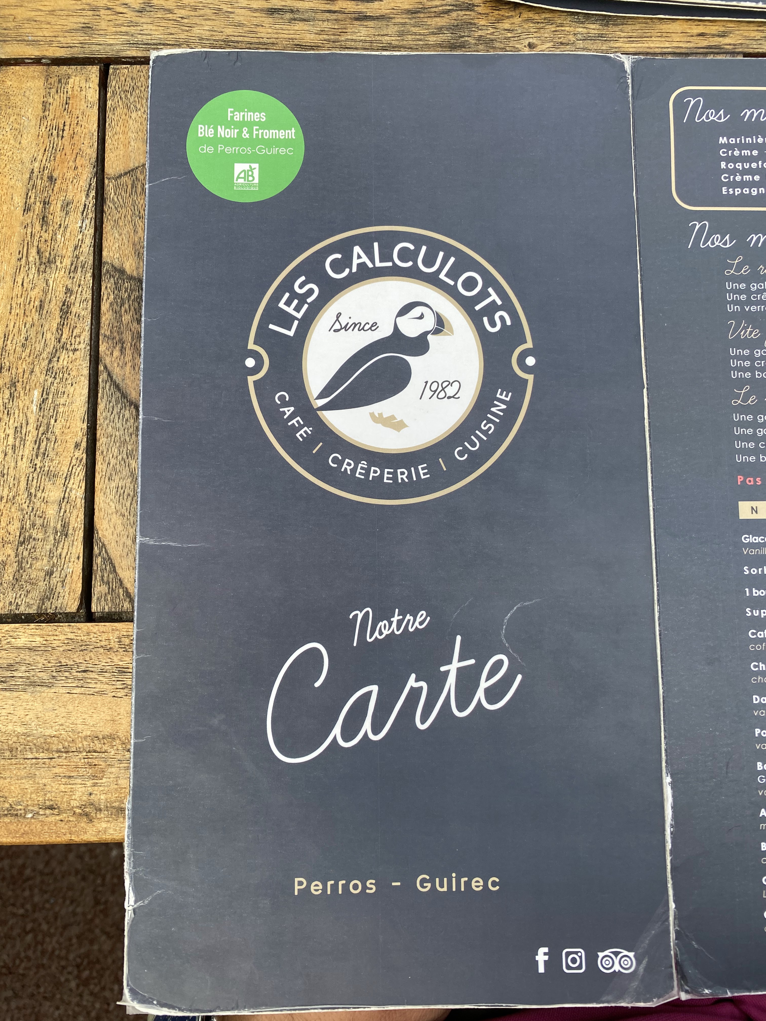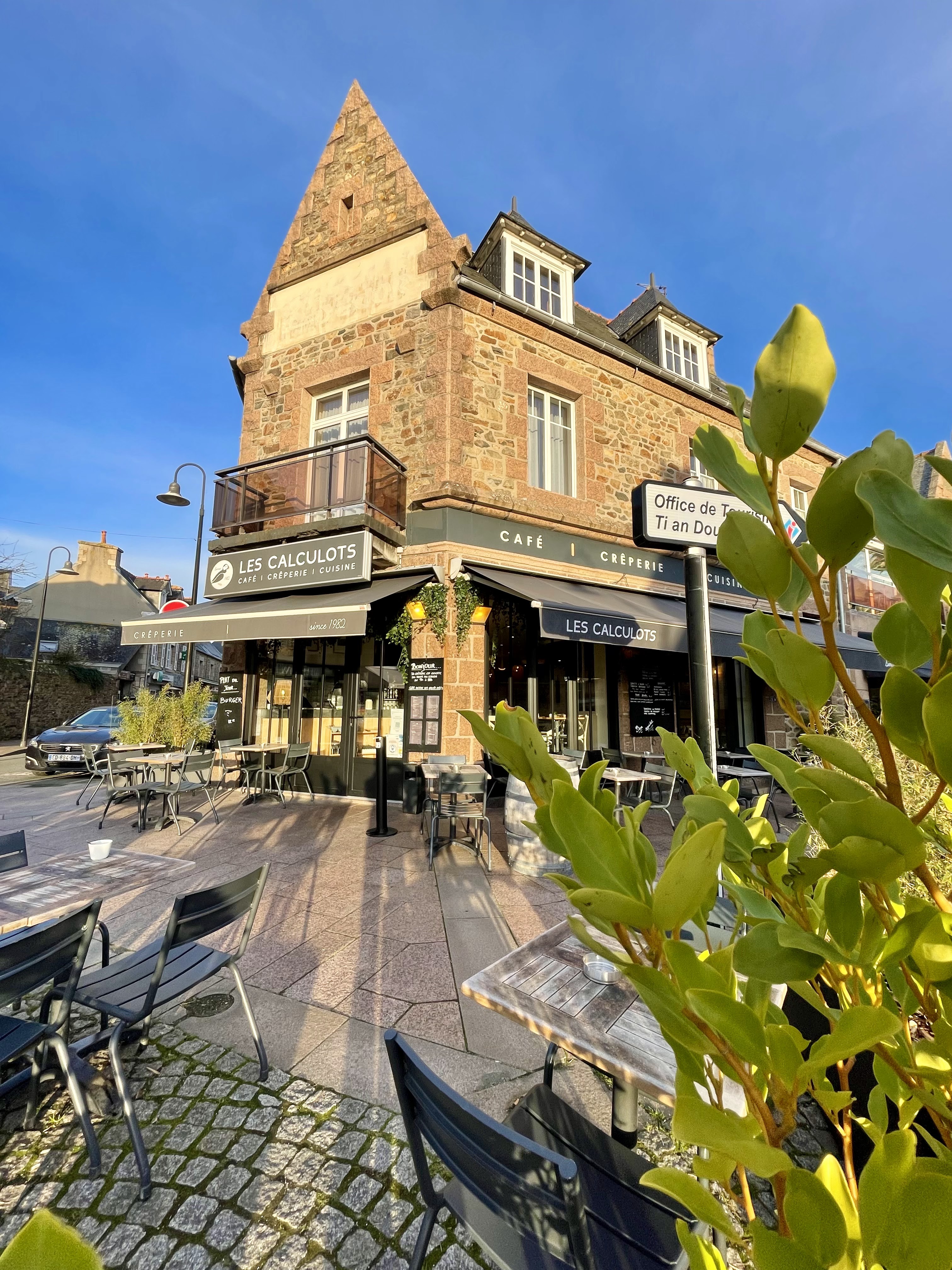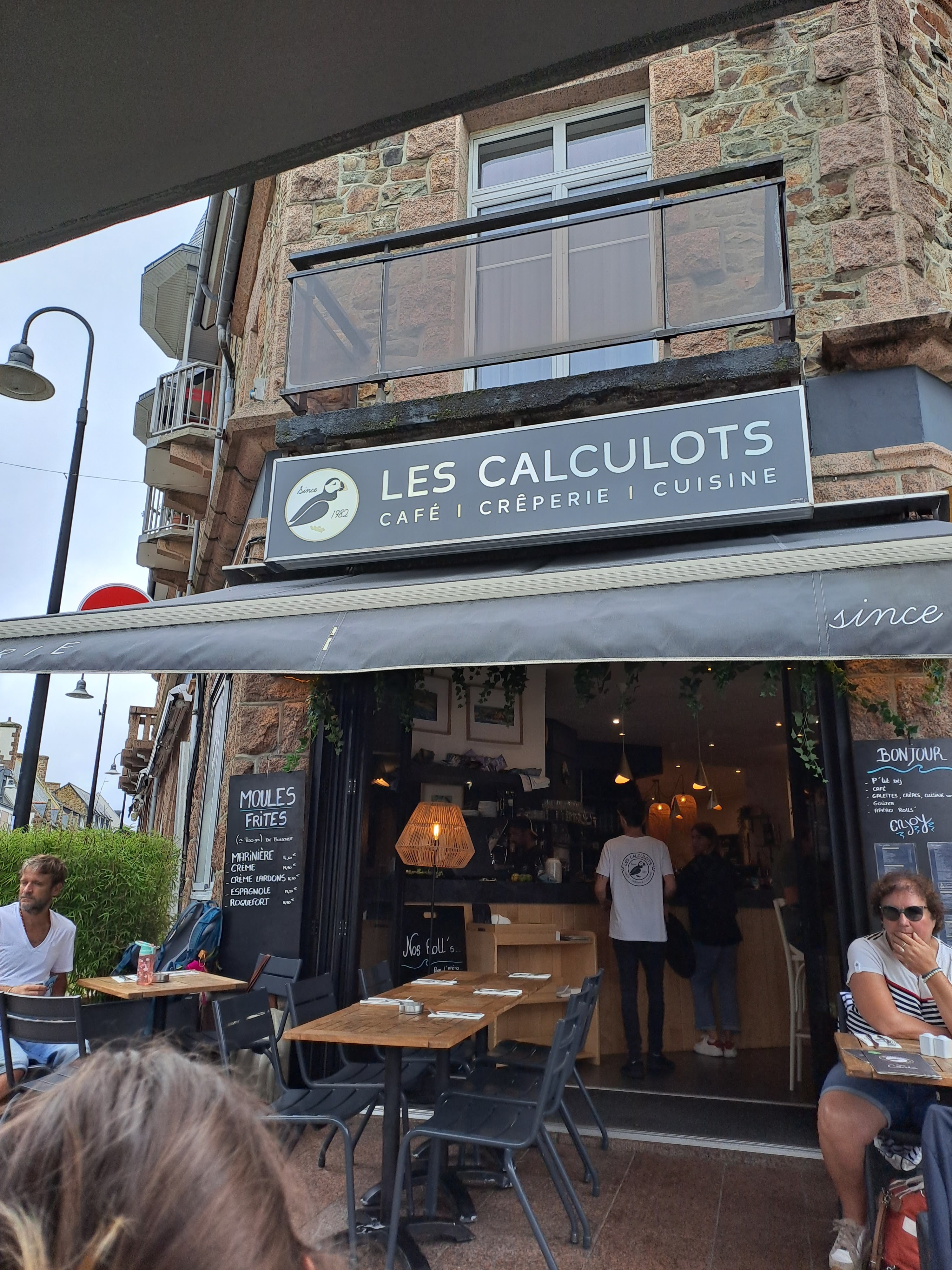 Nous ne sommes pas allés à la crêperies des Flots, probablement la plus réputée de Perros-Guirec, mais à celle des Calculots. Pourquoi ? Principalement car le choix des galettes végétariennes y est plus étendu : à la provençale, fondue de poireaux, etc. Et nous avons bien fait, je pense ! Très satisfaits de nos galettes et crêpes. (La poire caramel glace vanille était peut-être légèrement en deçà.) Très bon ! On y est même retournés deux jours plus tard pour deux crêpes Nutella et un chocolat chaud pour le goûter car c'est ouvert également l'après-midi :) Bref, recommandé ! En plus, elle est en plein centre et le lieu est chouette.