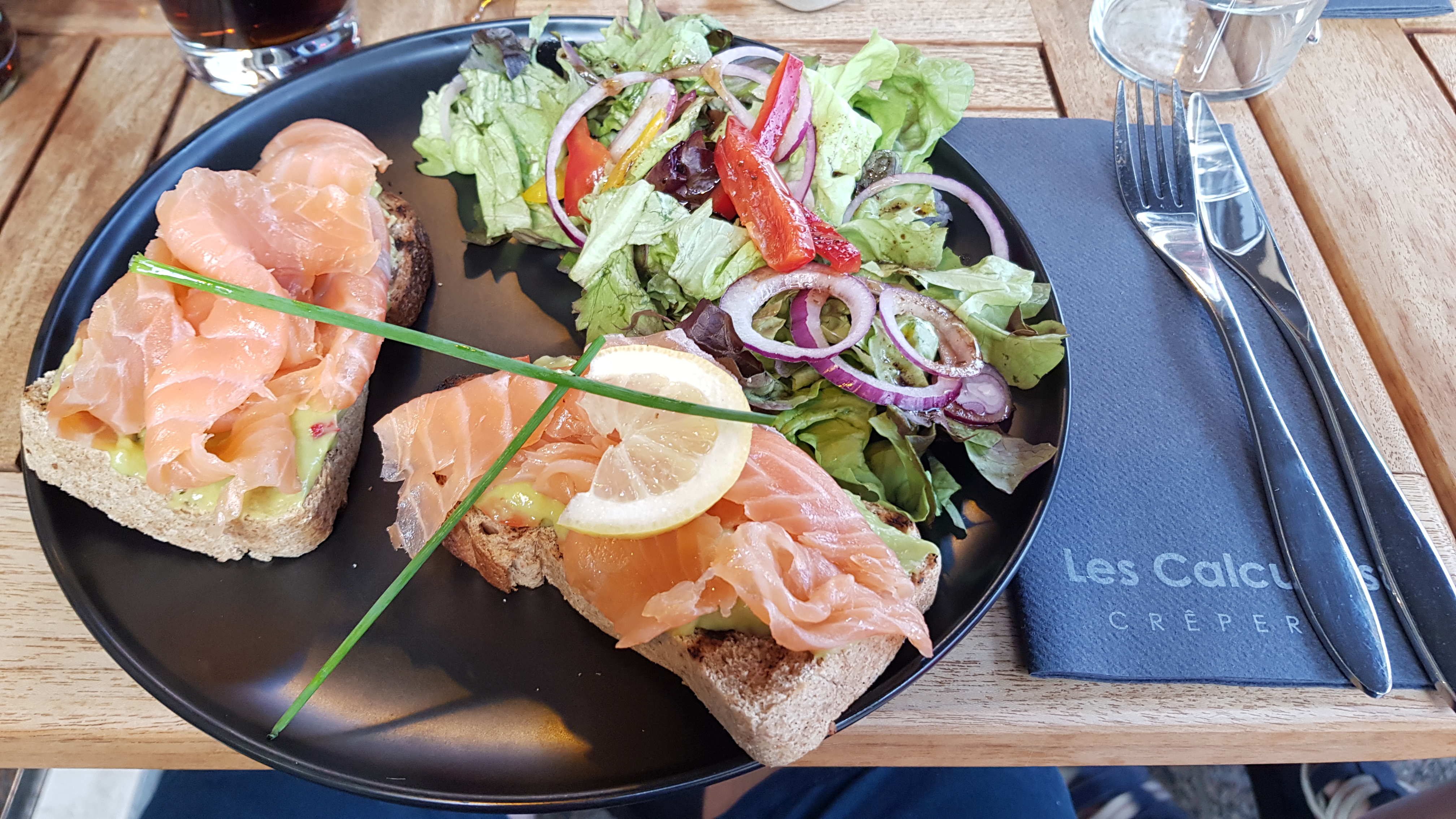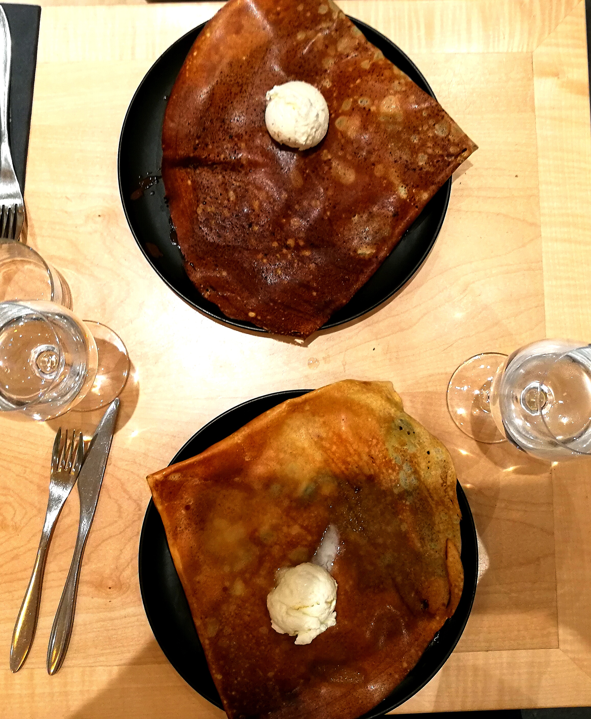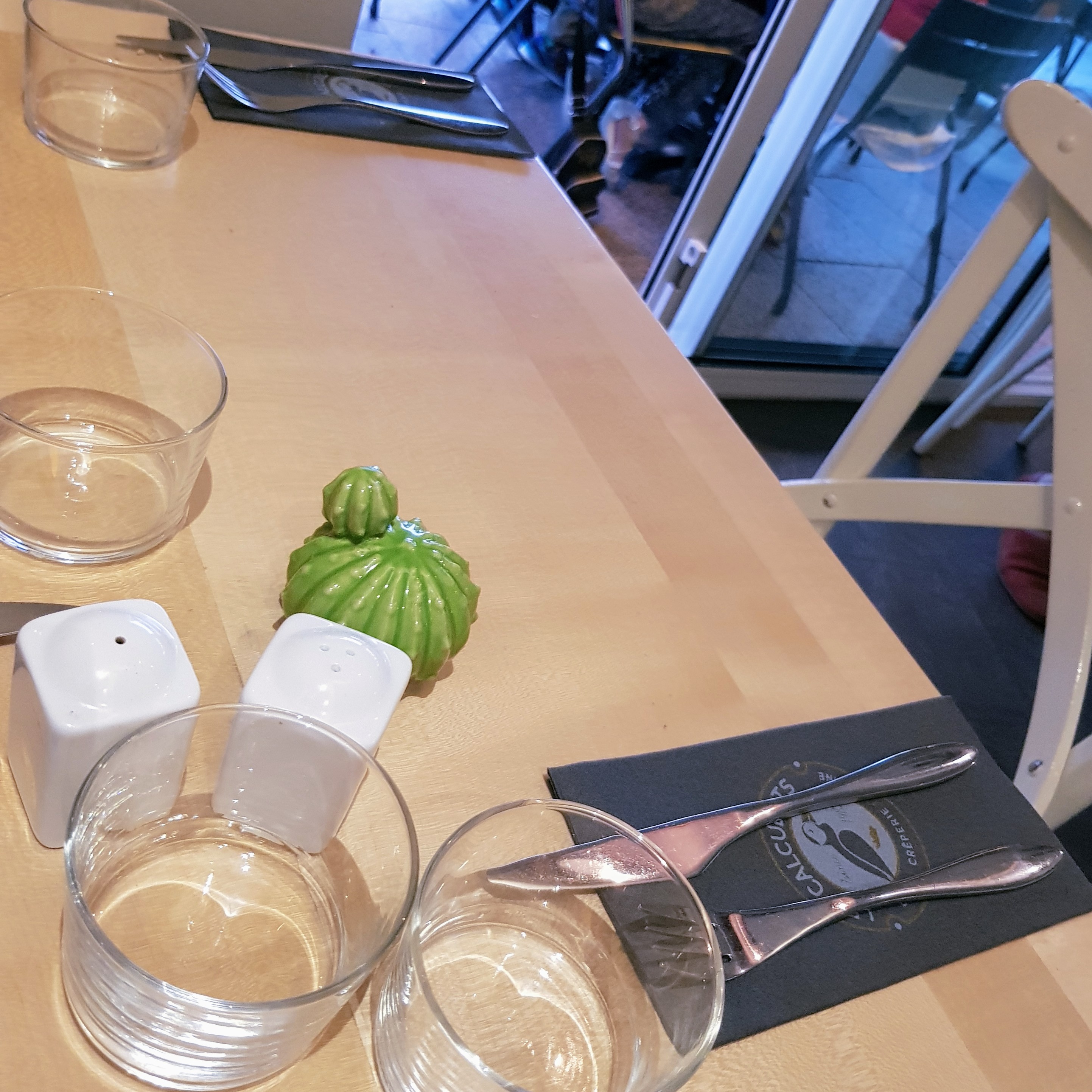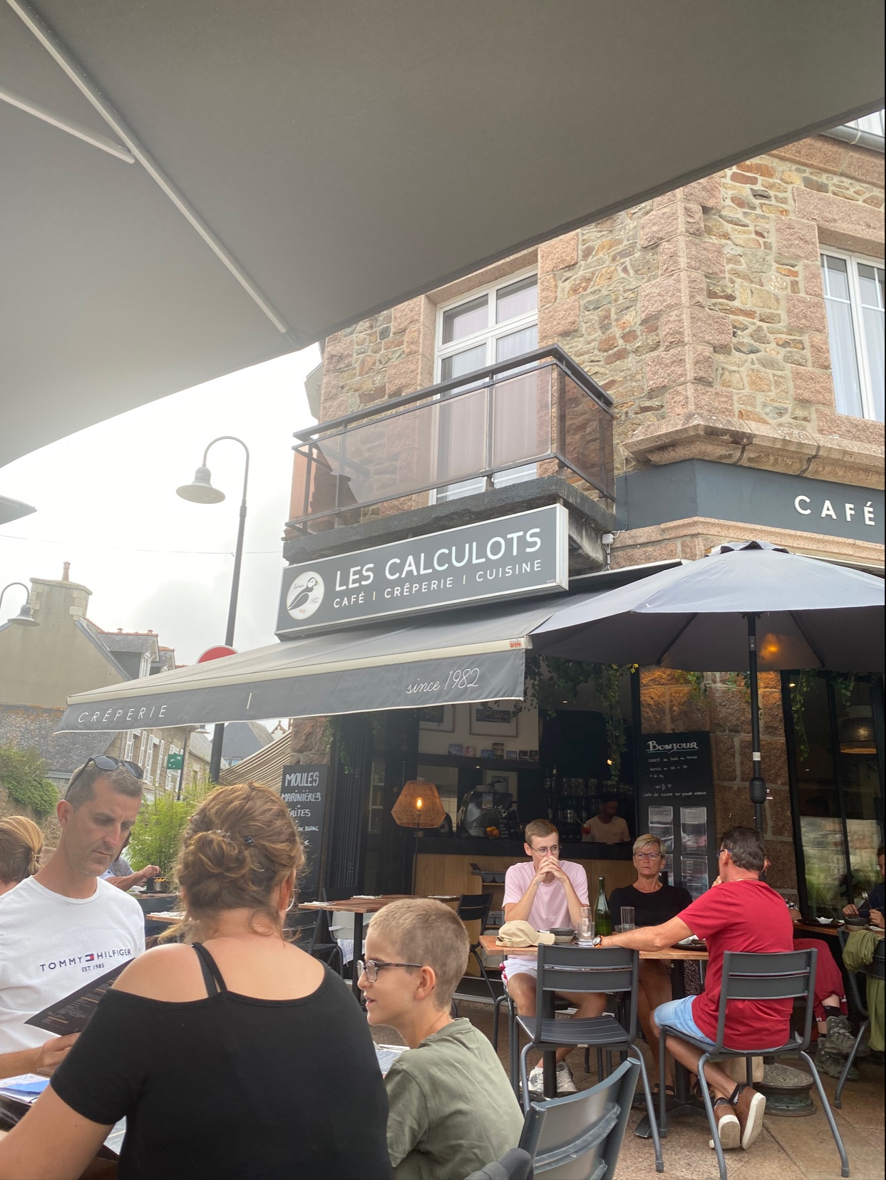 Nous ne sommes pas allés à la crêperies des Flots, probablement la plus réputée de Perros-Guirec, mais à celle des Calculots. Pourquoi ? Principalement car le choix des galettes végétariennes y est plus étendu : à la provençale, fondue de poireaux, etc. Et nous avons bien fait, je pense ! Très satisfaits de nos galettes et crêpes. (La poire caramel glace vanille était peut-être légèrement en deçà.) Très bon ! On y est même retournés deux jours plus tard pour deux crêpes Nutella et un chocolat chaud pour le goûter car c'est ouvert également l'après-midi :) Bref, recommandé ! En plus, elle est en plein centre et le lieu est chouette.